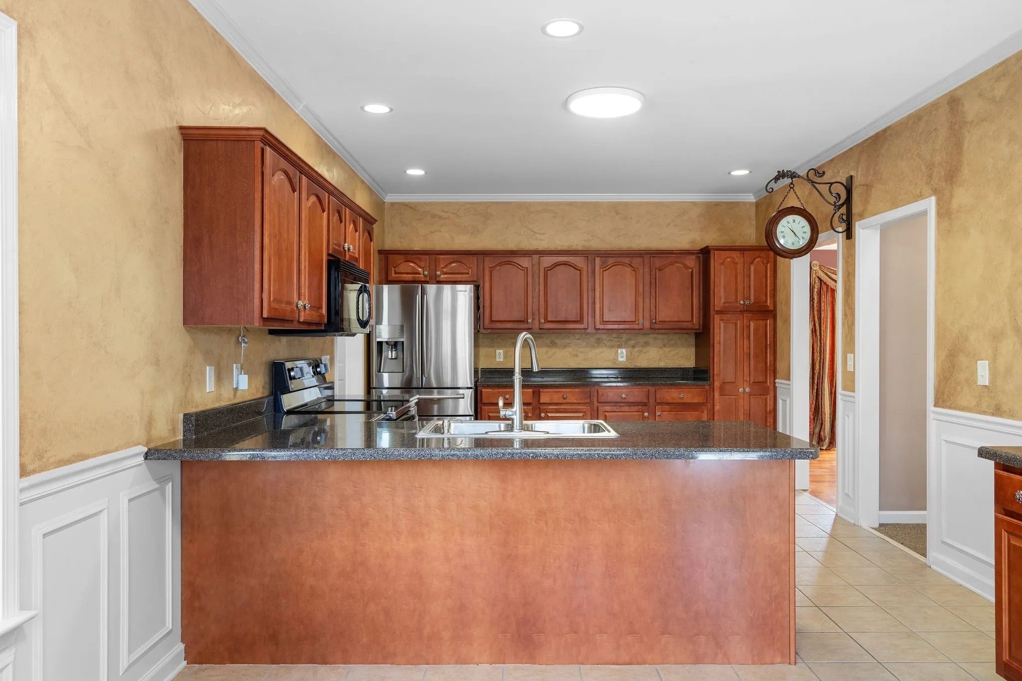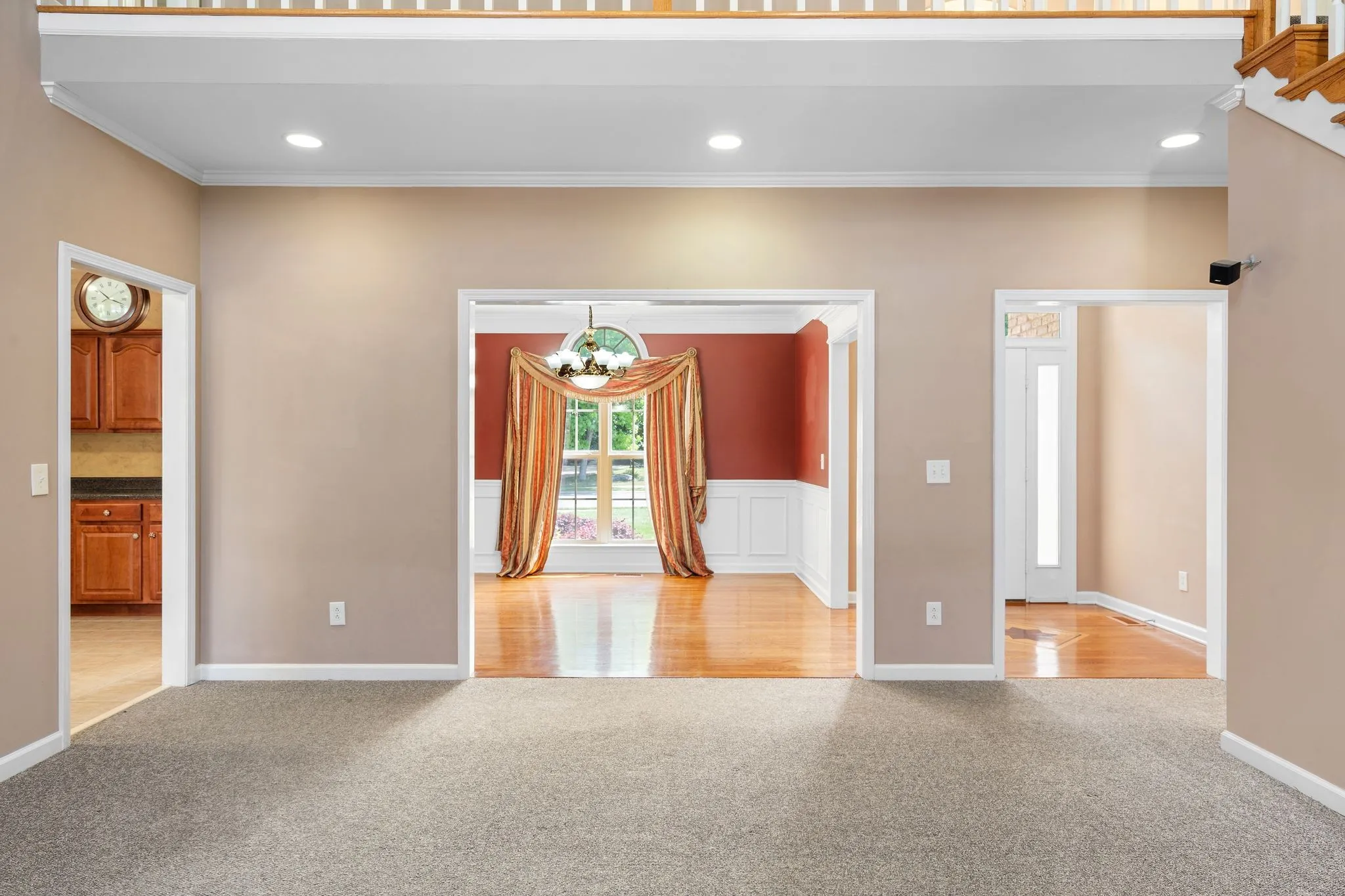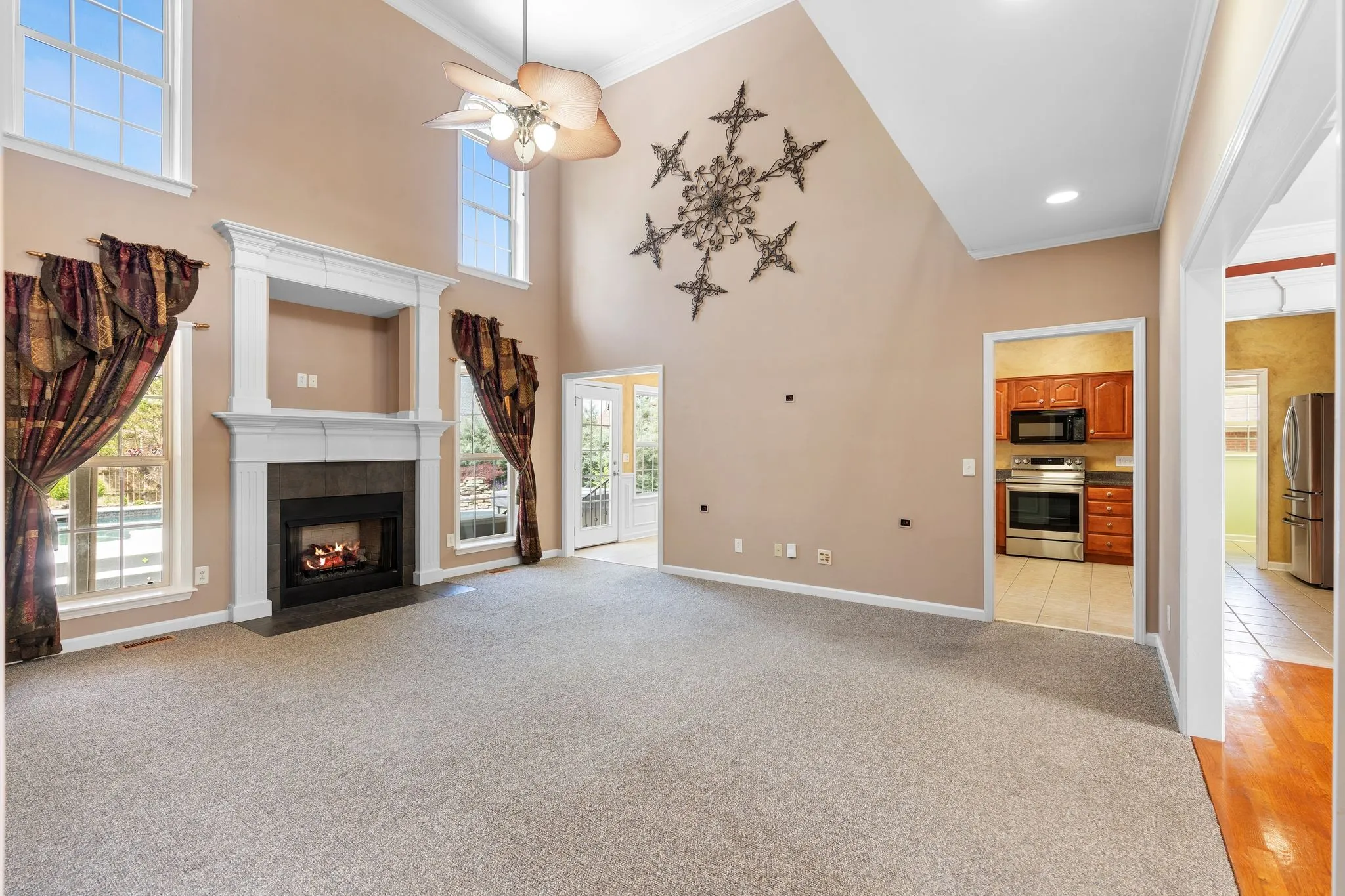 A welcoming entry leads into a spacious living room that flows seamlessly into the kitchen, featuring vaulted ceilings, a gas fireplace with classic white mantel, and abundant natural light throughout. The open kitchen provides generous cabinet storage, ample counter space, a movable island for meal prep and gathering, and convenient access to the pantry and laundry area with utility sink. Hardwood flooring enhances the foyer and dining space, complemented thoughtful wainscoting detail.