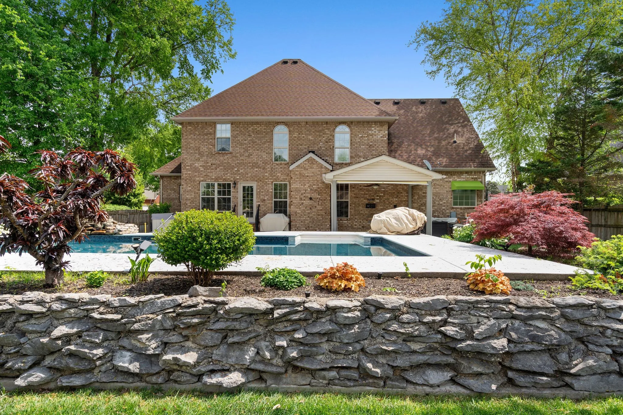 Outdoor living is highlighted by an in-ground pool with a beautiful water feature, hot tub, generous patio for seating and dining, and a covered outdoor area for relaxing or entertaining. A private outdoor shower with wood surround adds convenience after pool use. Mature landscaping enhances the backyard setting, creating a relaxed outdoor retreat. Full irrigation system!