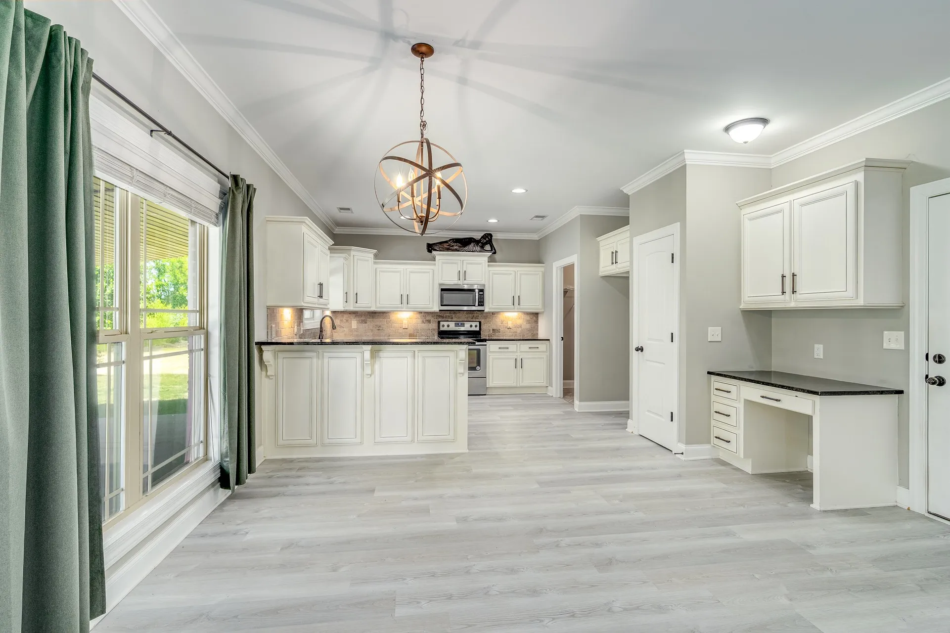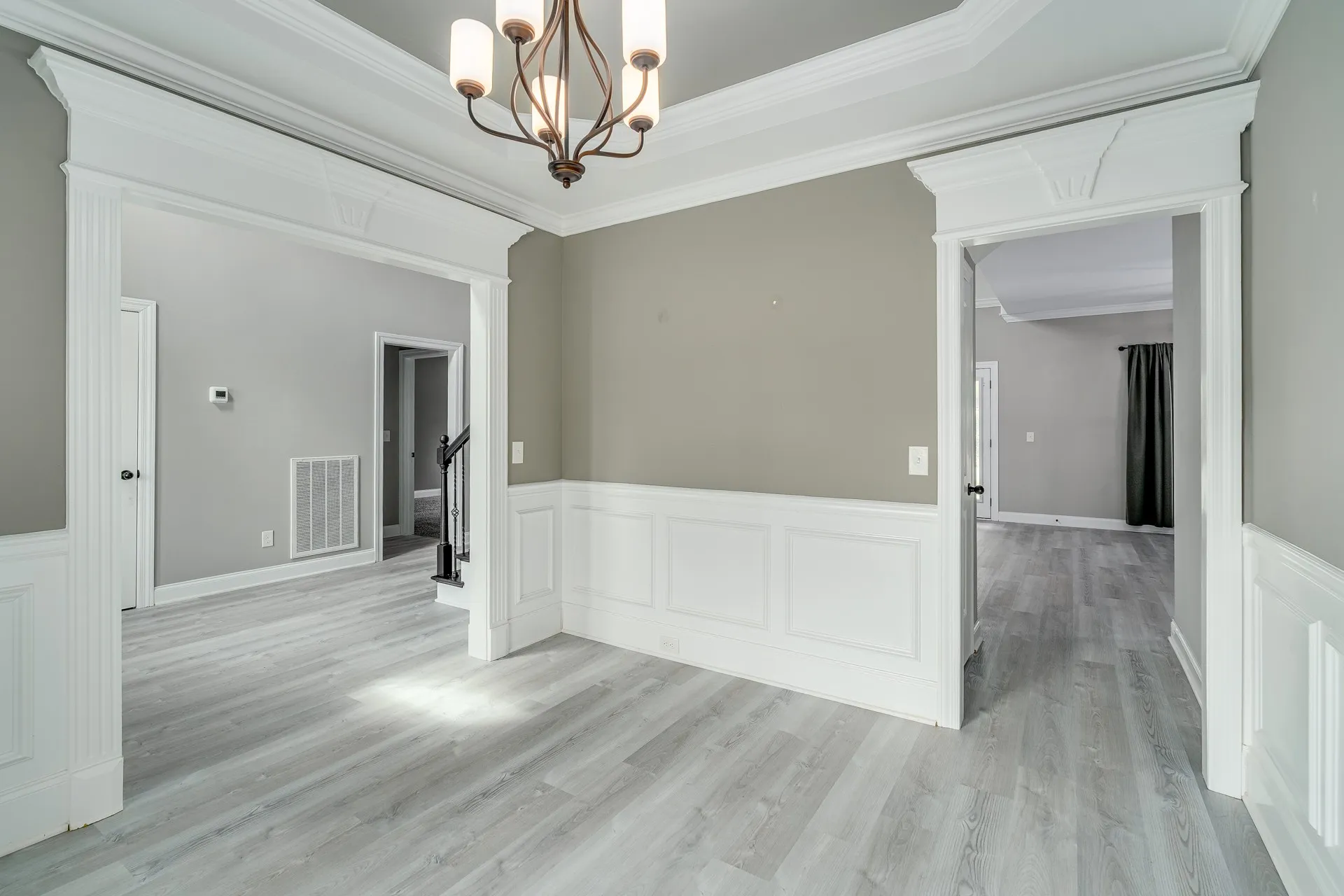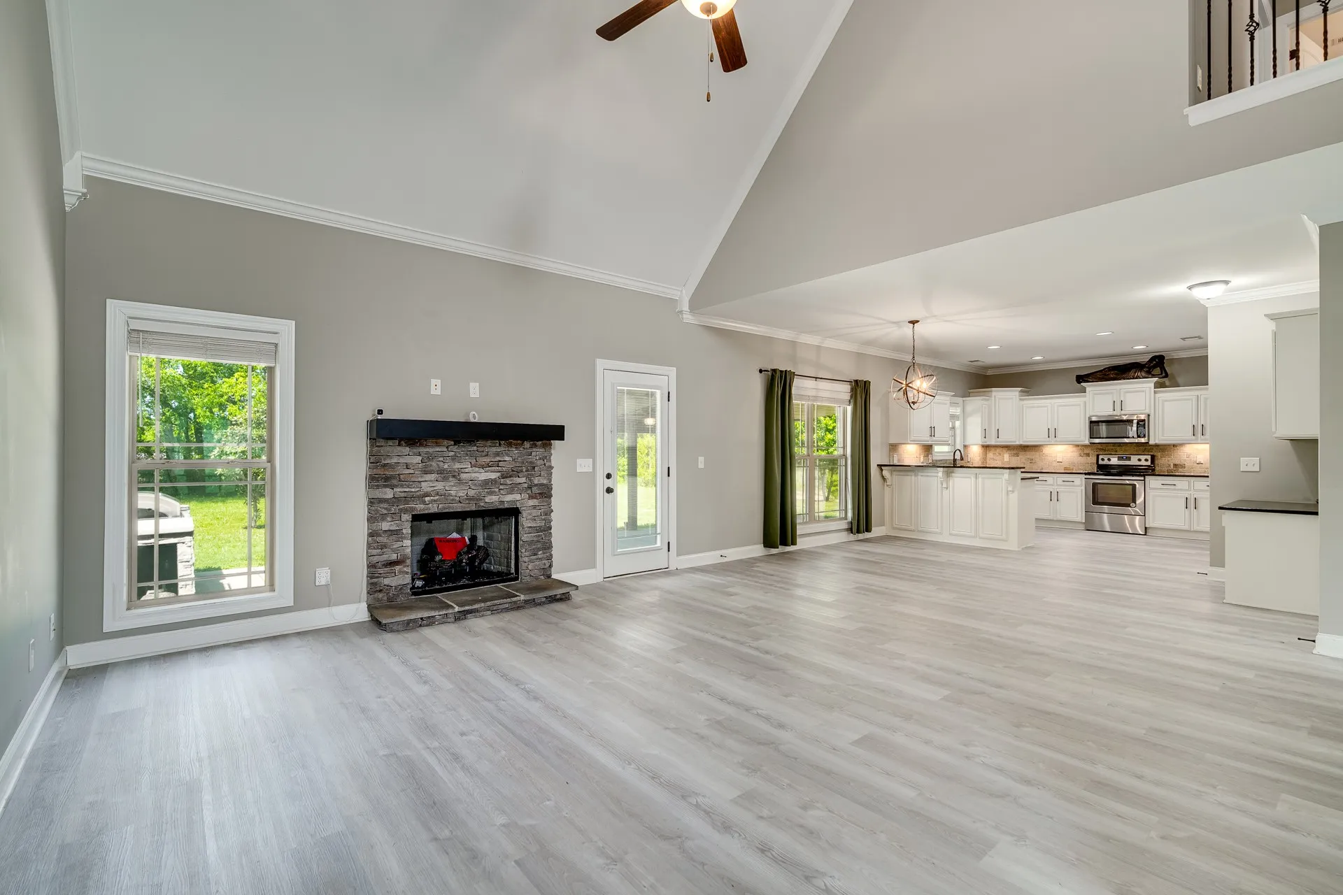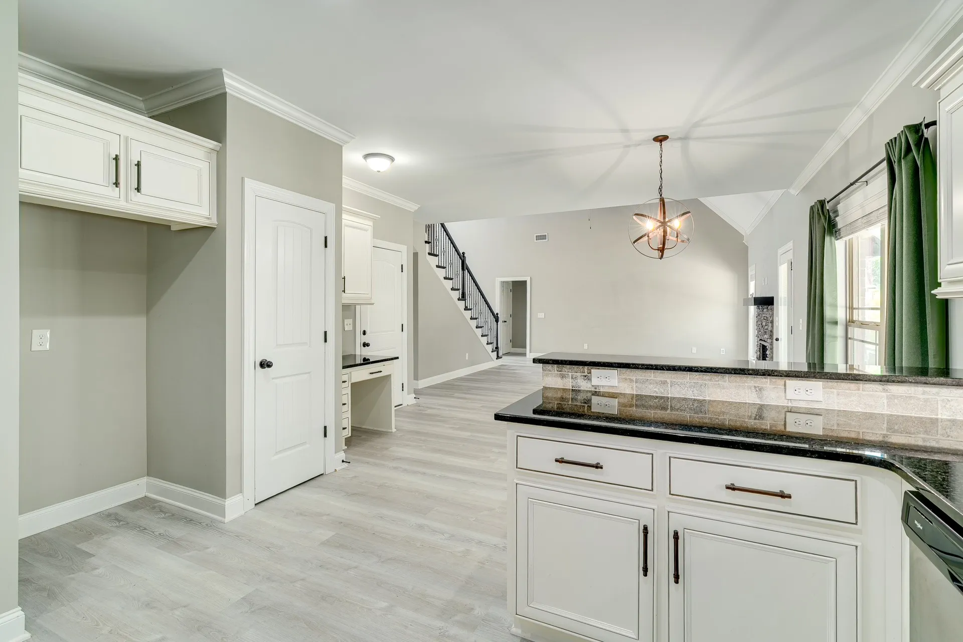 Inside, you’ll find a well-designed floor plan with formal dining just off the entry and an open living space featuring elevated ceiling heights throughout the main level. The main living areas are finished with durable LVP flooring, offering both style and practicality. The kitchen is equipped with granite countertops, stainless steel appliances, and a layout that connects seamlessly to the main living area.