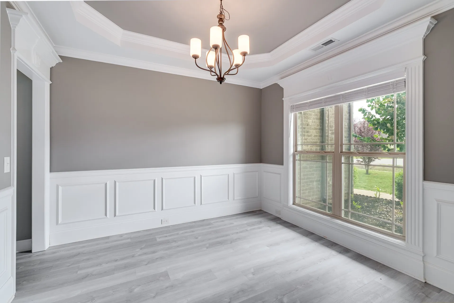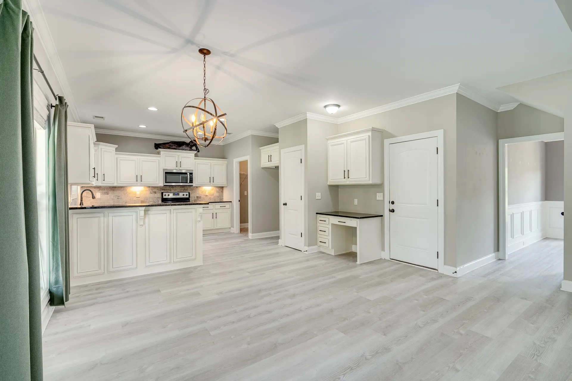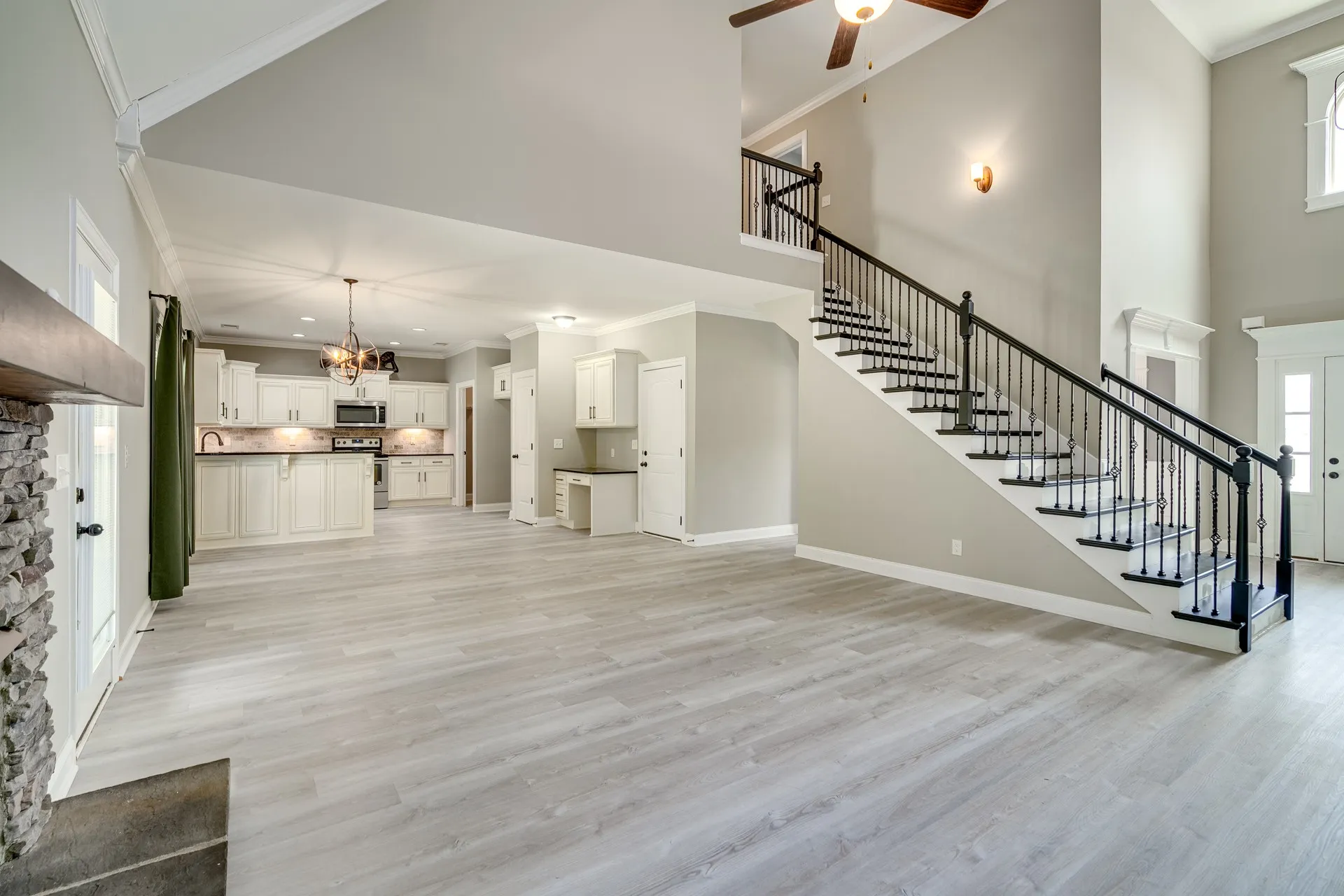 Inside, you’ll find a well-designed floor plan with formal dining just off the entry and an open living space featuring elevated ceiling heights throughout the main level. The main living areas are finished with durable LVP flooring, offering both style and practicality. The kitchen is equipped with granite countertops, stainless steel appliances, and a layout that connects seamlessly to the main living area.