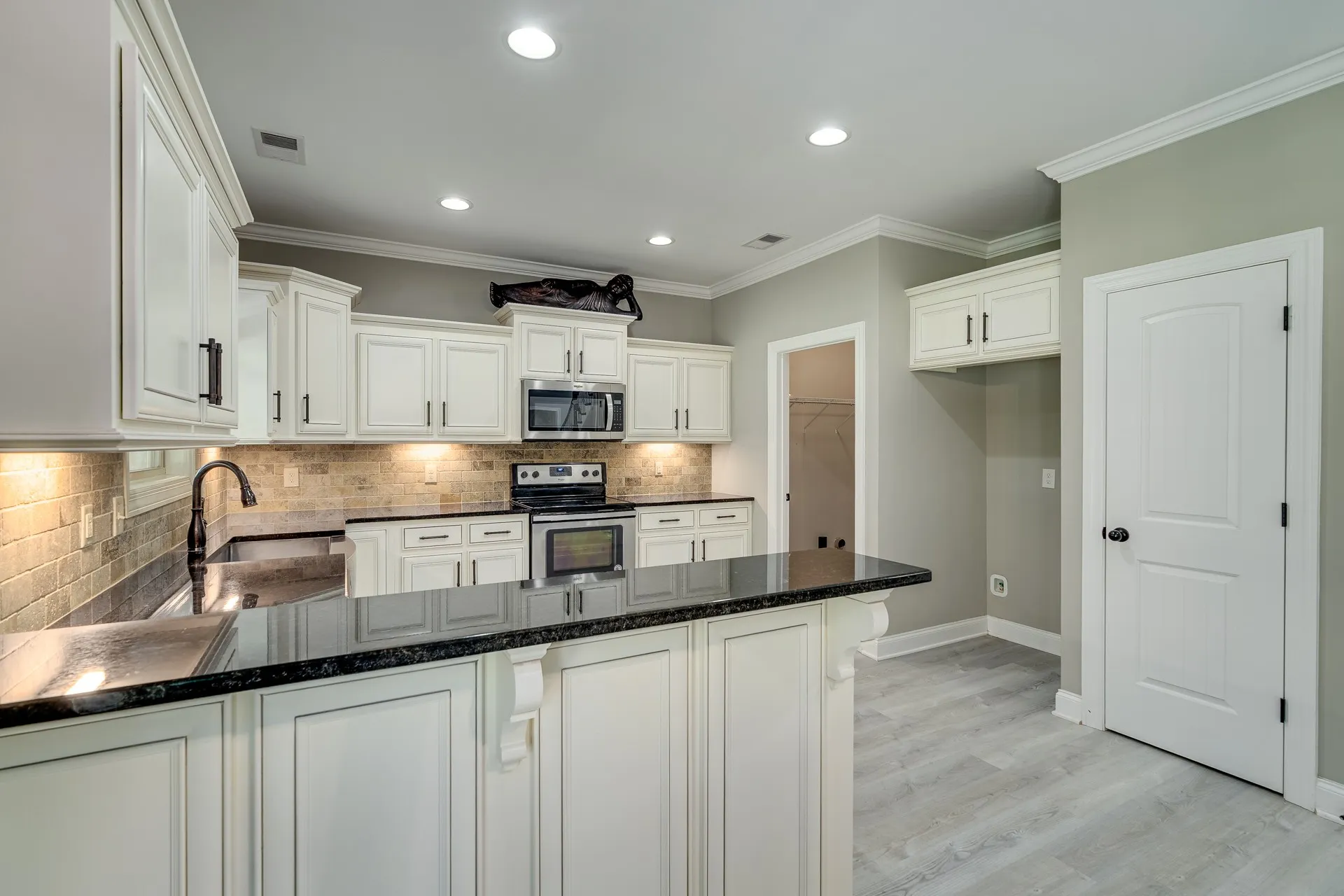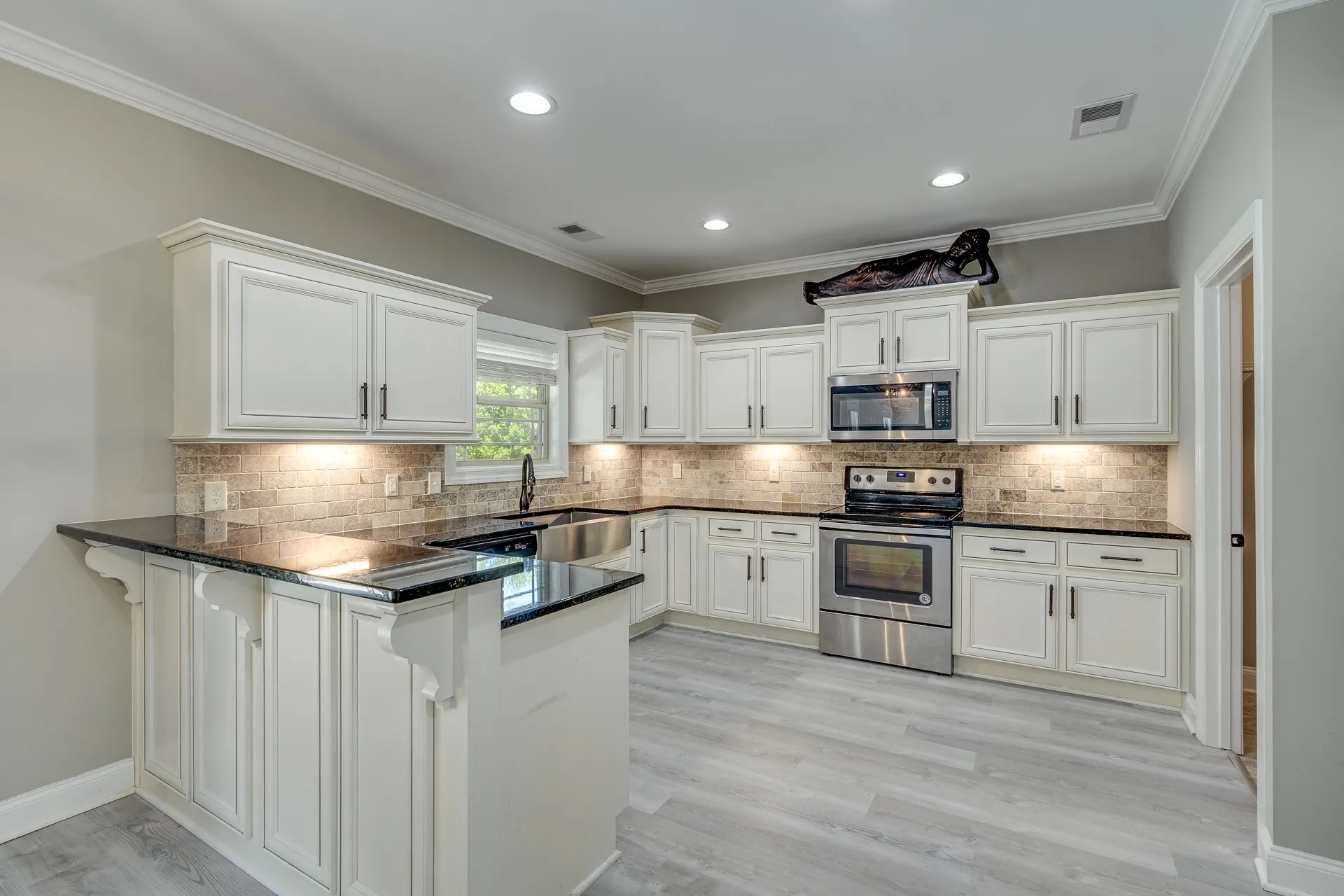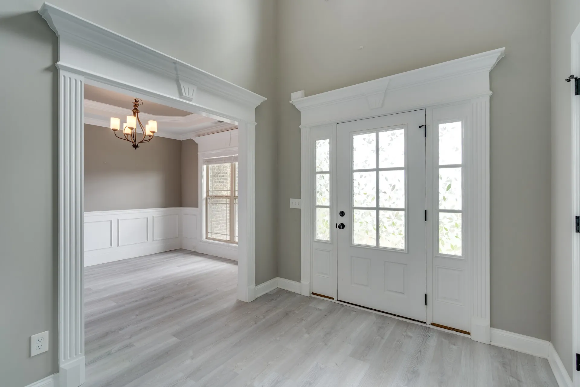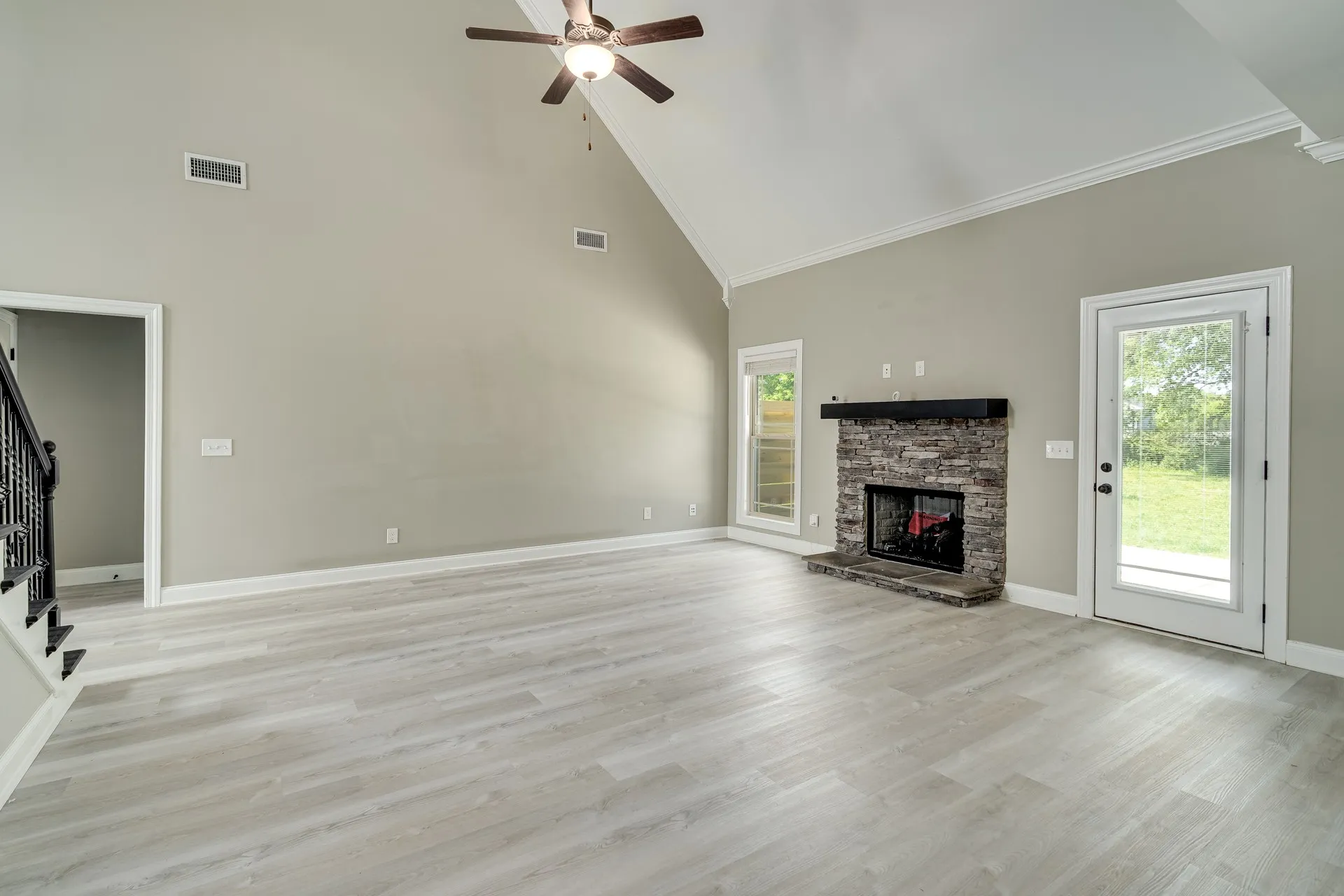 Inside, you’ll find a well-designed floor plan with formal dining just off the entry and an open living space featuring elevated ceiling heights throughout the main level. The main living areas are finished with durable LVP flooring, offering both style and practicality. The kitchen is equipped with granite countertops, stainless steel appliances, and a layout that connects seamlessly to the main living area.