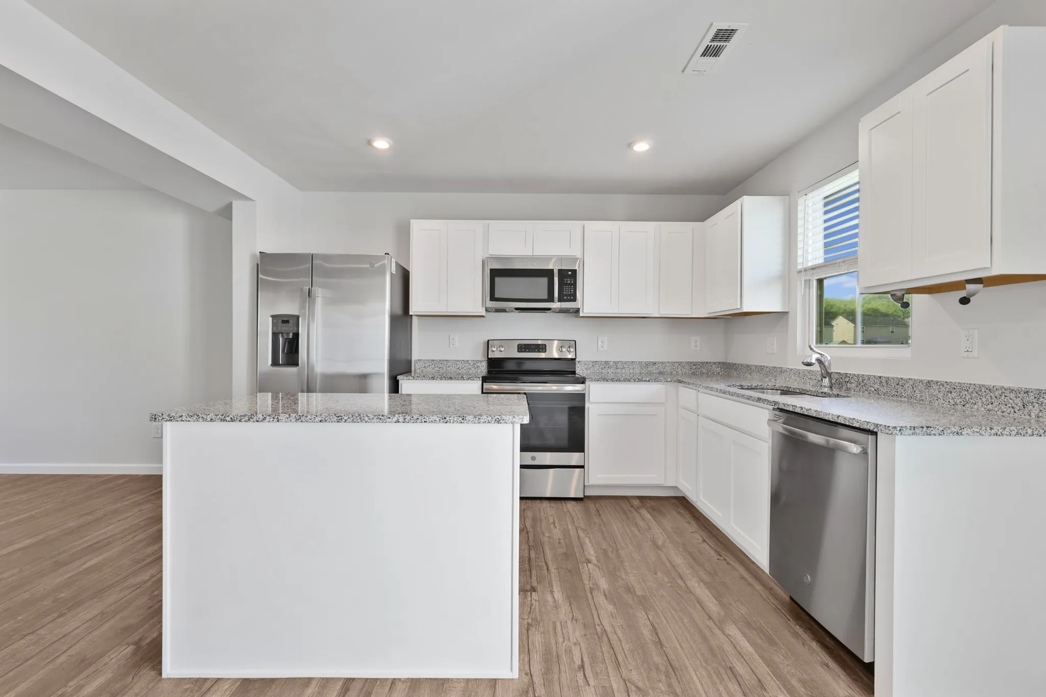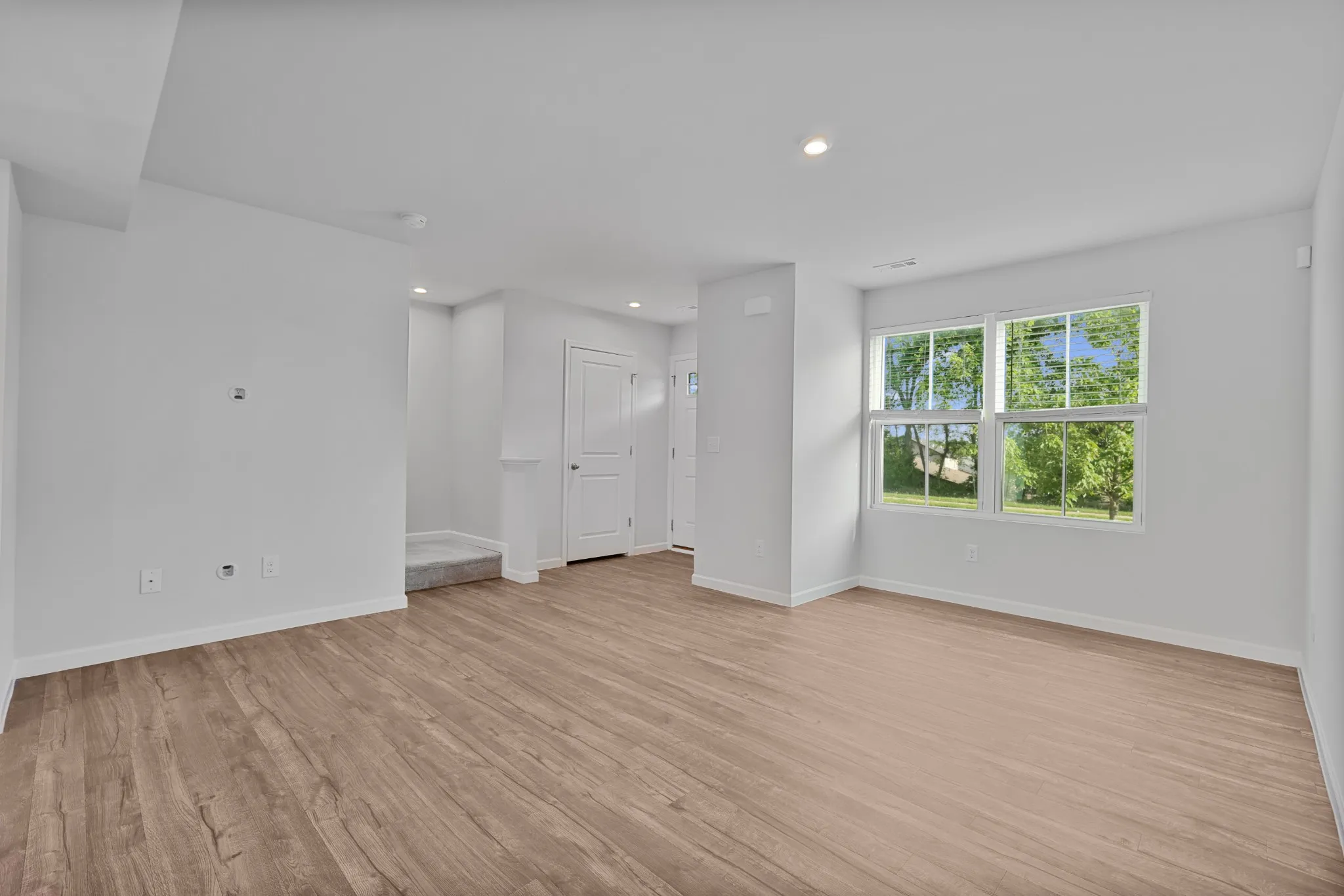 This end-unit townhome offers added privacy with only one shared wall and open common space beside you—creating a quieter, more open feel than interior units. The main level features hard-surface flooring and an easy, functional flow for everyday living.