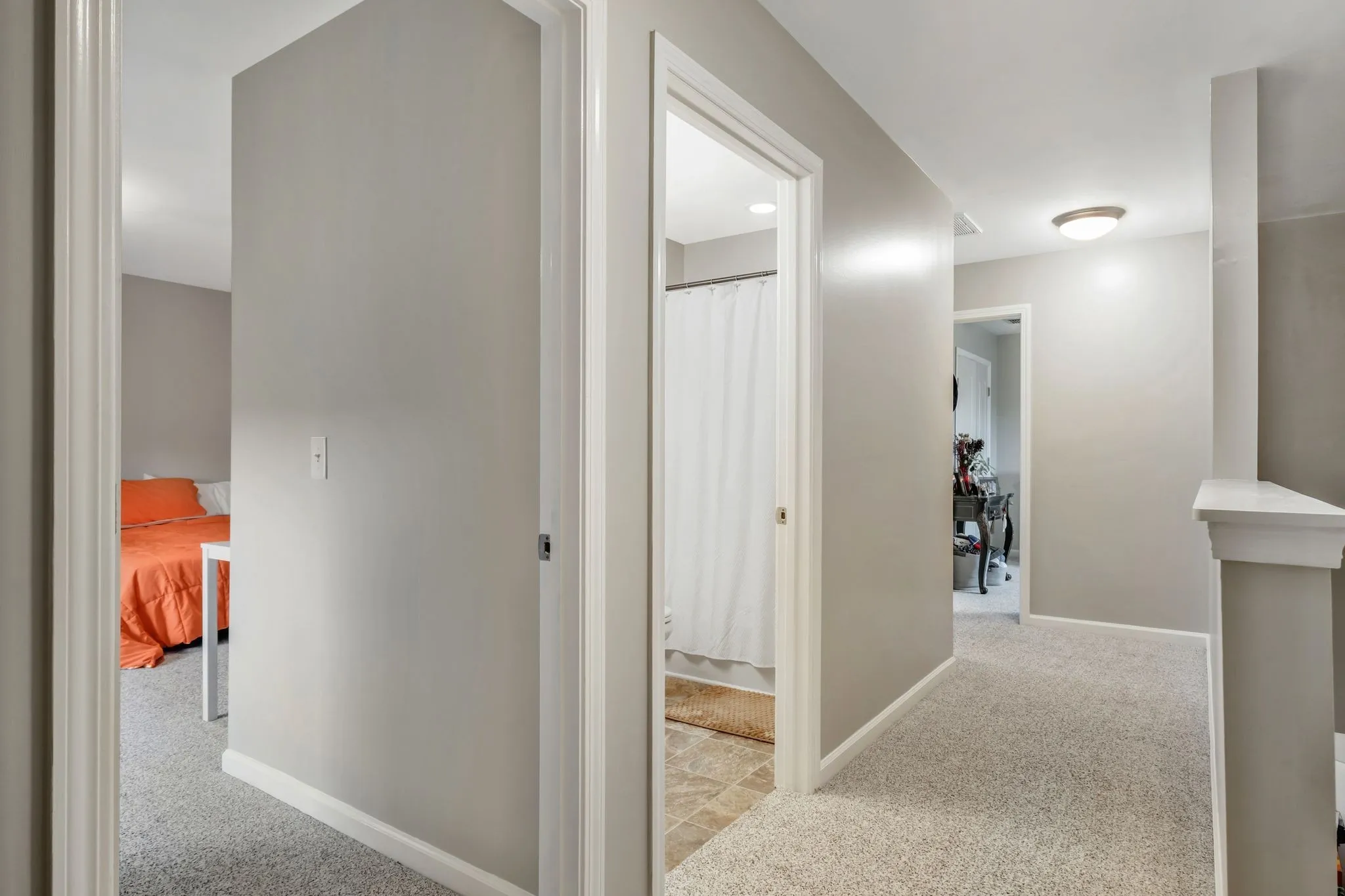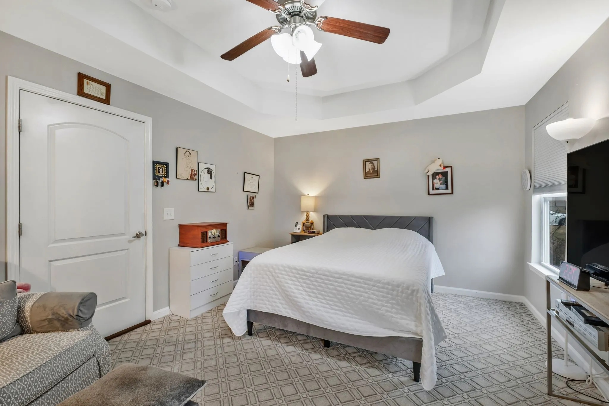 The main-level primary suite includes a tray ceiling, upgraded carpeting, and a spacious en-suite bath with tile flooring, a garden tub, separate shower, double vanities, and a large walk-in closet. Upstairs, you’ll find three additional bedrooms along with a convenient office nook—perfect for work or study.