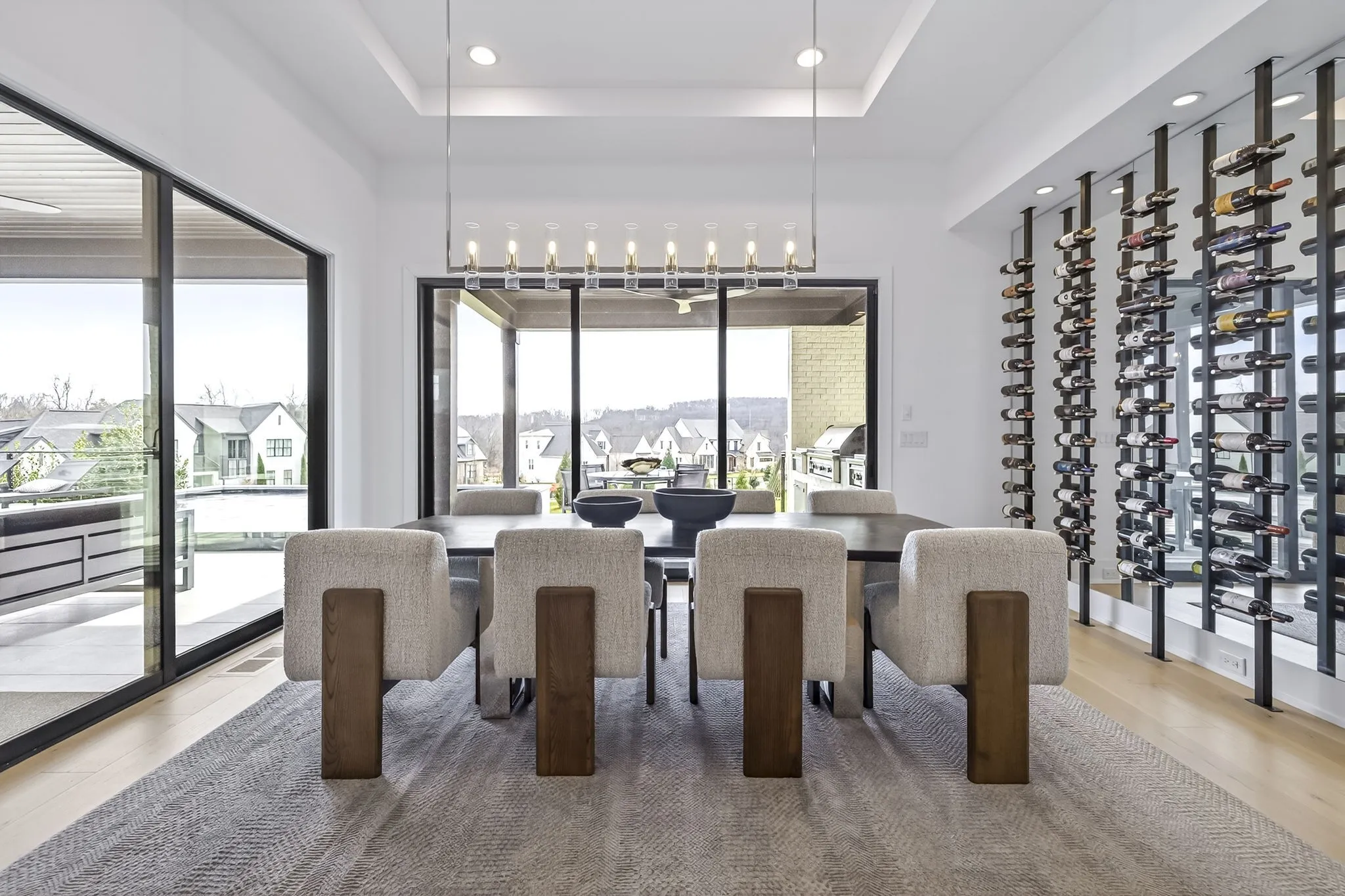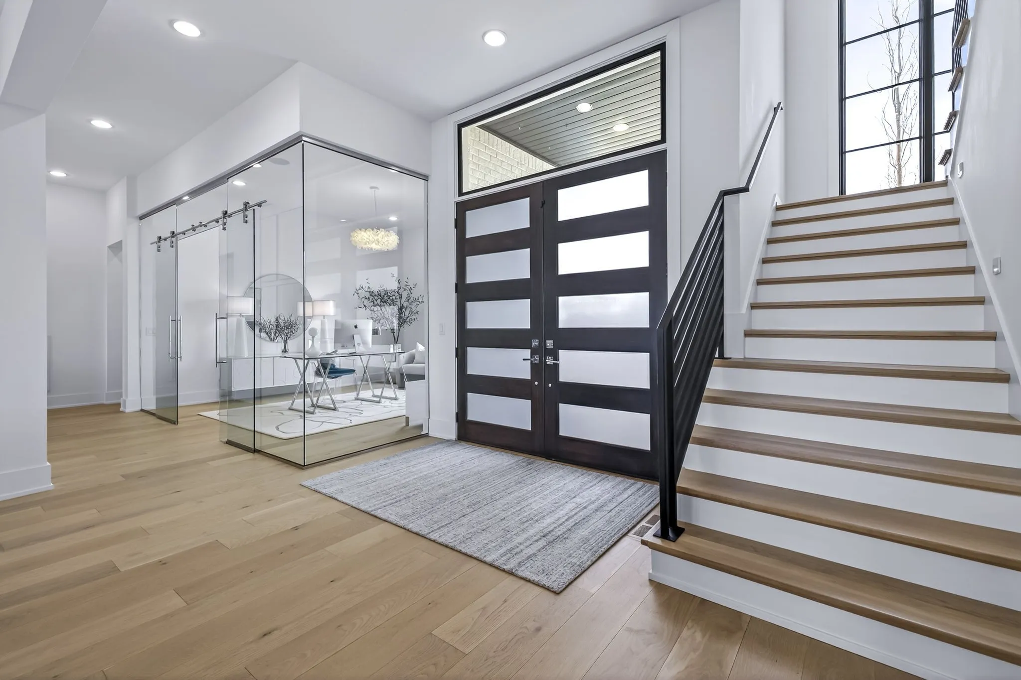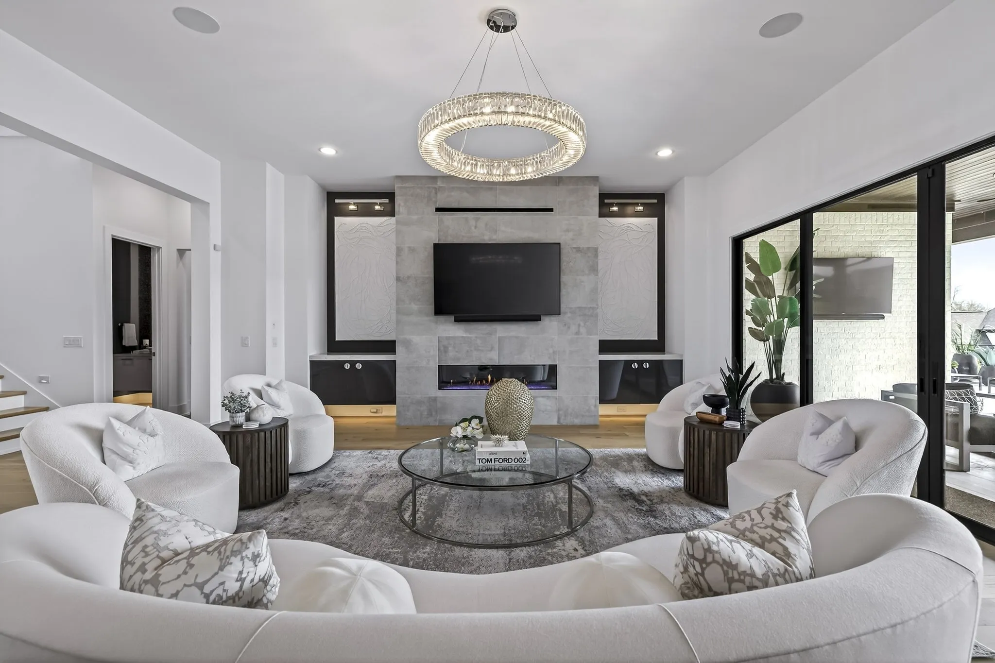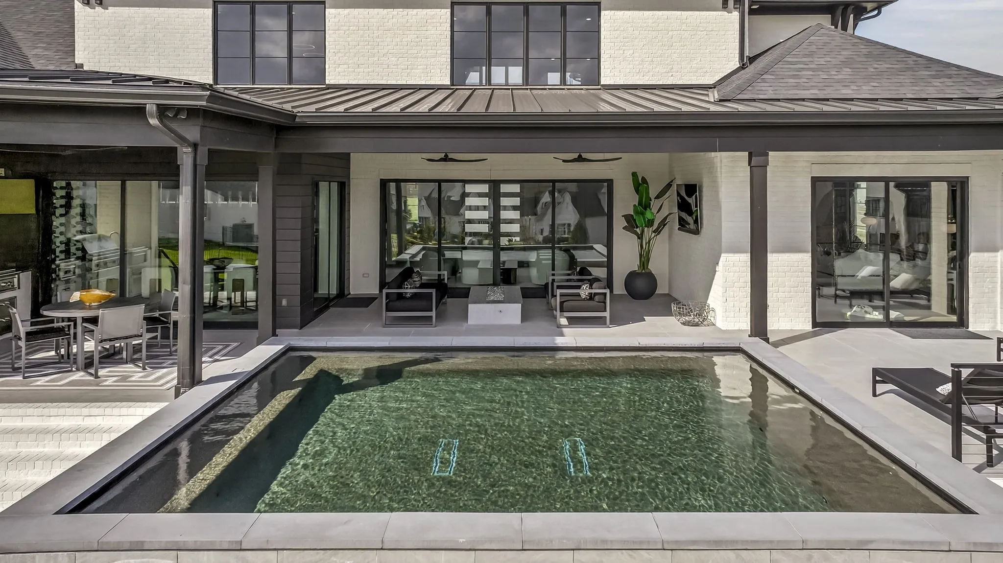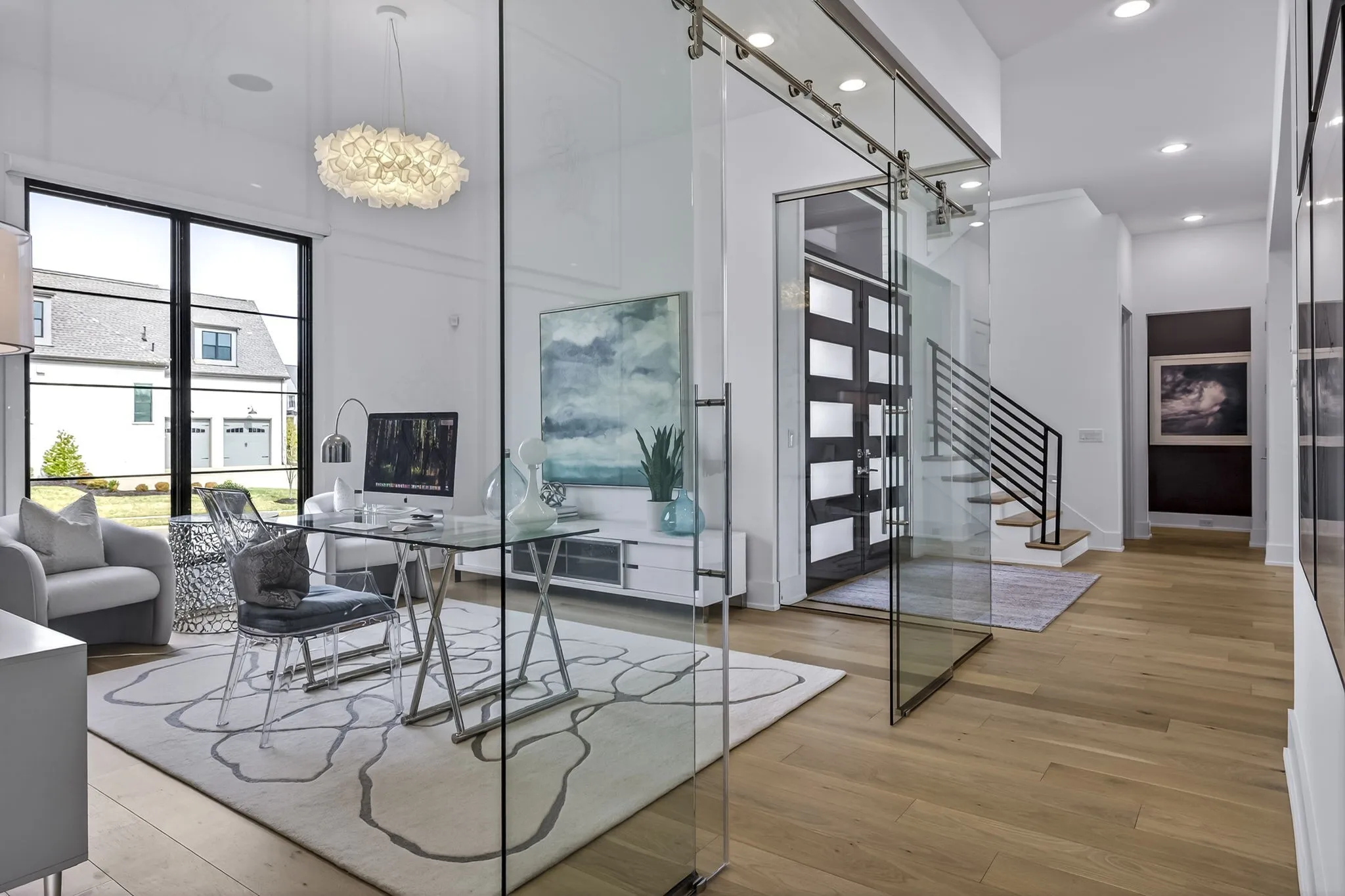 The light-filled, open-concept layout is framed by floor-to-ceiling windows & three walls of 8’ stacking nano doors for seamless indoor-outdoor living. The great room features a sleek linear fireplace w/floating cabinetry, while a glass-walled office creates a private work-from-home space.