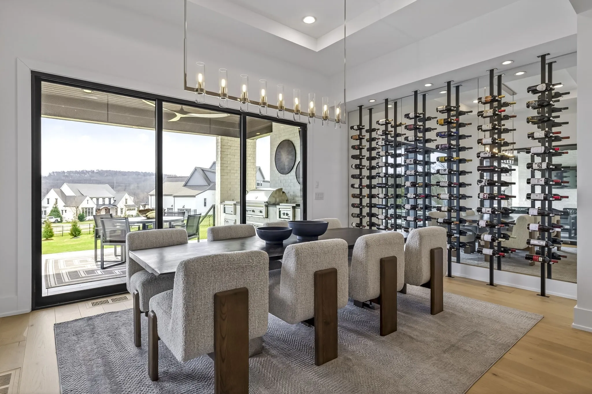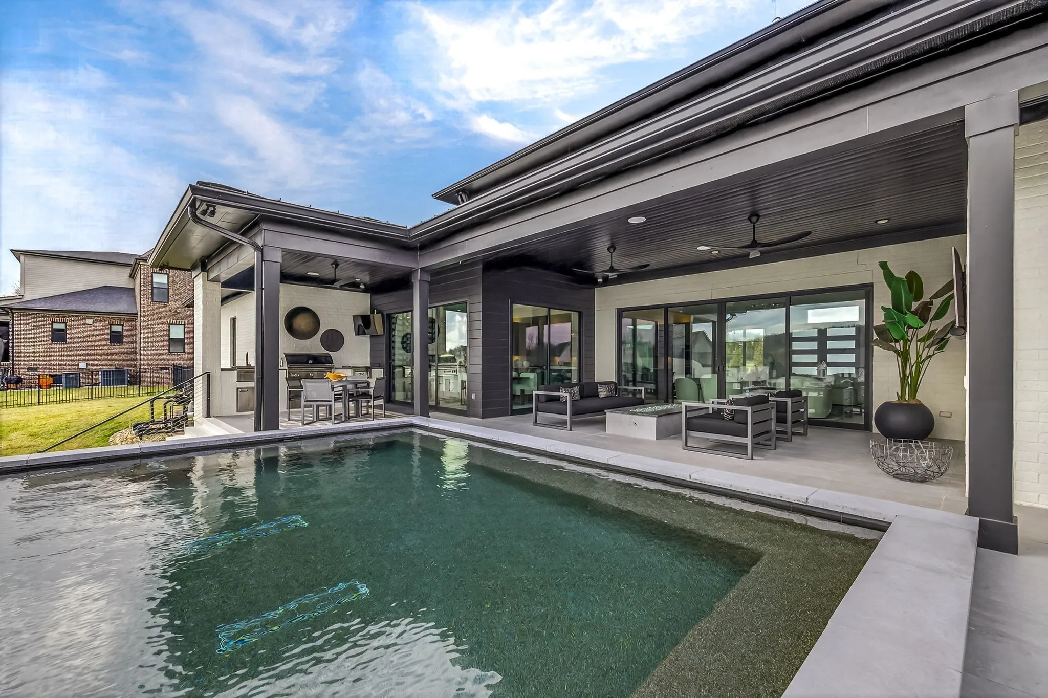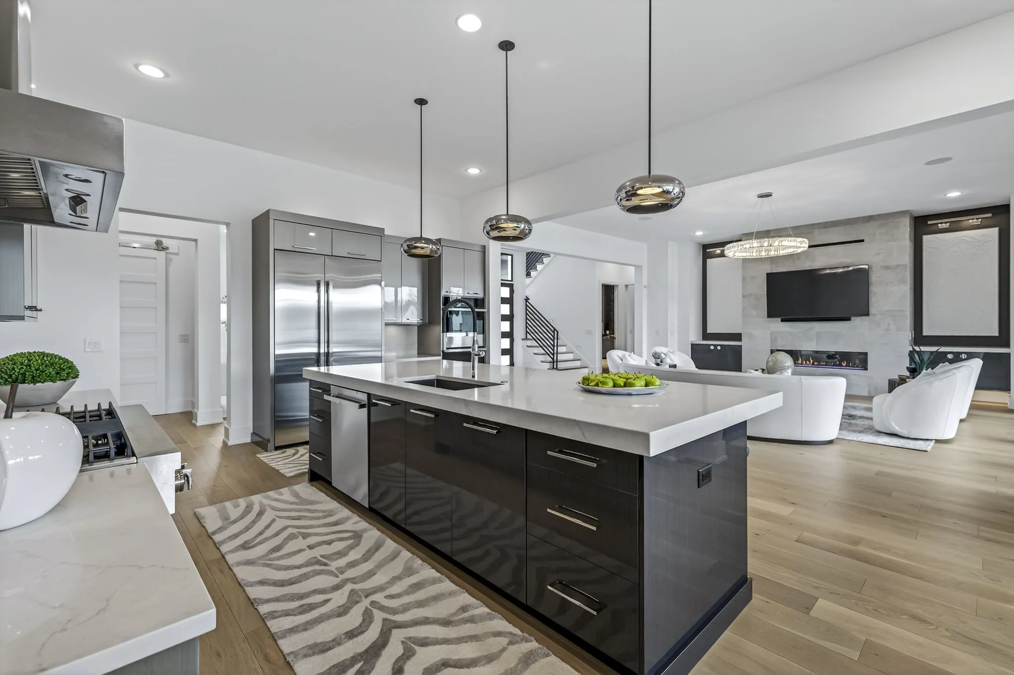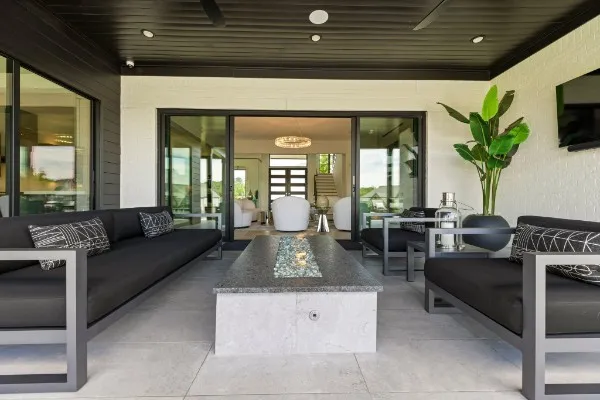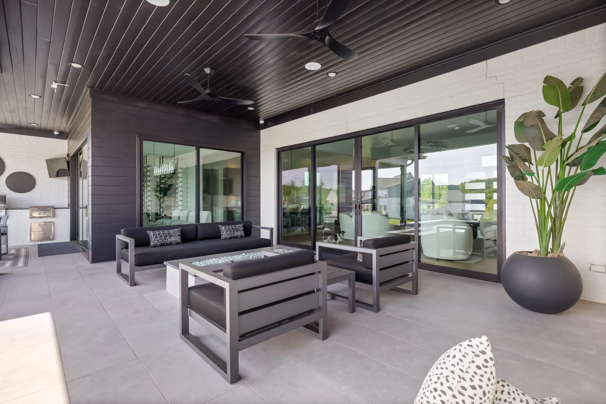 The light-filled, open-concept layout is framed by floor-to-ceiling windows & three walls of 8’ stacking nano doors for seamless indoor-outdoor living. The great room features a sleek linear fireplace w/floating cabinetry, while a glass-walled office creates a private work-from-home space.
