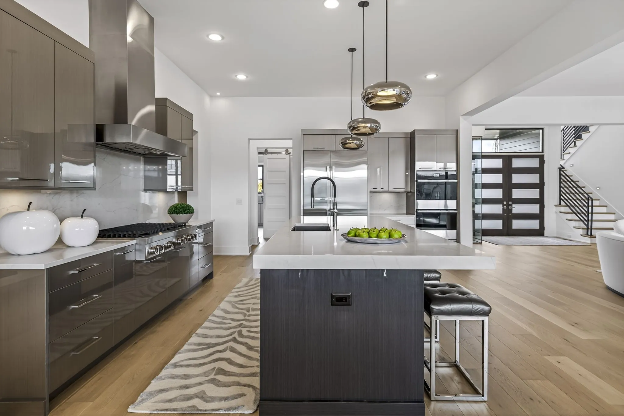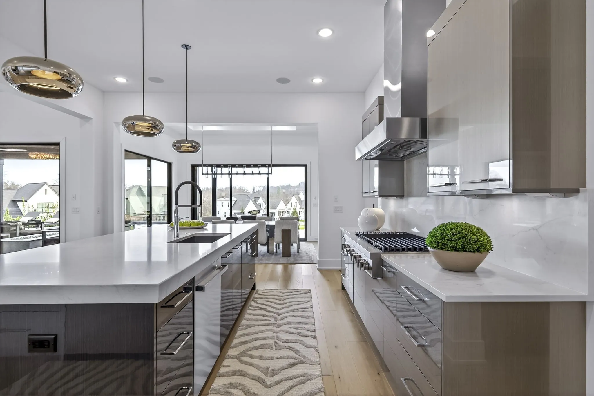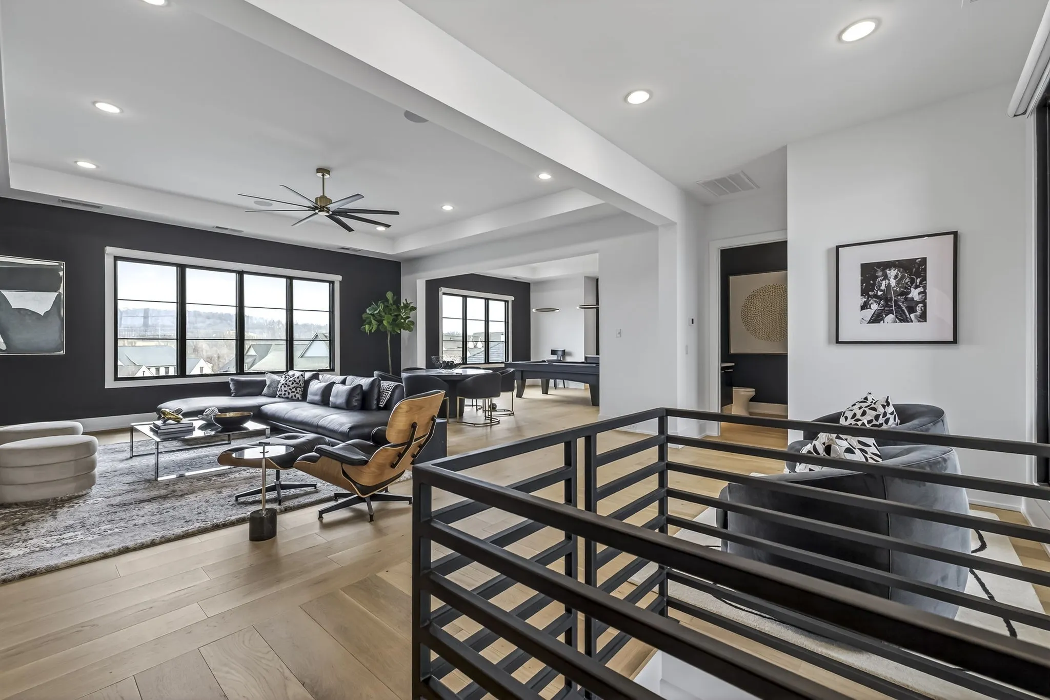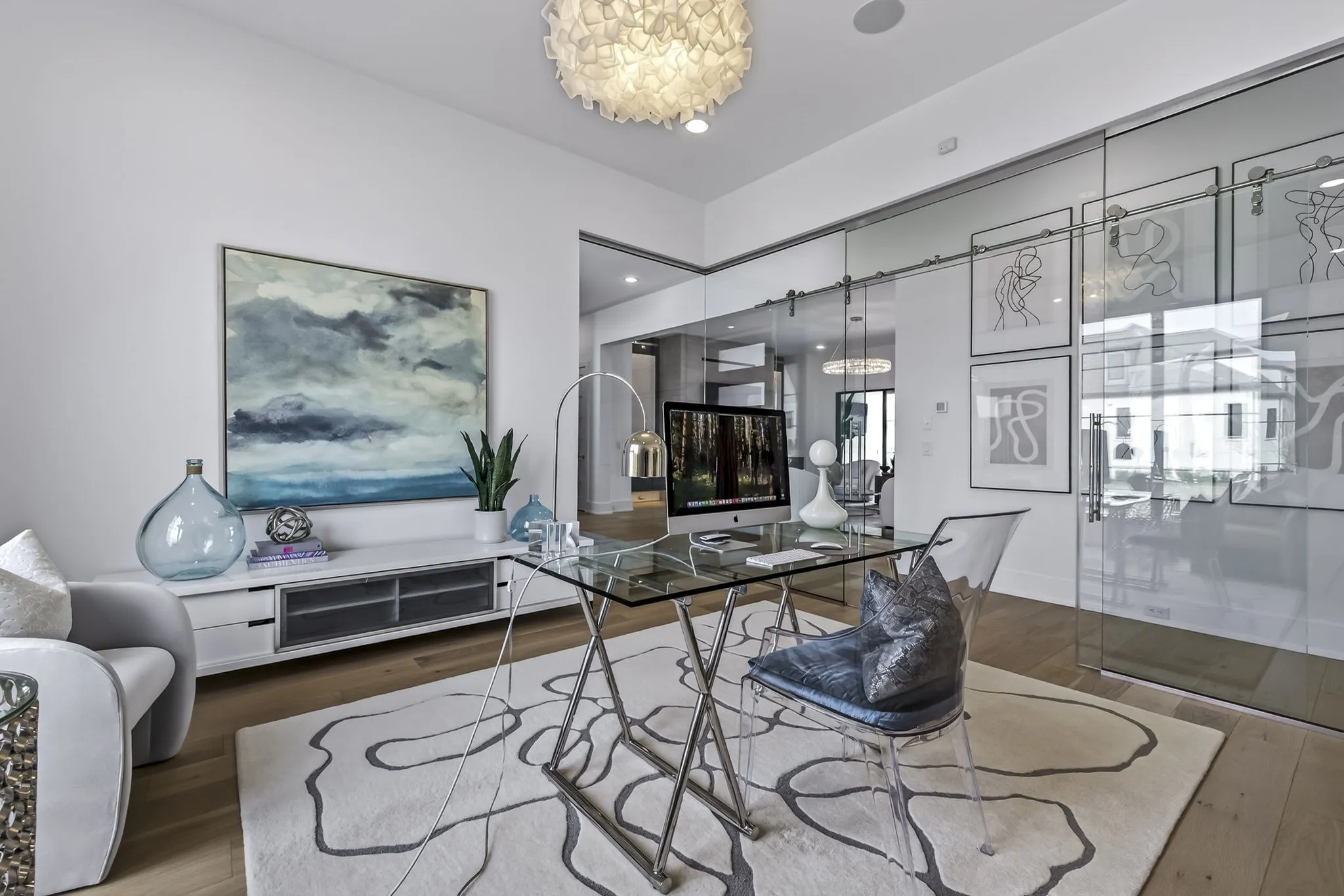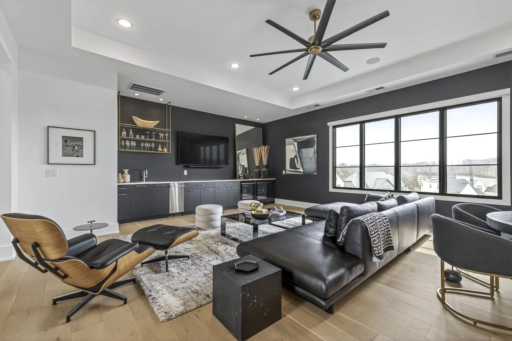 The light-filled, open-concept layout is framed by floor-to-ceiling windows & three walls of 8’ stacking nano doors for seamless indoor-outdoor living. The great room features a sleek linear fireplace w/floating cabinetry, while a glass-walled office creates a private work-from-home space.
