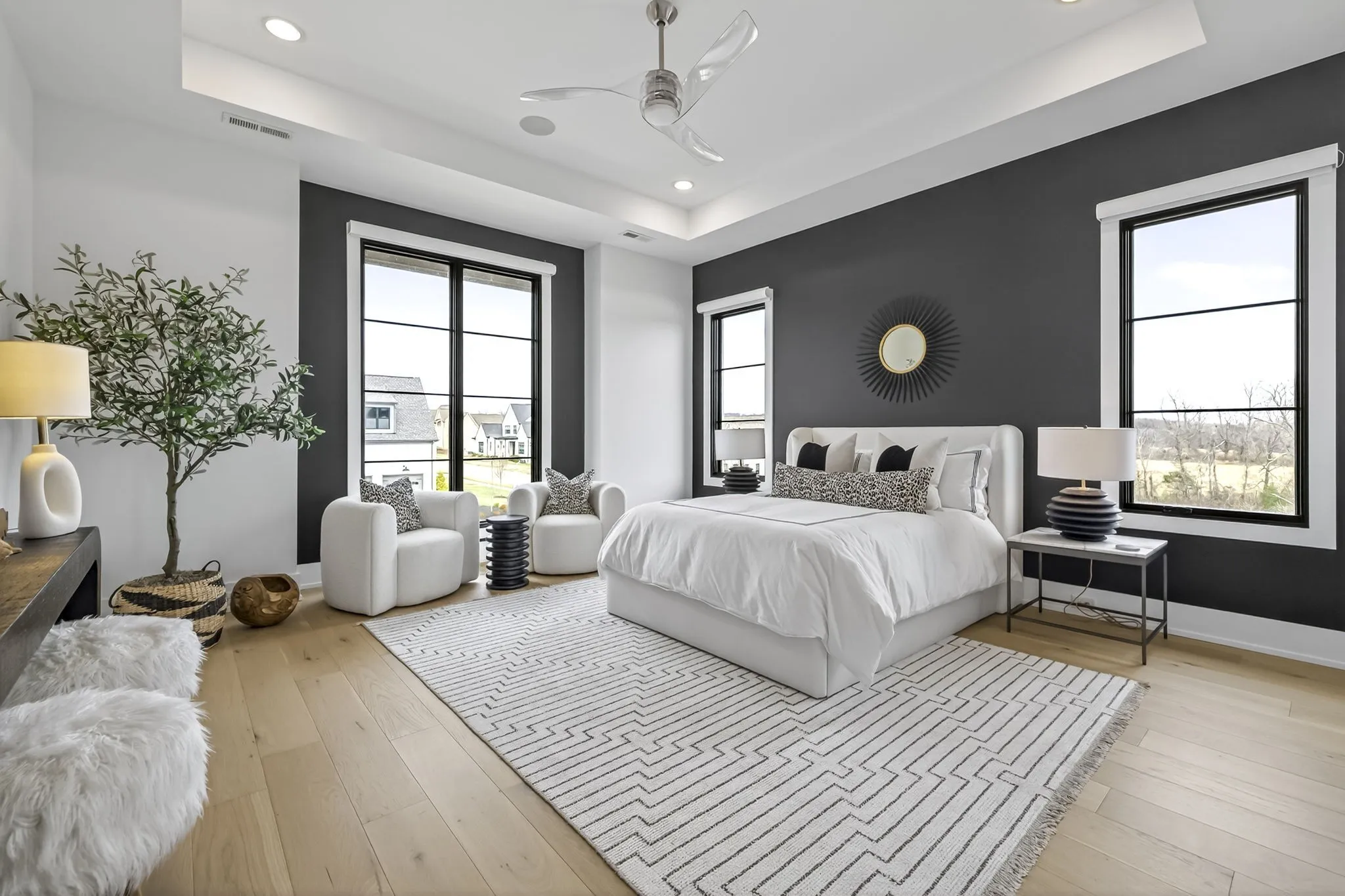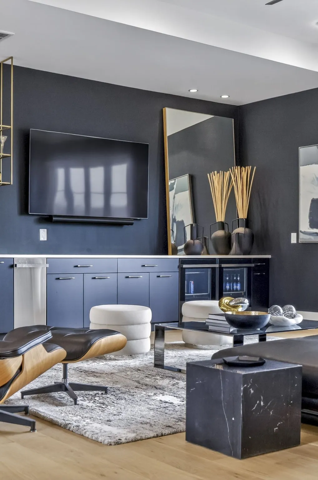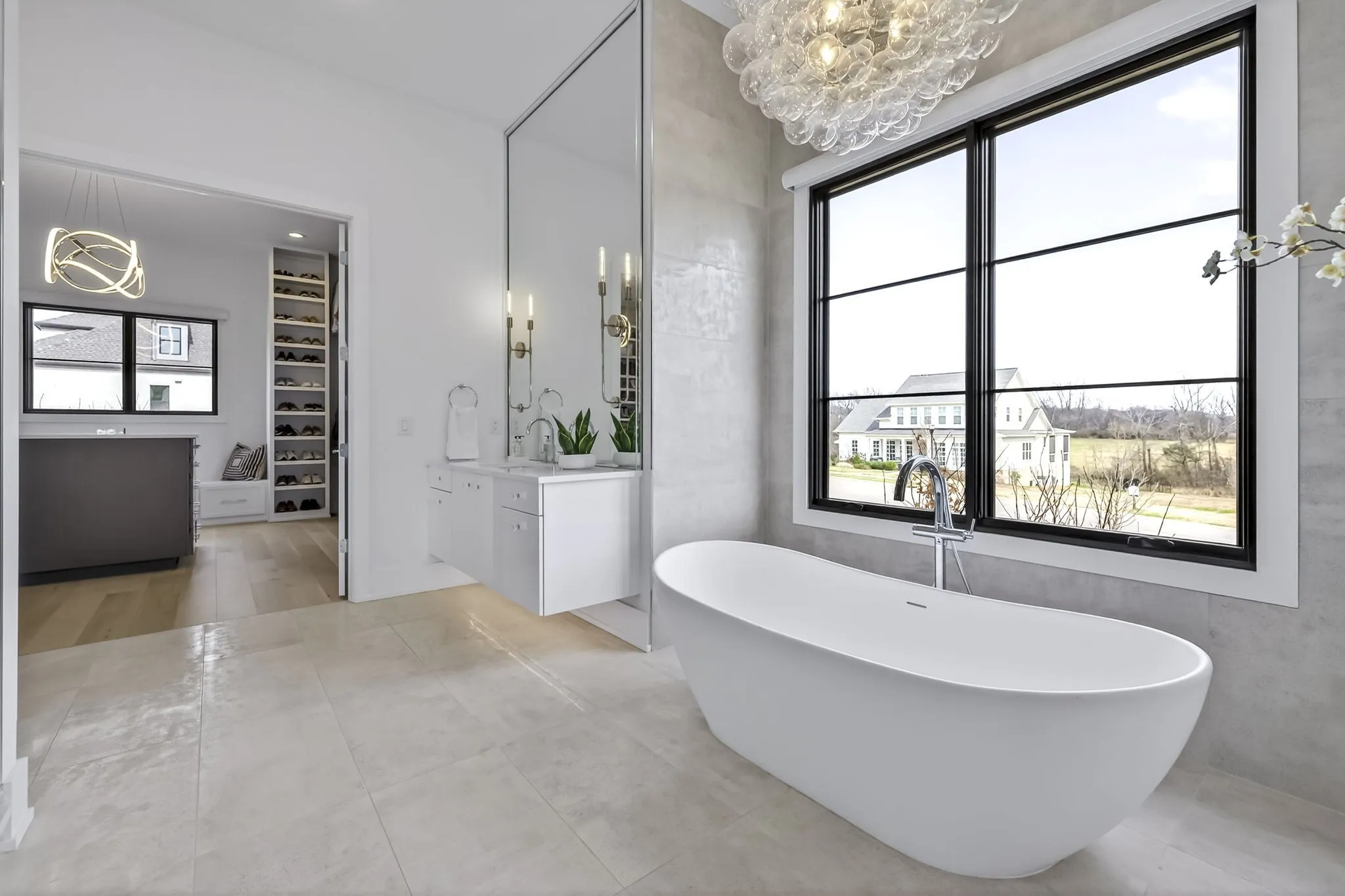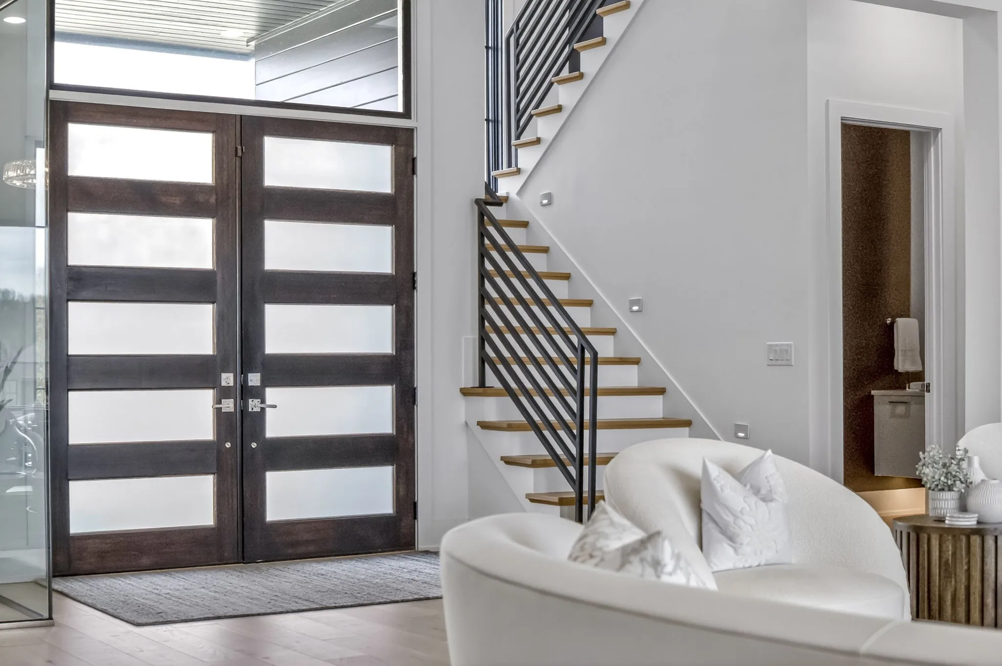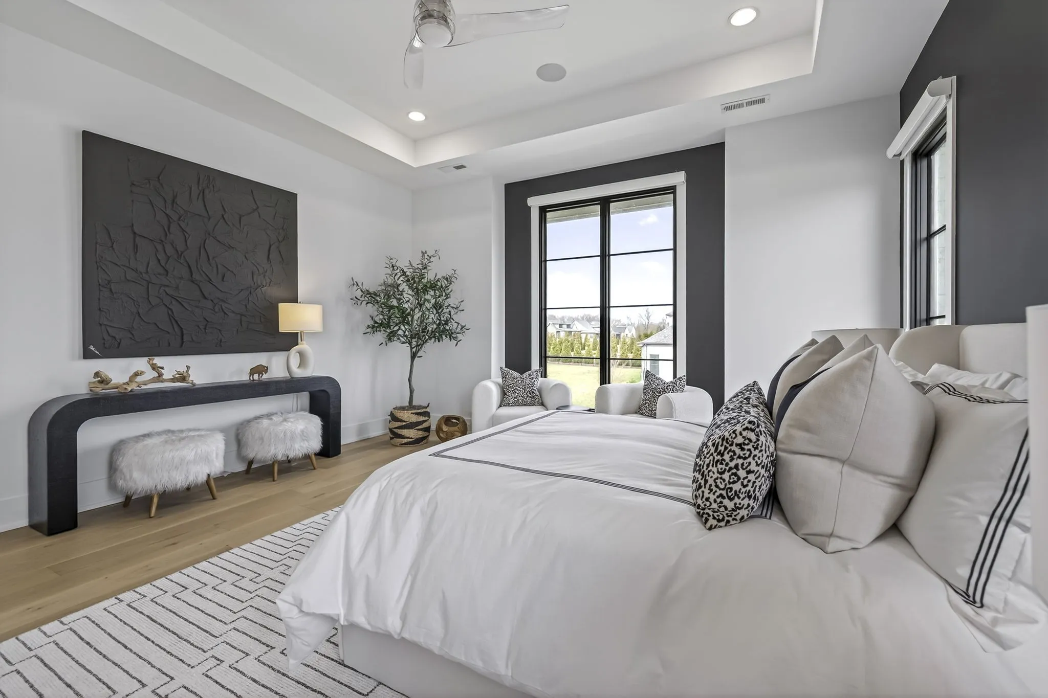 The light-filled, open-concept layout is framed by floor-to-ceiling windows & three walls of 8’ stacking nano doors for seamless indoor-outdoor living. The great room features a sleek linear fireplace w/floating cabinetry, while a glass-walled office creates a private work-from-home space.