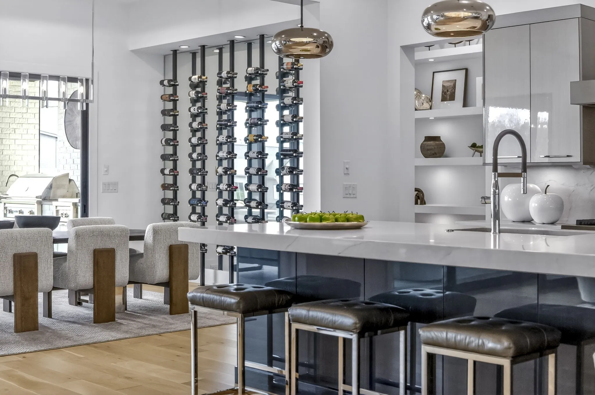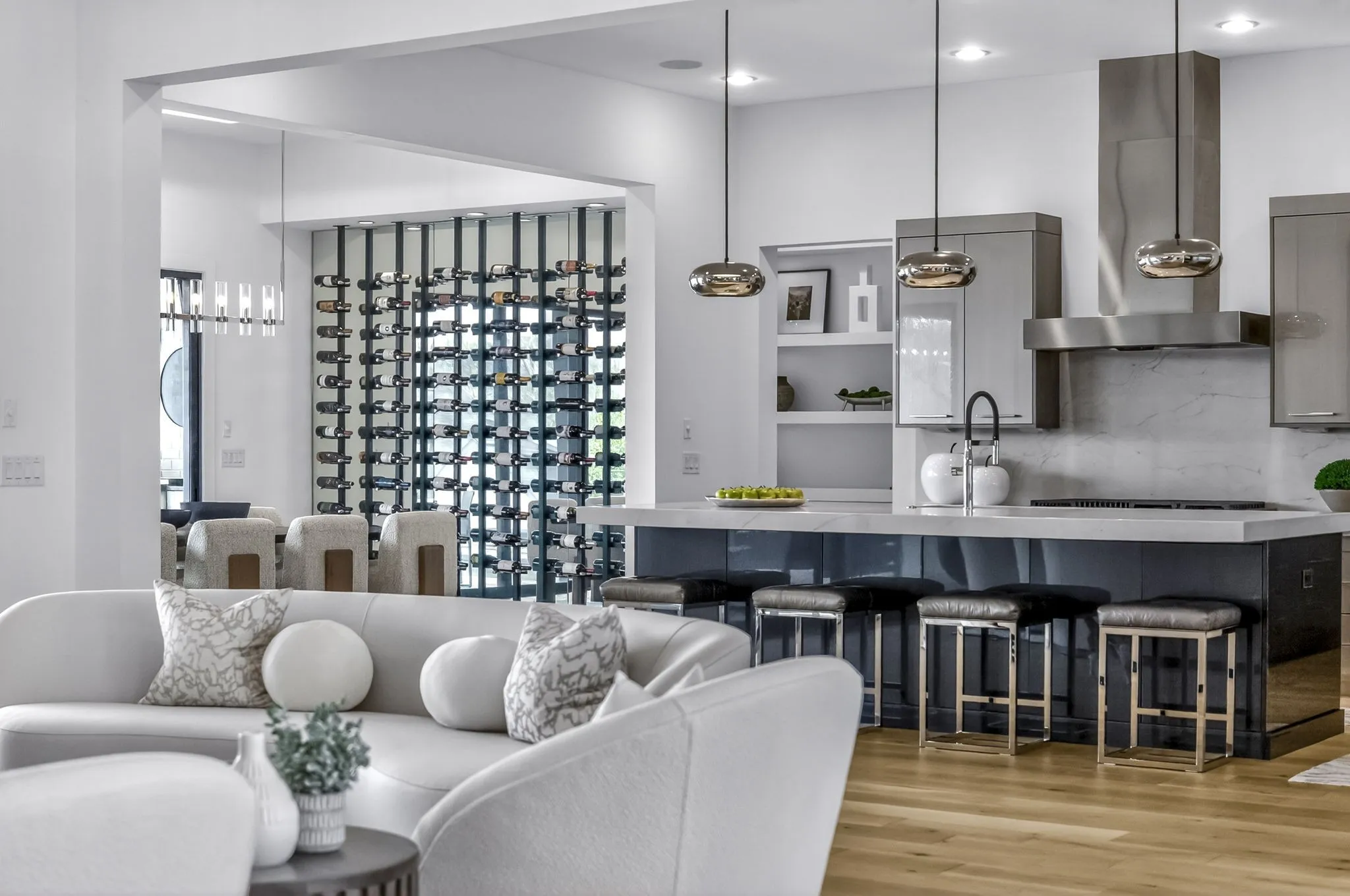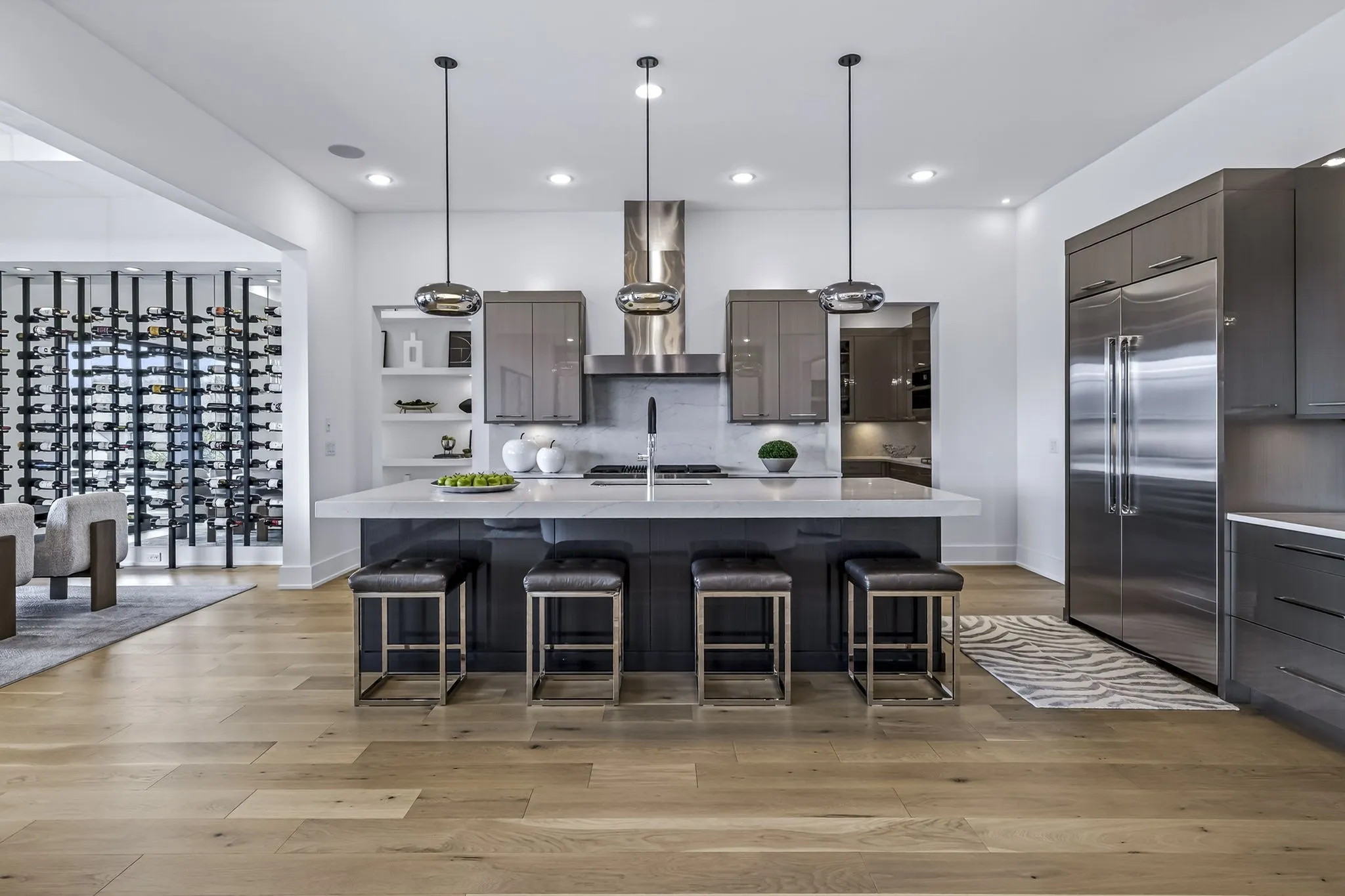 The gourmet kitchen is both stunning & seriously equipped w/custom cabinetry, a separate scullery kitchen & appliances including a JennAir 48” Noir rangetop, 48” built-in frige, double wall ovens, 30” Noir microwave w/speed-cook, warming drawer & built-in dishwasher. A custom wine wall elevates the dining space.