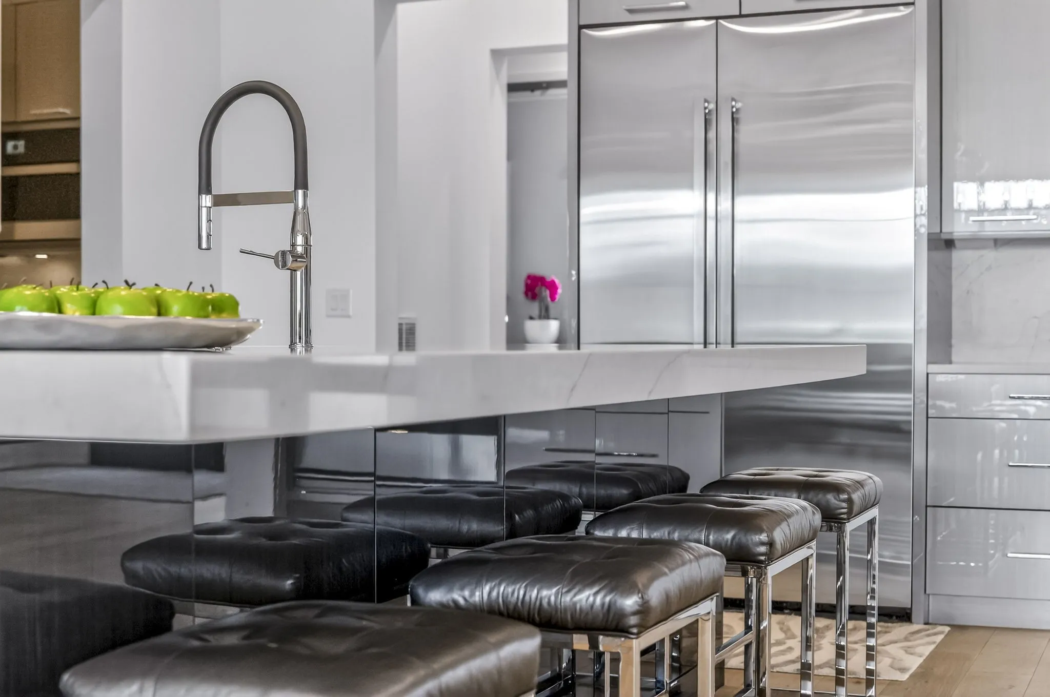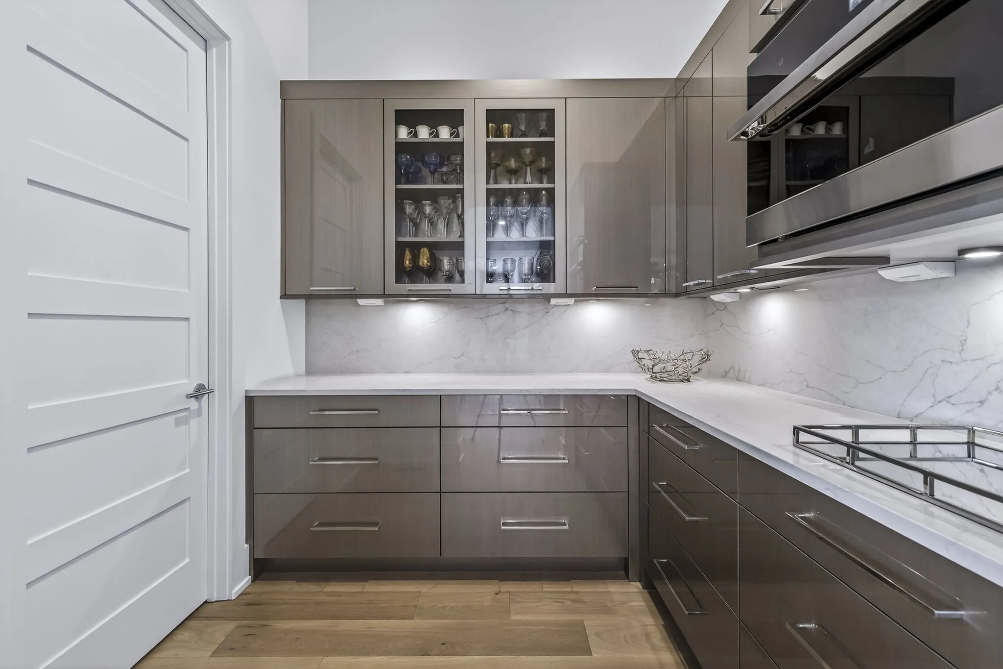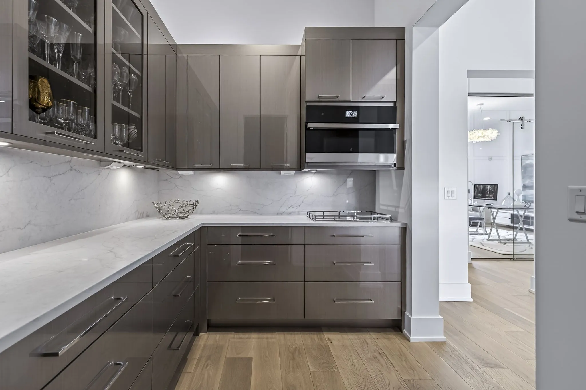 The gourmet kitchen is both stunning & seriously equipped w/custom cabinetry, a separate scullery kitchen & appliances including a JennAir 48” Noir rangetop, 48” built-in frige, double wall ovens, 30” Noir microwave w/speed-cook, warming drawer & built-in dishwasher. A custom wine wall elevates the dining space.