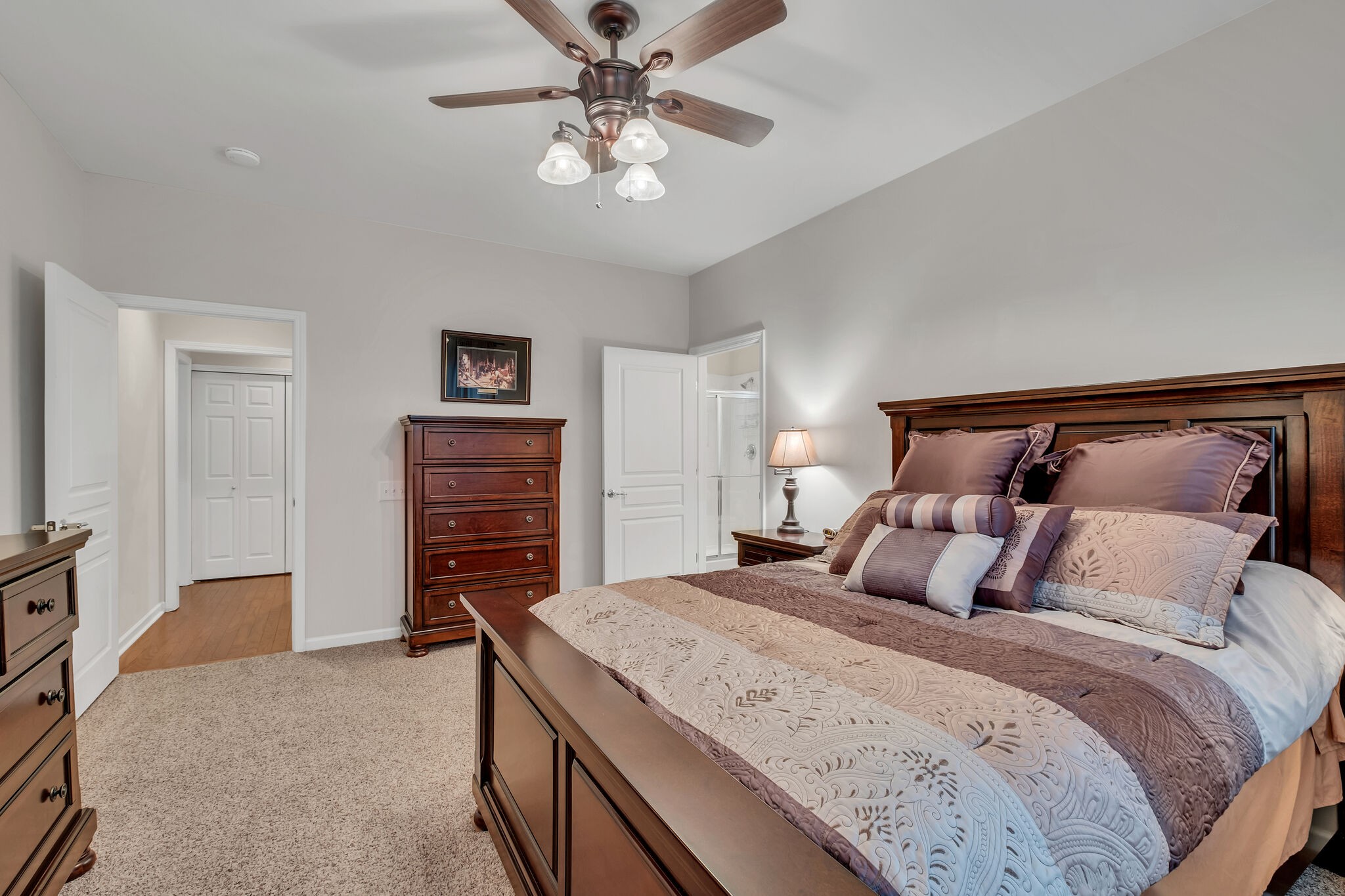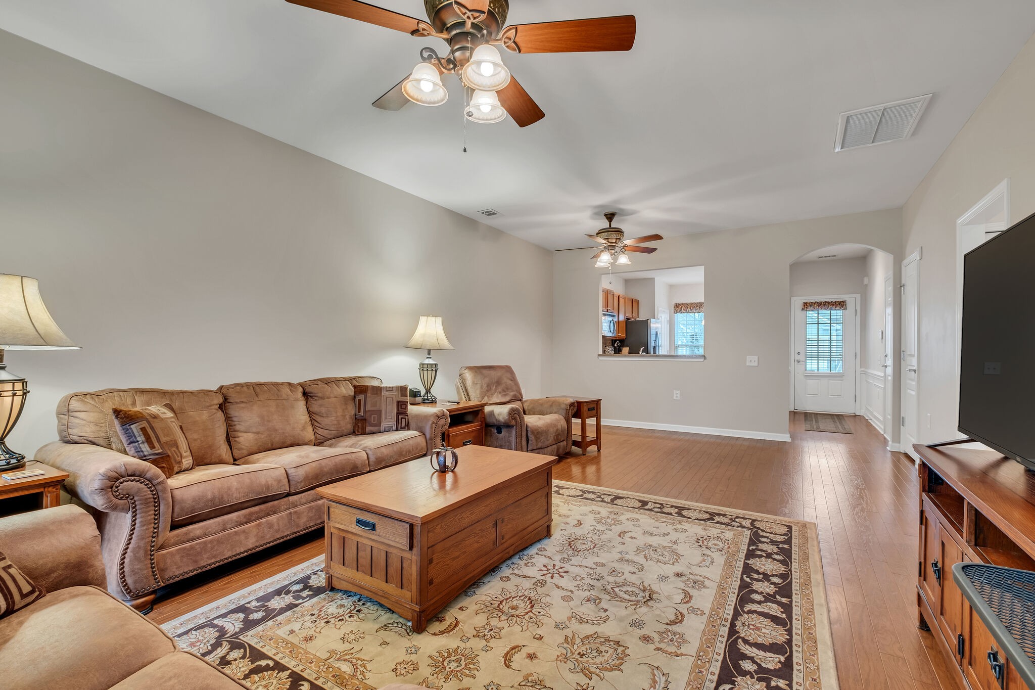 Kenwood Plan. 55+ Active adult gated community. One floor living/no steps. The HOA maintains the exterior of the home, landscaping & lawncare. HVAC only 3 years old. 2 bedroom, 2 full bath, covered back porch, 2 car garage with floored attic space. Hardwood floors in foyer, kitchen, liv rm and hall. Like-new carpet in bedrooms, Kitchen w/pantry, stainless appliances and eat-in area. Large living/dining combination. Master bedroom w/plush carpeting, large walk-in closet. Master bath w/tile flooring, double vanities, lots of cabinets, step-in shower. Gated Community / Active Clubhouse-Activity Center / Pools / Walking Trails / Workout center / Pickle Ball / Tennis / Stocked Fishing Lake / Paddle Boats and more!