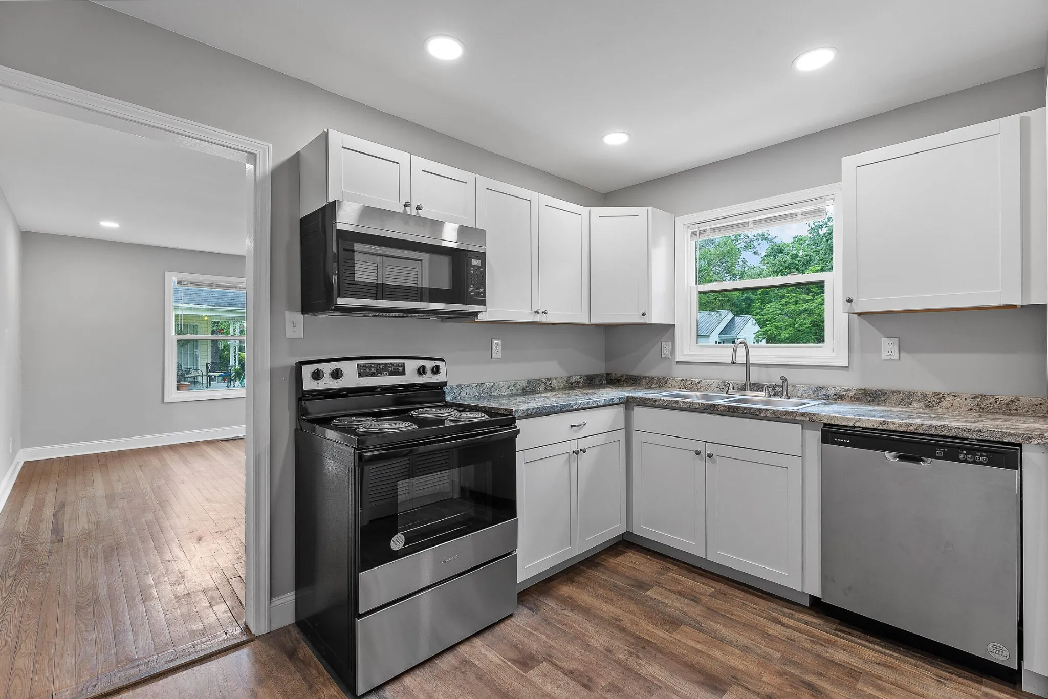 Key updates include a brand-new roof with fifty year architectural shingles, brand new oversized guttering, energy-efficient double-pane windows, and a fully upgraded kitchen outfitted with contemporary cabinetry and all-new stainless steel appliances, including a refrigerator, range, dishwasher, microwave, and stackable washer and dryer. Enjoy the convenience of a carport for protected parking and a large, flat backyard perfect for outdoor activities.