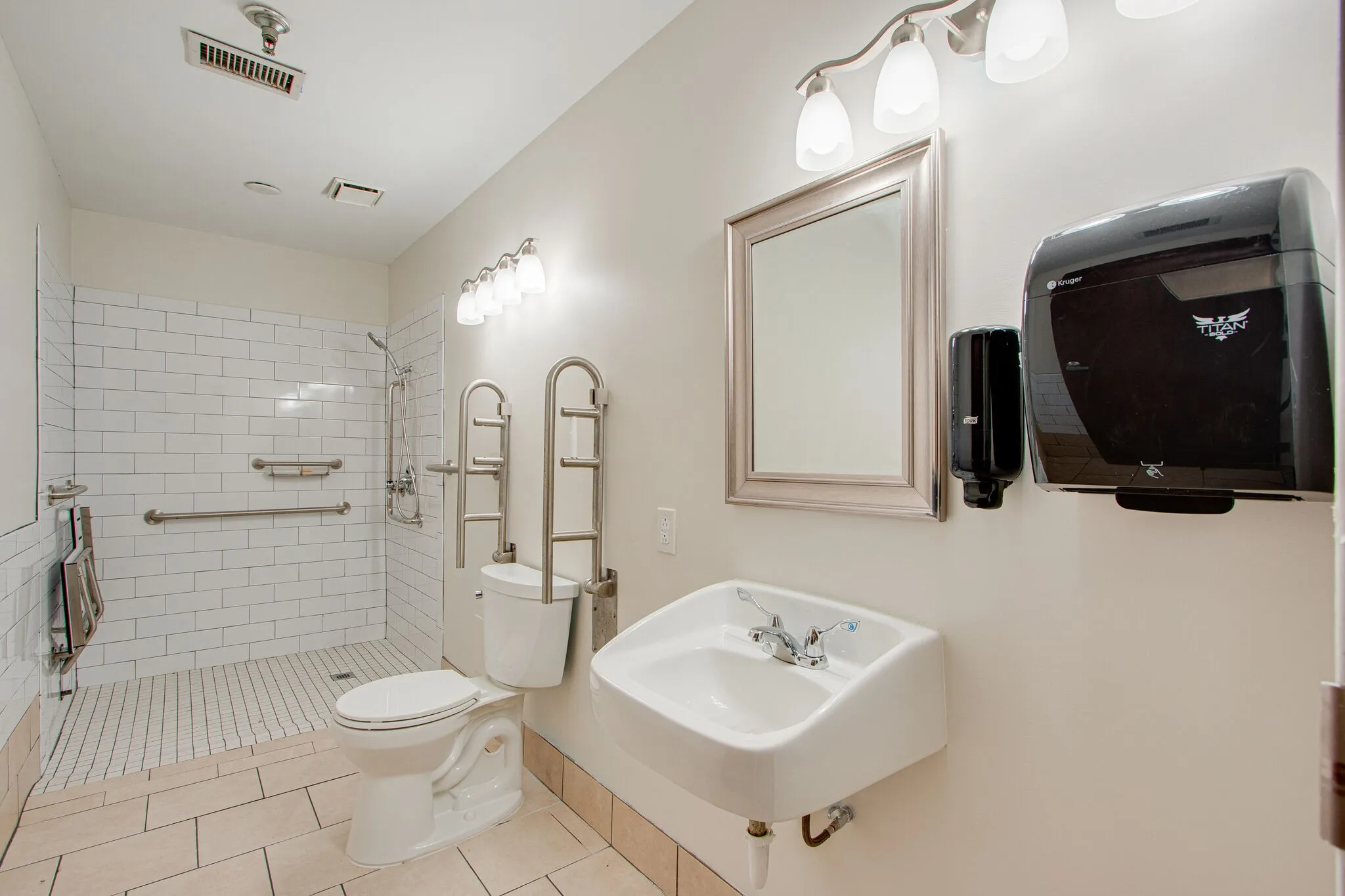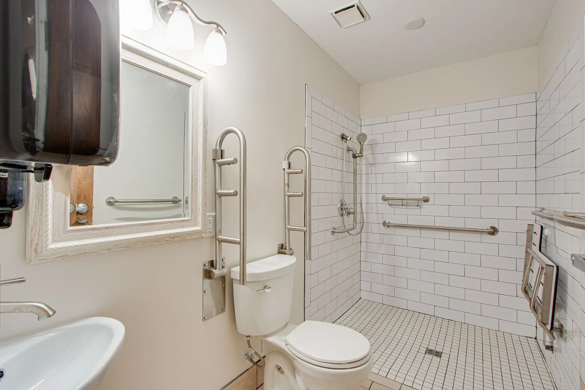 "LongDescription" => "This walk-in shower has a bench and hand held shower sprayer, and bars for stability."