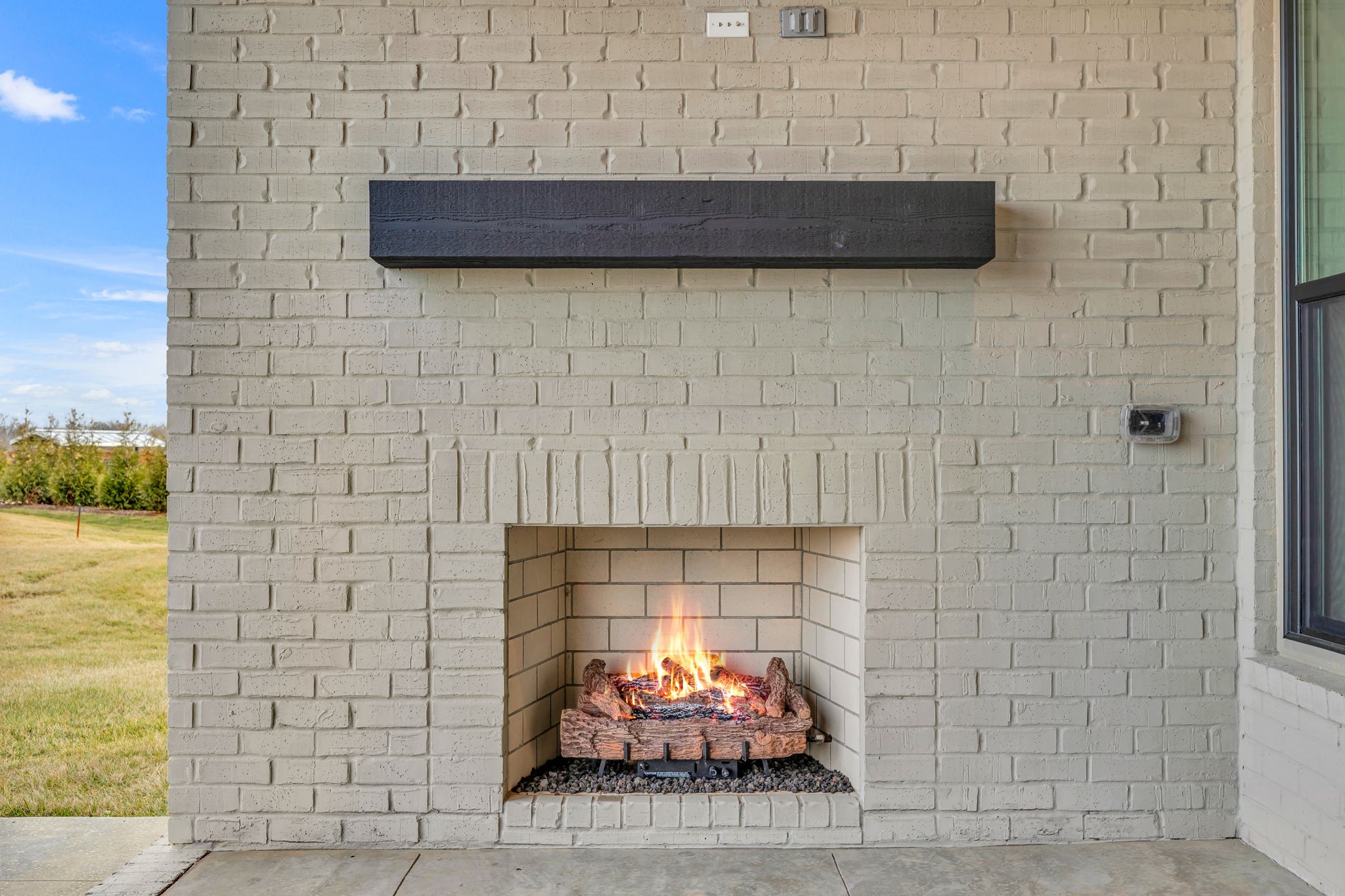 "LongDescription" => "Isokern fireplace with gas logs on the covered back porch."