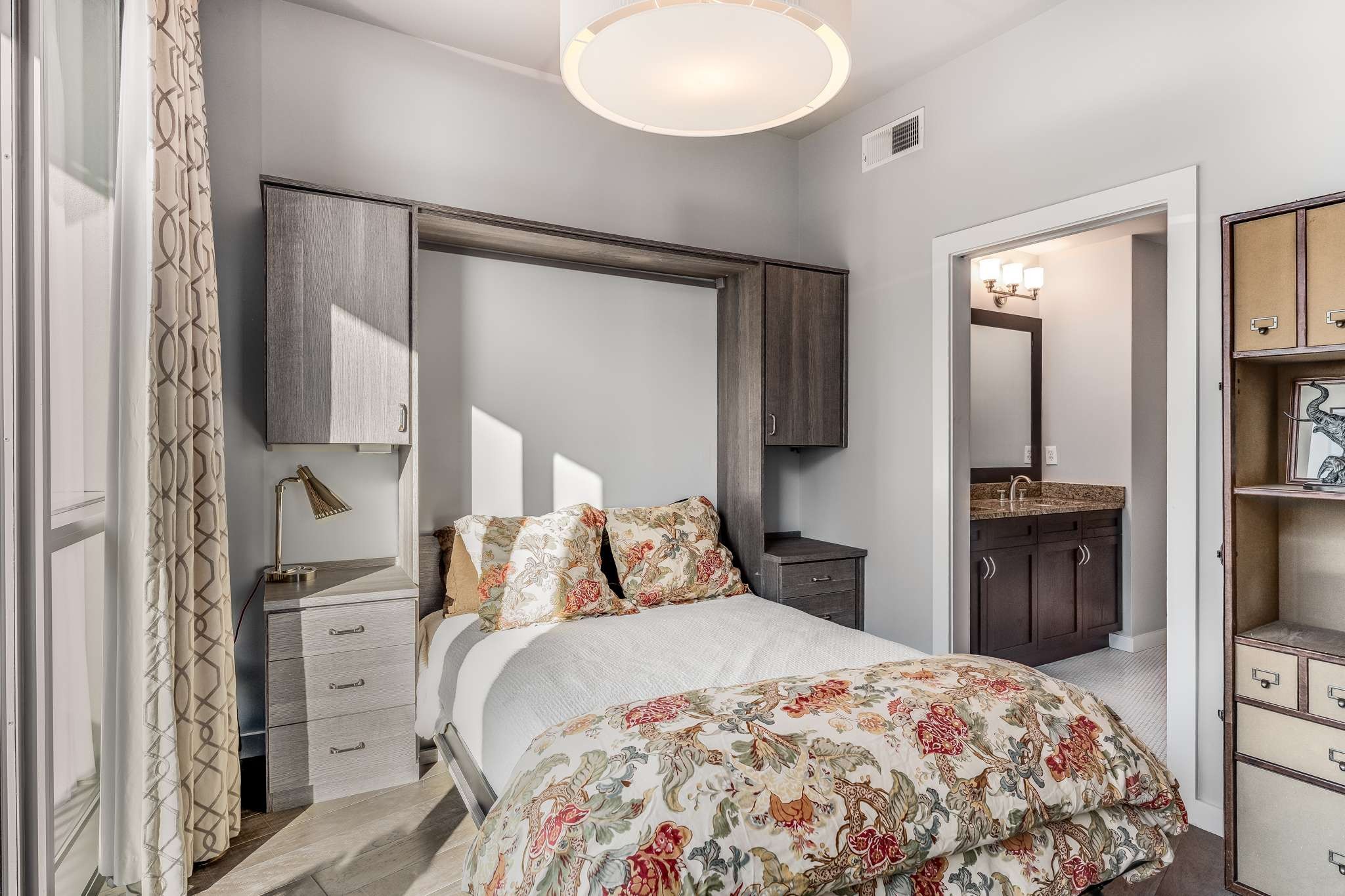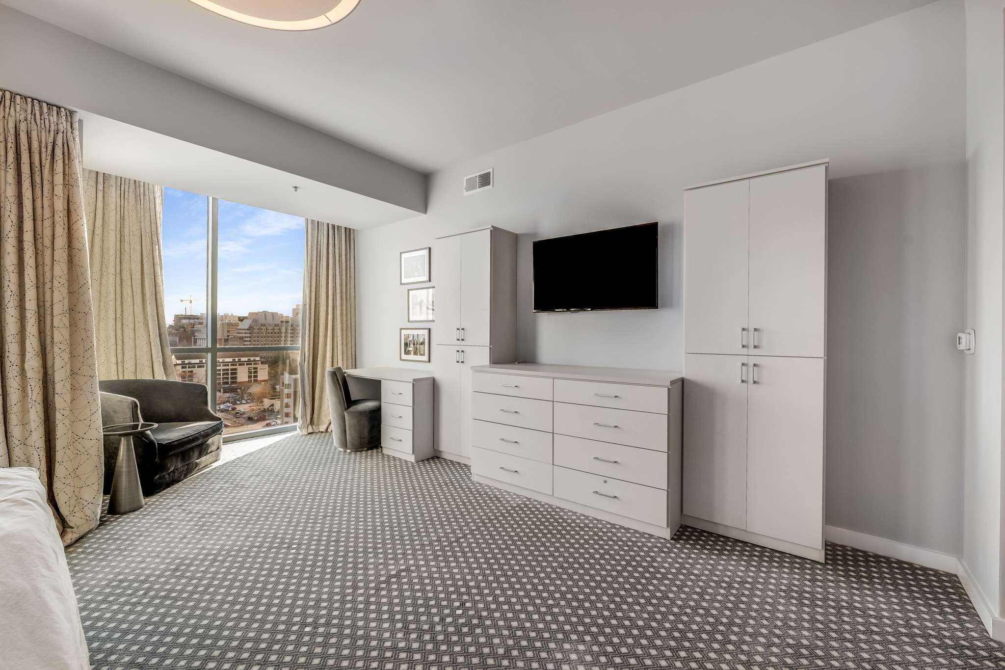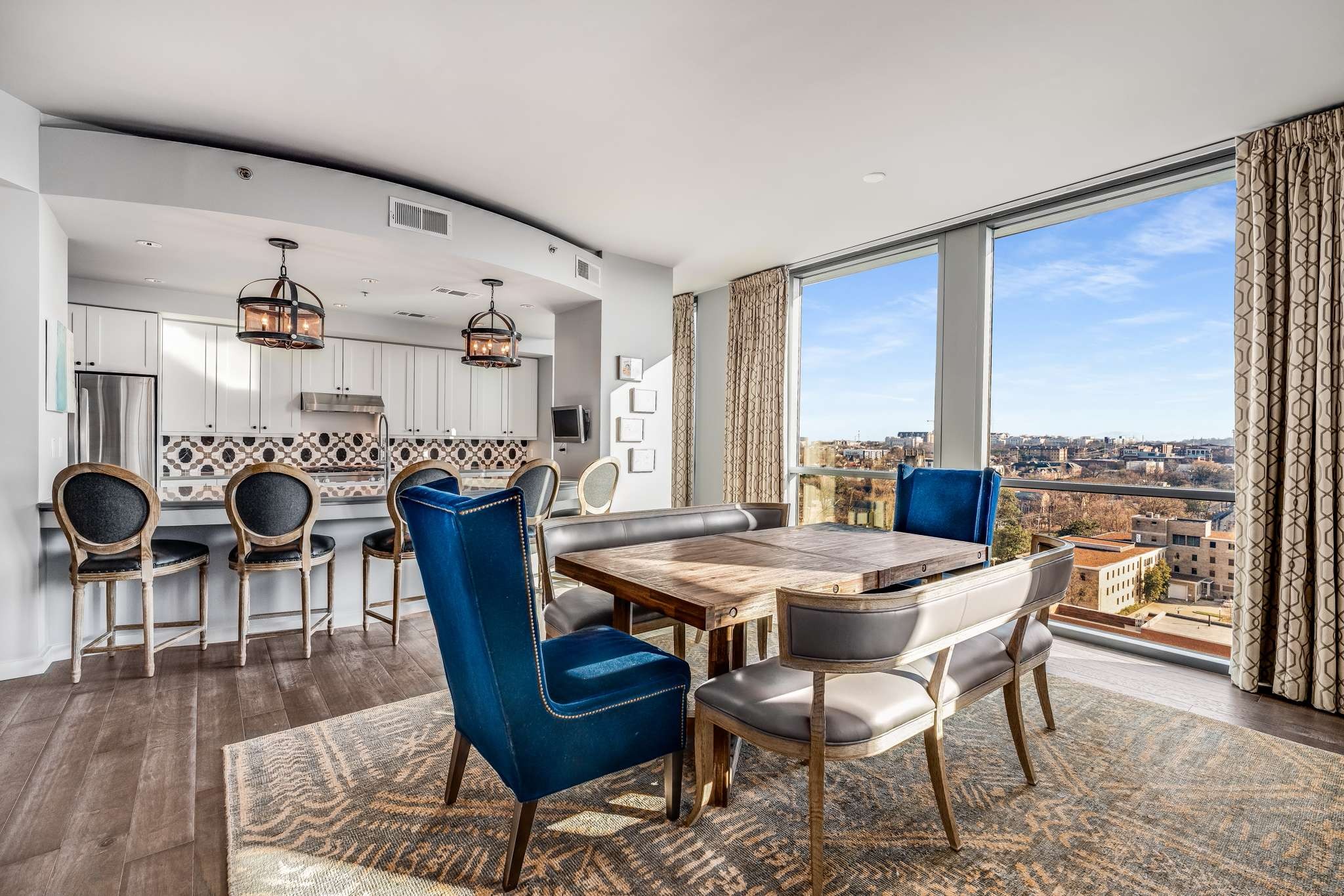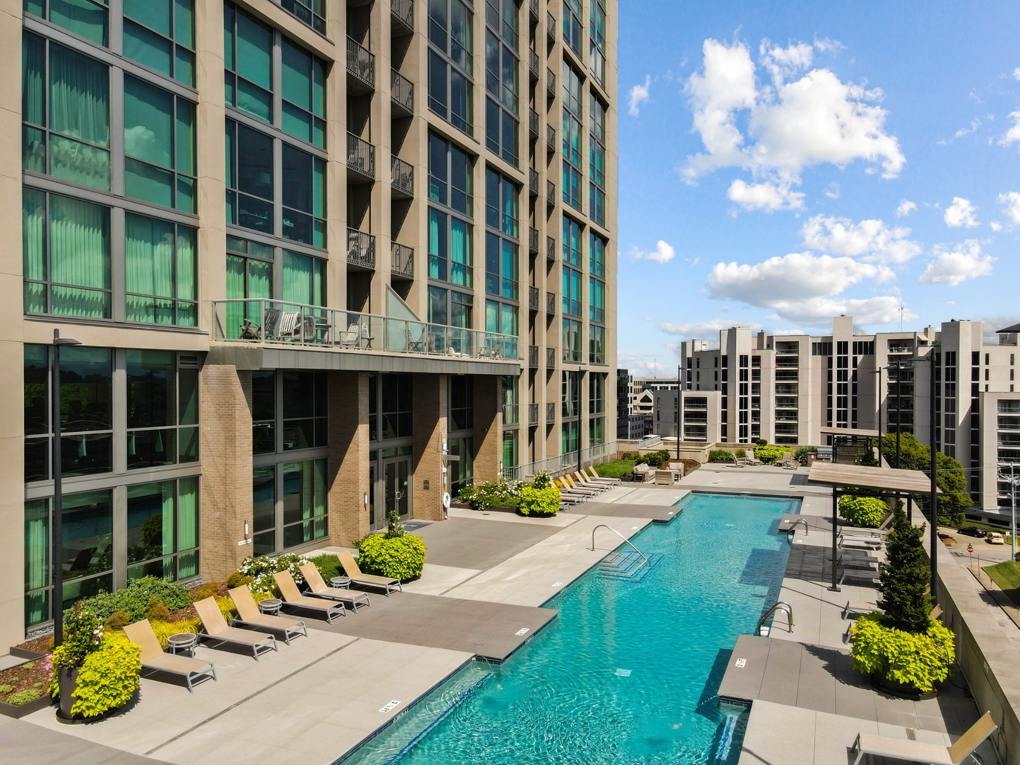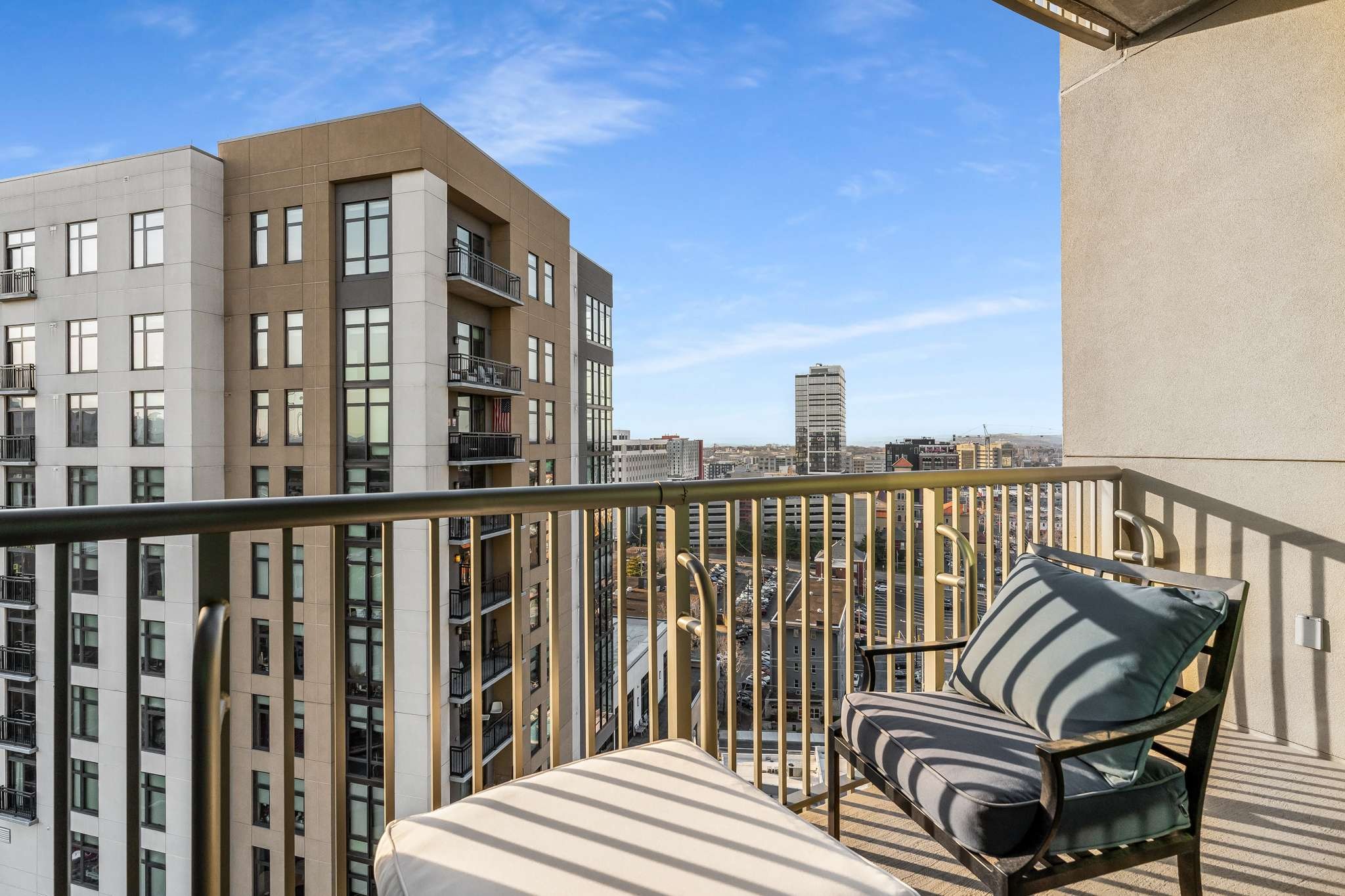 Totally renovated top to bottom! Kitchen, Bathrooms, Floors, Closets and Pantry all updated! Storage and custom built ins throughout! SS Miele gas cooktop and oven, Miele steam oven, Miele built in Espresso Machine. HUGE walk in pantry/laundry with custom shelving to organize and maximize space. Oversized quartz island comfortably seats four, under counter lighting and outlets, a marble backsplash rounds out the renovated kitchen with style. 2,000 sq ft and too many upgrades to mention! Stunning views of Vandy and Midtown from 3 balconies off living room and both ensuite bedrooms. Storage abounds w custom built-ins in Primary Suite w writing desk, cabinetry and customized walk in closet. Beautifully updated marble bathroom. Murphy bed unit in spare room stays. The living room features a custom sculptural, sound diffusing wall and floor to ceiling windows flanked by designer black out curtains that will remain. All this and two premium parking spaces and a large storage unit convey.
