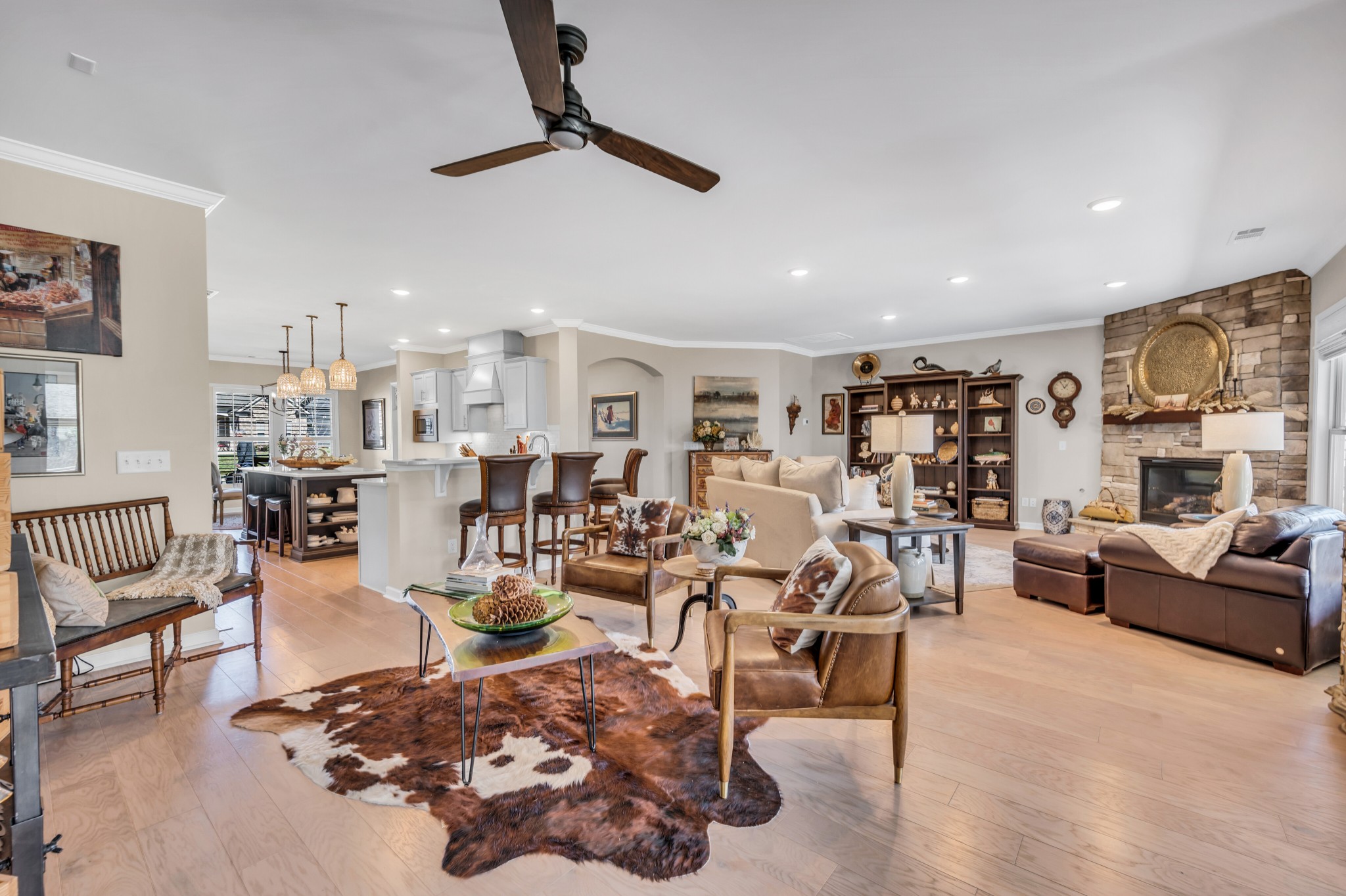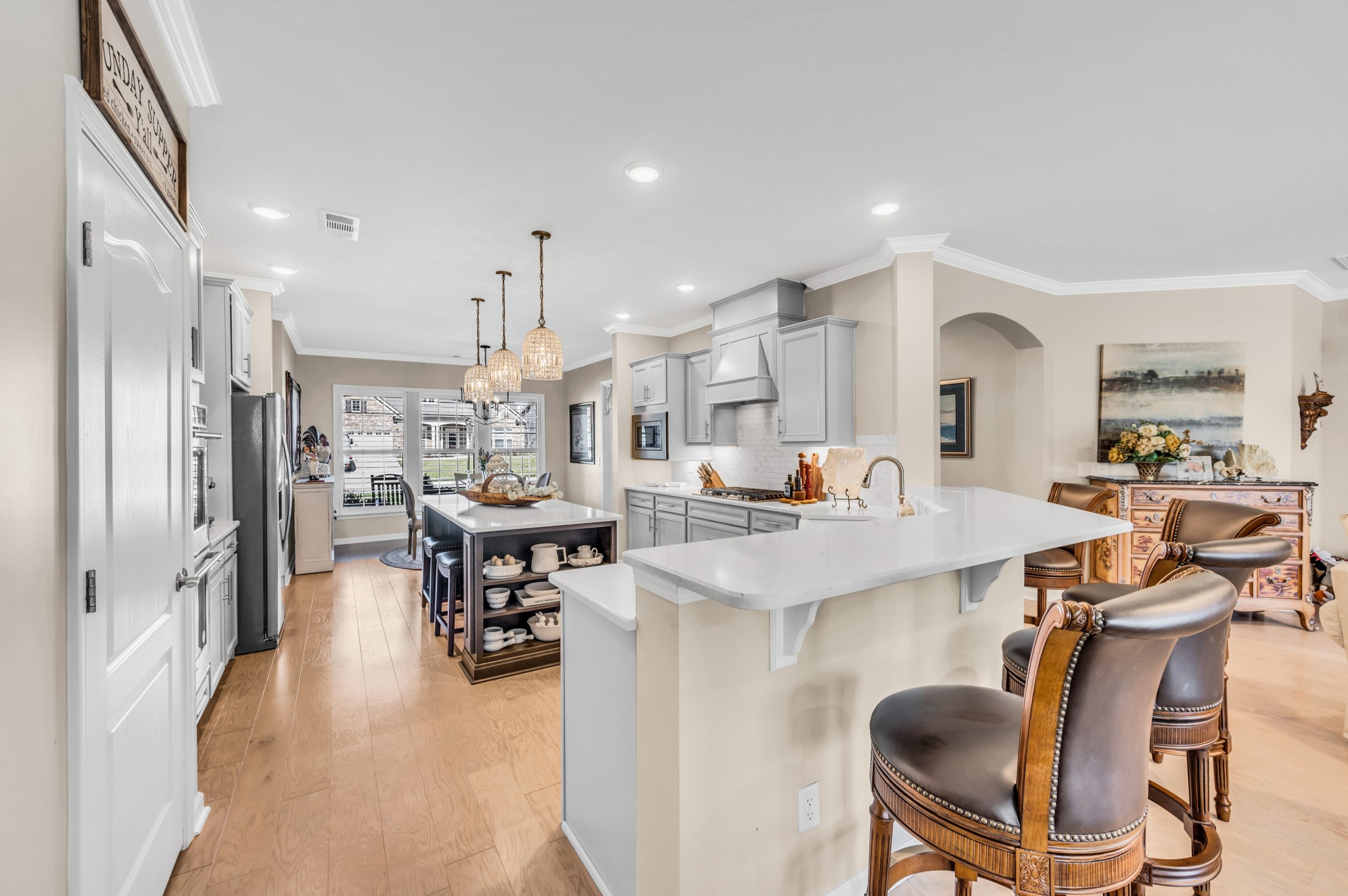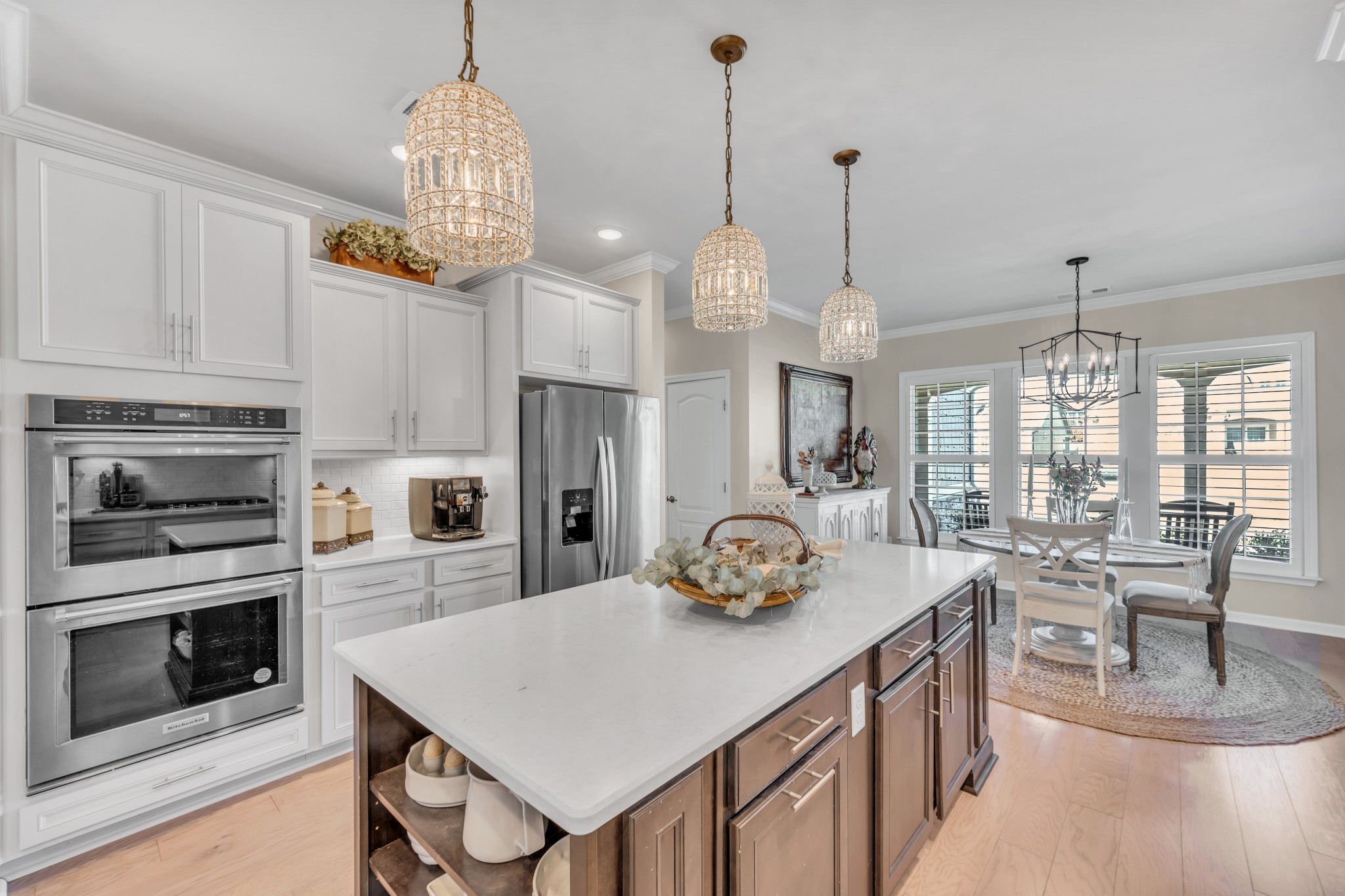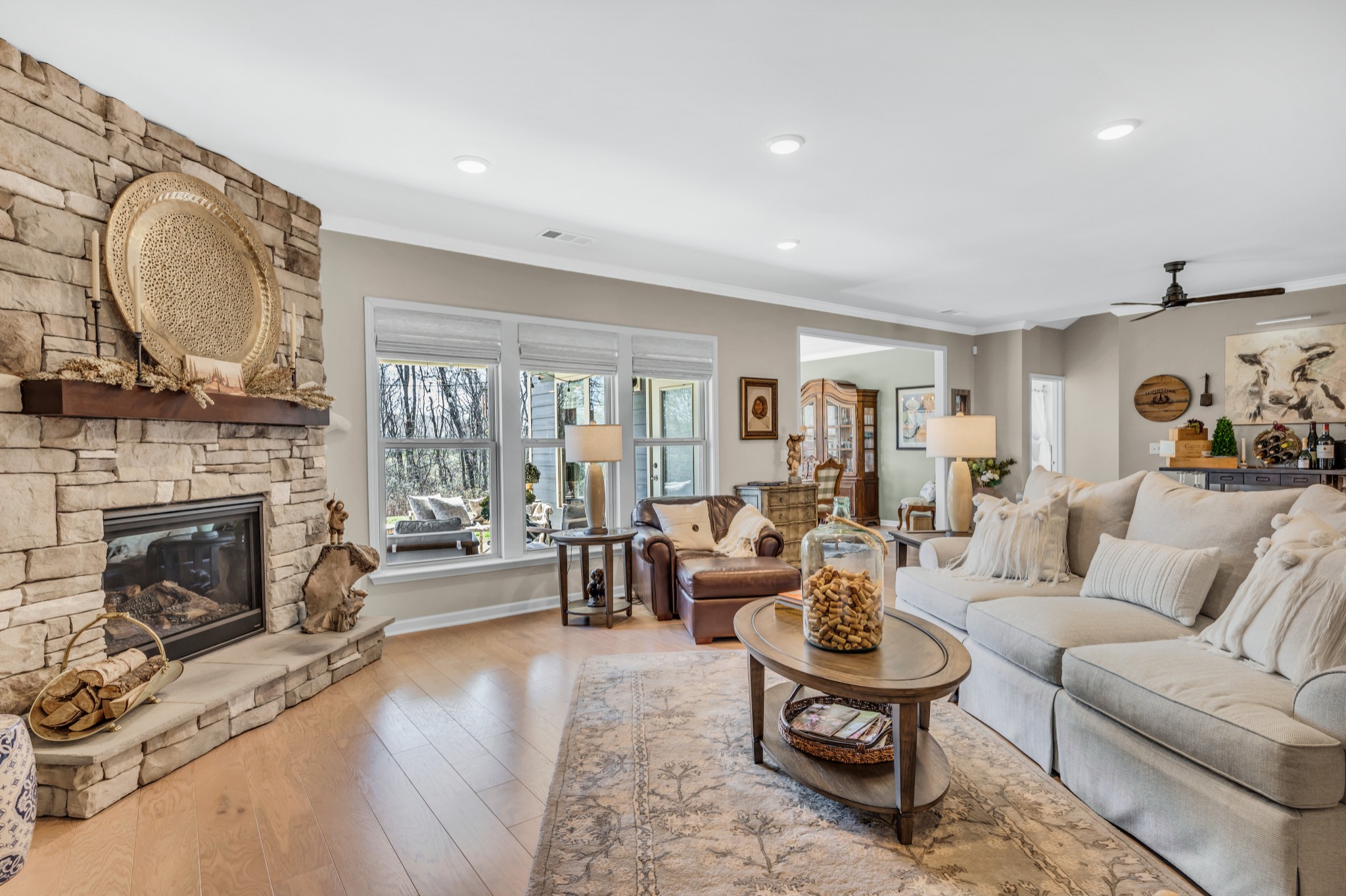 +"PublicRemarks": "Luxurious 3 bed/3 bath, all on main level,Tangerly Oak Model in Del Webb 55 + active adult community with sunroom, upstairs loft area, and large covered patio backing to lush private treeline with abundant wildlife viewing for the utmost in privacy. Gorgeous gas stone fireplace in great room. A dream kitchen with upgraded cabinetry, quartz countertops, soft close doors and roll out shelving, farmhouse sink, double ovens, gas cooktop, walk in pantry, and large island. Primary bedroom with tray ceiling and custom California Closet. Primary bath has separate tub/shower, tile floor, double sink vanity with a beautiful transom window allowing lots of natural light. Plantation shutters,crown molding, laminate wood floors, tile in bathrooms, high end light fixtures, sink in laundry, extra storage with built-ins and shelving in garage. Epoxy floor coating on garage floor and front porch. Entire home repainted. Over $200,000 of upgrades in this home. Extra space in garage for golf cart parking."