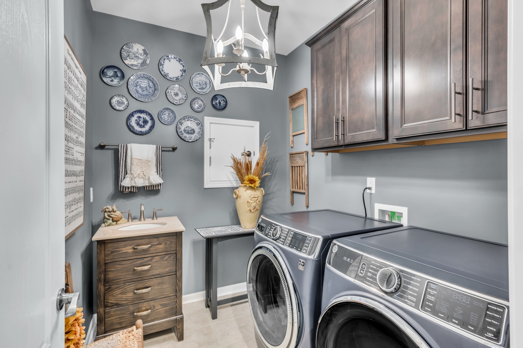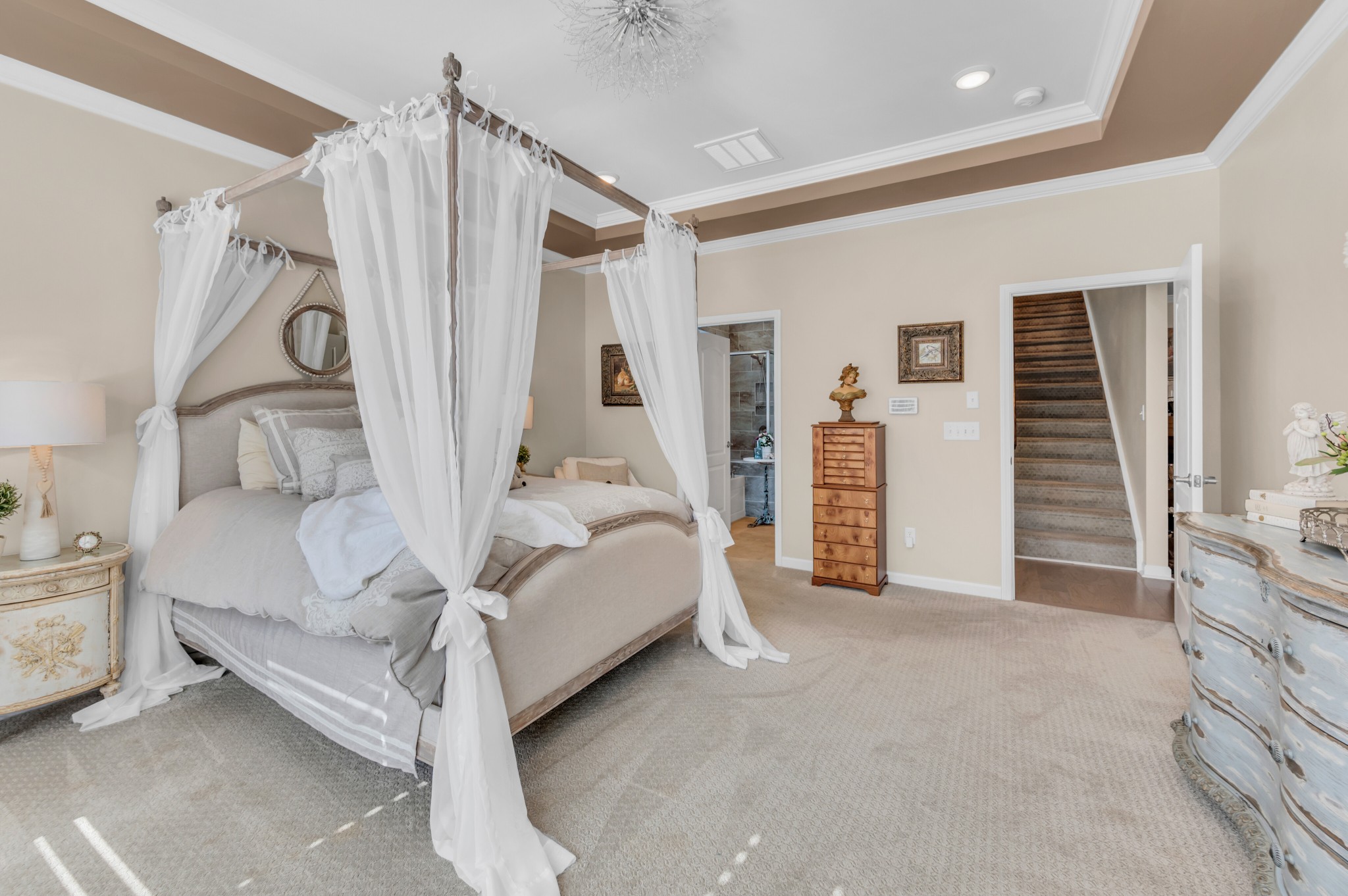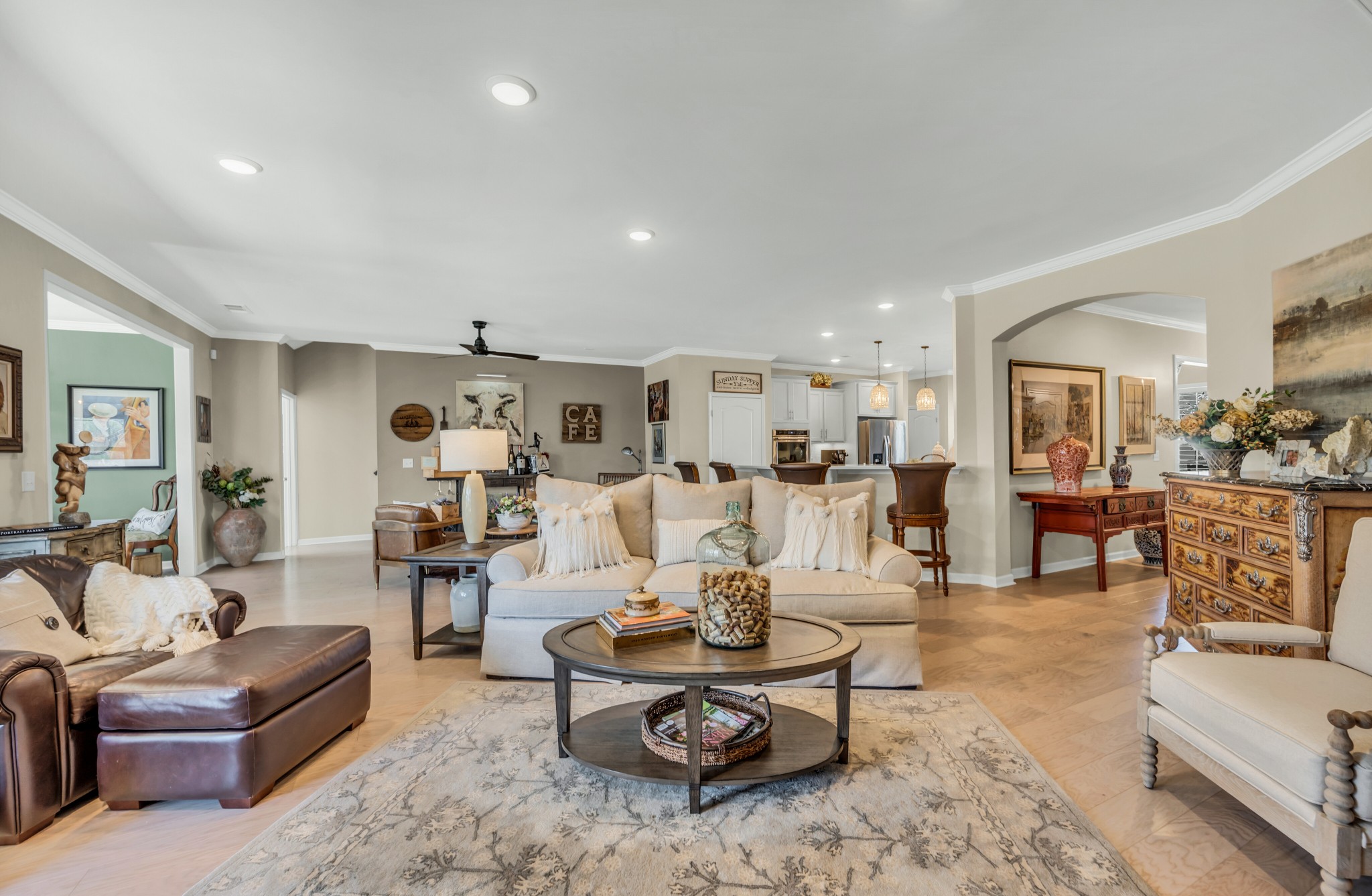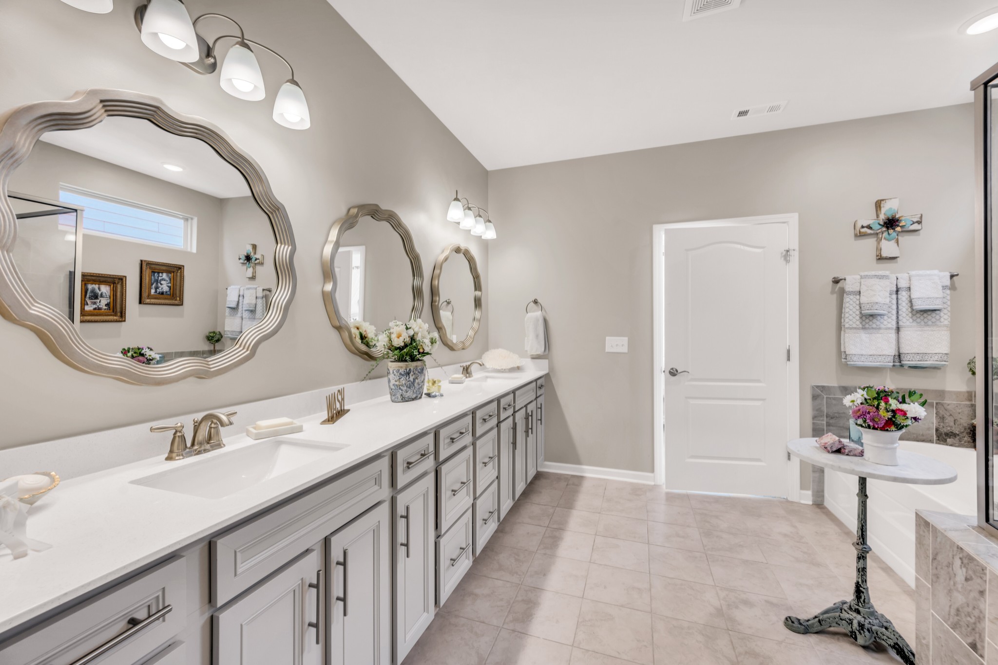 +"PublicRemarks": "Luxurious 3 bed/3 bath, all on main level,Tangerly Oak Model in Del Webb 55 + active adult community with sunroom, upstairs loft area, and large covered patio backing to lush private treeline with abundant wildlife viewing for the utmost in privacy. Gorgeous gas stone fireplace in great room. A dream kitchen with upgraded cabinetry, quartz countertops, soft close doors and roll out shelving, farmhouse sink, double ovens, gas cooktop, walk in pantry, and large island. Primary bedroom with tray ceiling and custom California Closet. Primary bath has separate tub/shower, tile floor, double sink vanity with a beautiful transom window allowing lots of natural light. Plantation shutters,crown molding, laminate wood floors, tile in bathrooms, high end light fixtures, sink in laundry, extra storage with built-ins and shelving in garage. Epoxy floor coating on garage floor and front porch. Entire home repainted. Over $200,000 of upgrades in this home. Extra space in garage for golf cart parking."