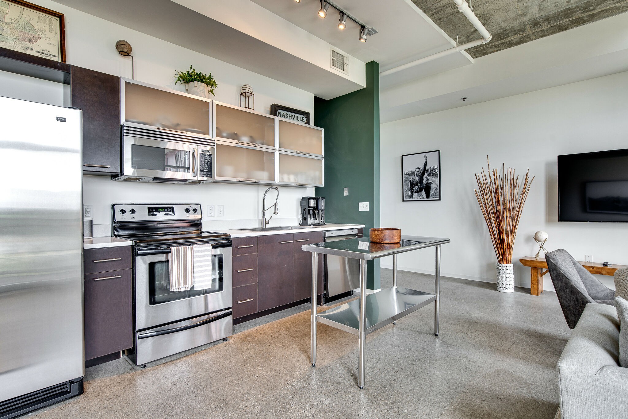Top floor condo! Spacious, two story condo in the front of East Nashville. It’s RARE to find a condo this large downtown Nashville. Open concept, tall ceilings, exposed beams, and floor to ceiling windows. Balcony on the first floor, plus additional private balcony off the bedroom. 5th & Main has an onsite fitness center, pavilion with grills, dog park, expansive rooftop deck with city views, a concierge staff with mail drop at your door, and a gated parking garage. Plus, walking distance to Nissan Stadium and a handful of East Nashville restaurants and activities. 5th & Main is on the edge of the highly anticipated East Bank development. The East Bank will consist of over 300 acres being transformed into the new football stadium, greenways, transit, commercial space, businesses, residences, storefronts and more.