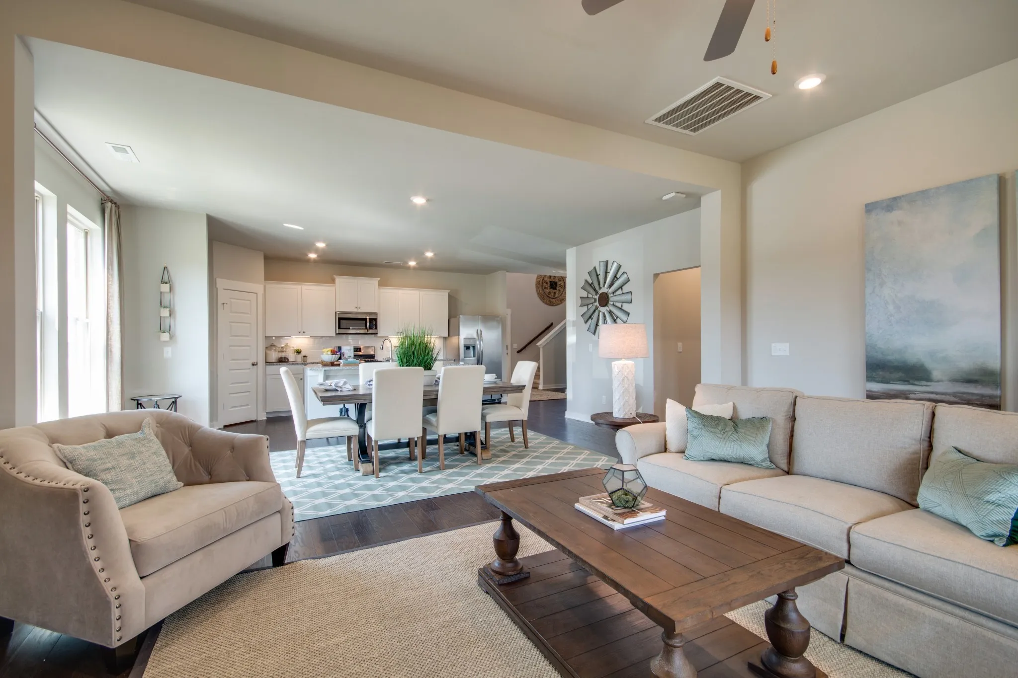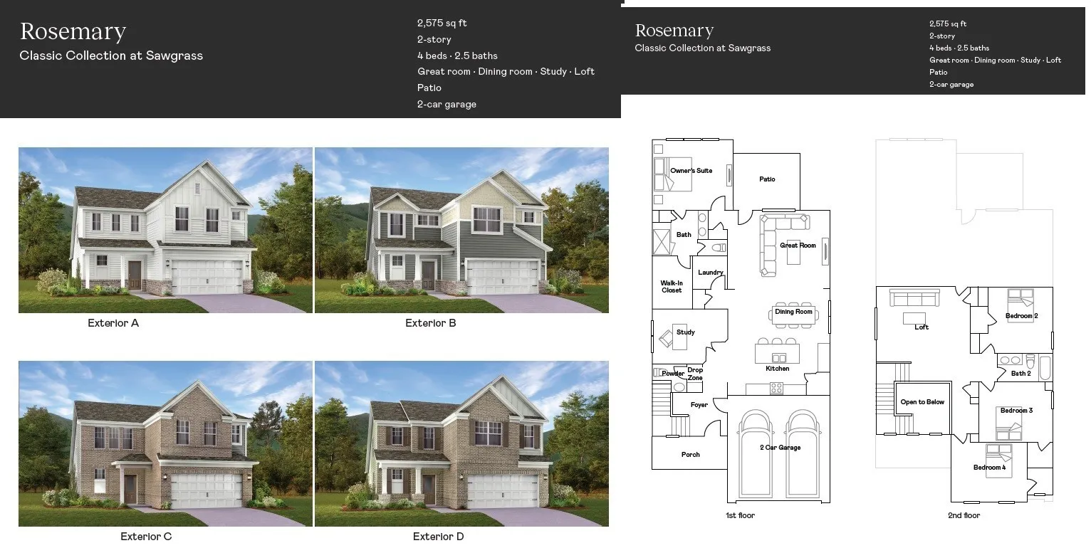 The Rosemary is approx. 2,589 sqft. The heart of this two-story home is the open family room, kitchen and dining room on the first level. The first floor is also host to a convenient office and owner’s suite. Upstairs, three more bedrooms and a loft or extra living space on the second floor. This Rosemary plan offers 4 bedrooms, 2.5 bathrooms, attached 2-car garage. Open living with luxury vinyl plank flooring and fully loaded kitchen featuring stainless steel appliances, quartz, and backsplash. Our Everything Included homes feature 42″ shaker cabinets, subway tile back-splash, and more! Builder is offering $10,000 in closing cost!