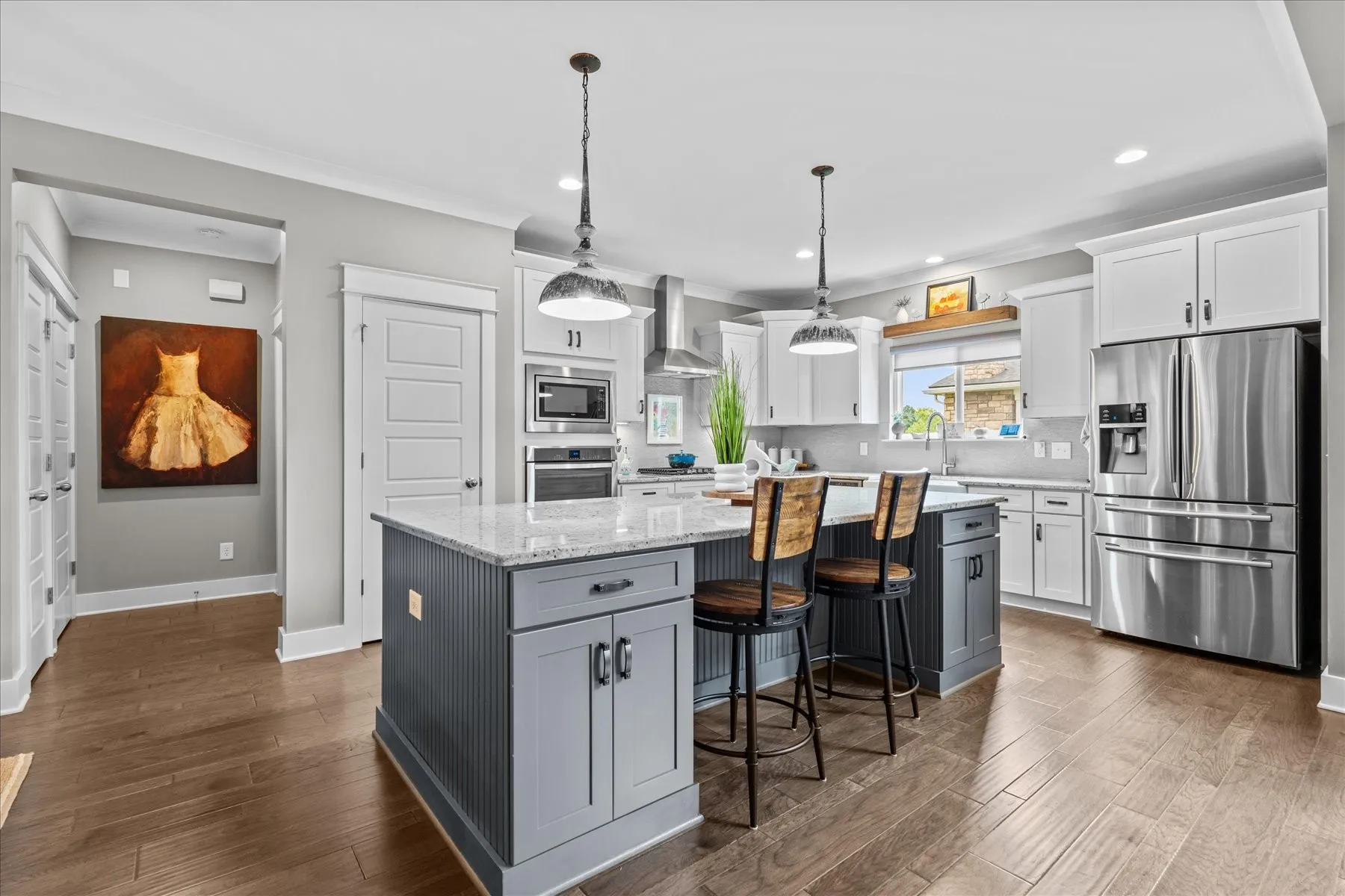 Meticulously maintained 3 bedroom, 3 bathroom home in sought-after Ladd Park. Enjoy main level living with hardwood flooring throughout. The expansive open kitchen is perfect for entertaining and includes a huge island, granite countertops, and two pantries. This home offers tons of upgrades to include custom window treatment for all windows, updated light fixtures, California closets throughout, and more! Upstairs is a spacious bonus room, walk-in storage space that could be a future expansion and a beautifully remodeled bathroom. Entertain on the back patio which features custom motorized shades, and relax on both the covered front porch and the back patio, each featuring painted concrete finished flooring. Irrigation system installed, no backyard neighbors and conveniently located near the community pool and playground. Neighborhood is minutes from I-65 for quick access, 2 pools, 2 playgrounds, walking trails throughout, basketball court, canoe launch, and more!