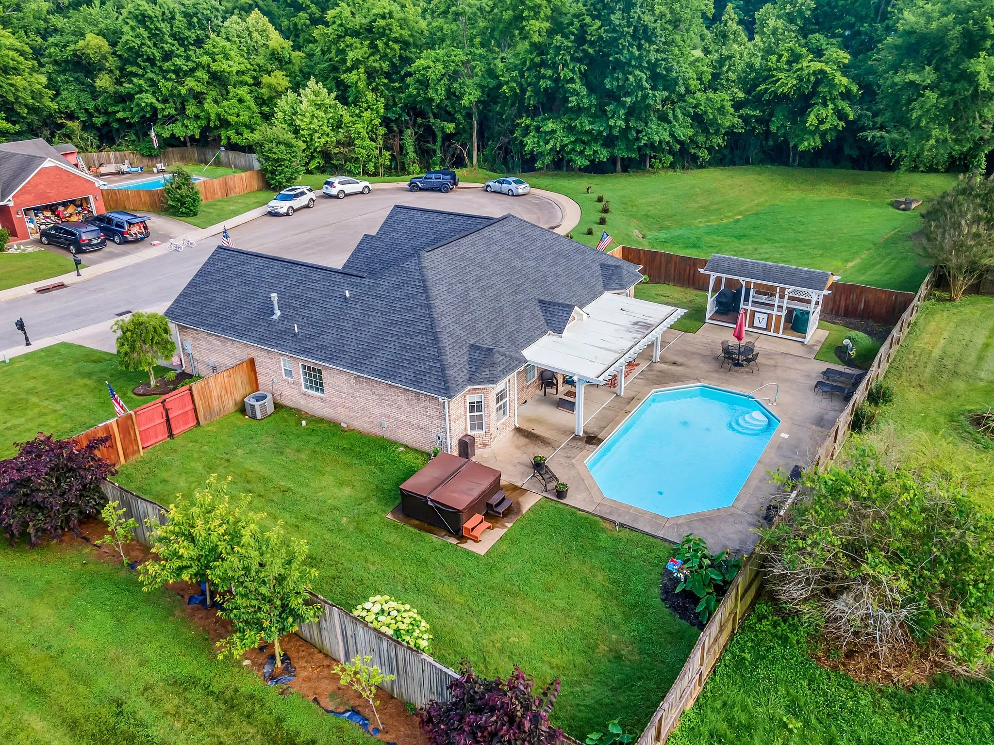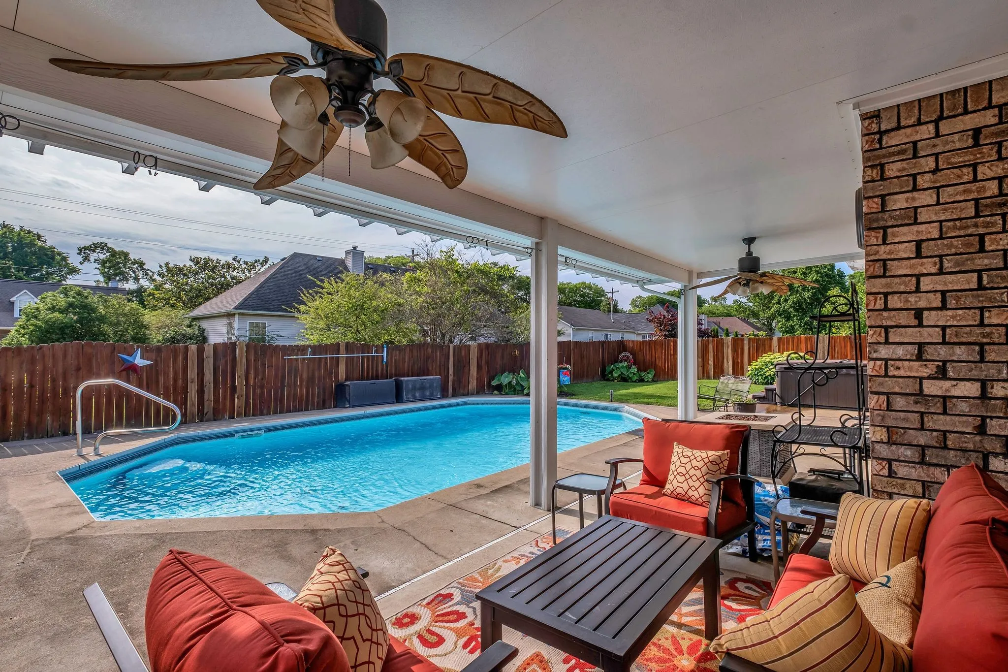 Charming ONE-LEVEL, all-brick home features three bedrooms and two bathrooms, designed with an open floor plan & high ceilings that enhance the spacious feel. The property is entirely step-free, ensuring easy accessibility throughout. Outside, the expansive over half-acre lot includes a luxurious saltwater pool, a relaxing hot tub, an outdoor kitchen perfect for entertaining, and a covered patio ideal for lounging in any weather. Nestled in a peaceful cul-de-sac, this home offers a perfect blend of comfort, convenience and outdoor enjoyment.