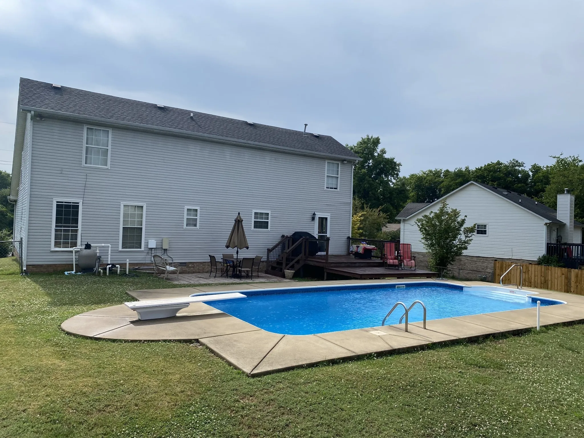 Absolutely Beautiful Home! Stunning SALT Water pool will be professionally opened in spring! See pictures in media. You’ll be glad you did!! Open Floor Plan, Spacious Kitchen! Gas Cooktop! Pantries! Loads of cabinets and open to Formal Dining, Vaulted Ceiling in Living area w/fireplace. NEW pool Pump motor! Master Suite on Main level! Handicap ramp in garage. HVAC 2 years. Walk in attic Storage! Large fenced Yard with multilevel Deck. Plus Patio and Storage Building! Save Big with NO HOA. And have your very own private pool, no crowds and you can have pool parties !!!