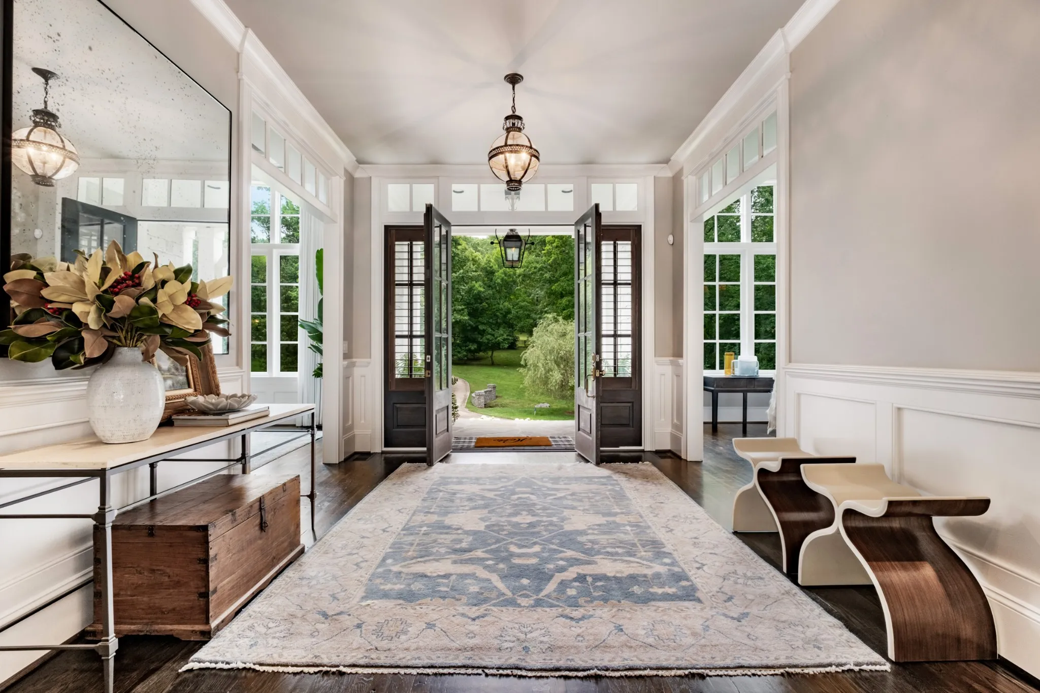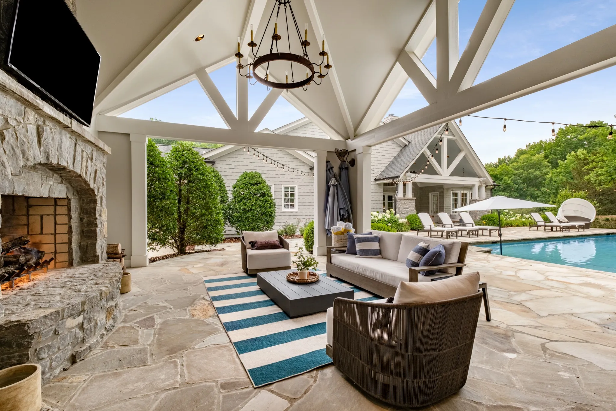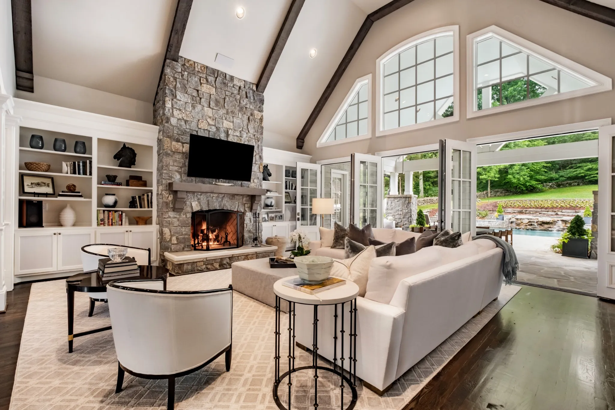 Gated, Private and wooded Five Acres. Davidson/Williamson County line Convenience. Traditional architecture inspired by Cape Cod. Exterior of Stone and Cedar. Transitional Interiors. Open Great Room, Kitchen and Breakfast Rooms flooded with light, broad site lines through the home and Soaring Ceilings. Exceptional Finishes. Lodge size Stone Fireplaces. Primary and Two Suites on the Main Level of over 3,500 square feet! Private Guest Suite upstairs. Pool Pavilion with Outdoor Kitchen and Exercise Room. Resort-Size Pool with ‘Beach’ and Waterfall is the focal point of the Stone Terrace with Large Covered Porch.