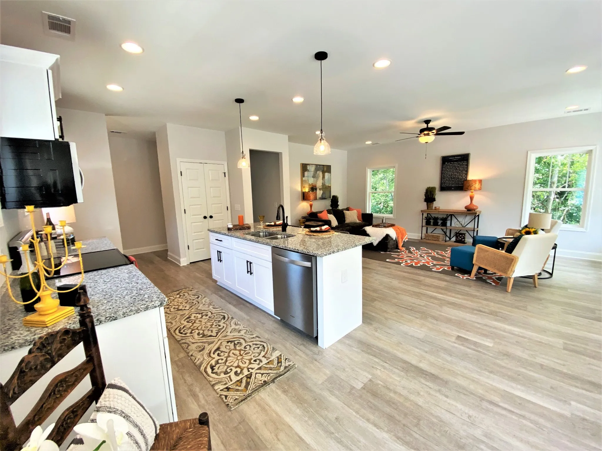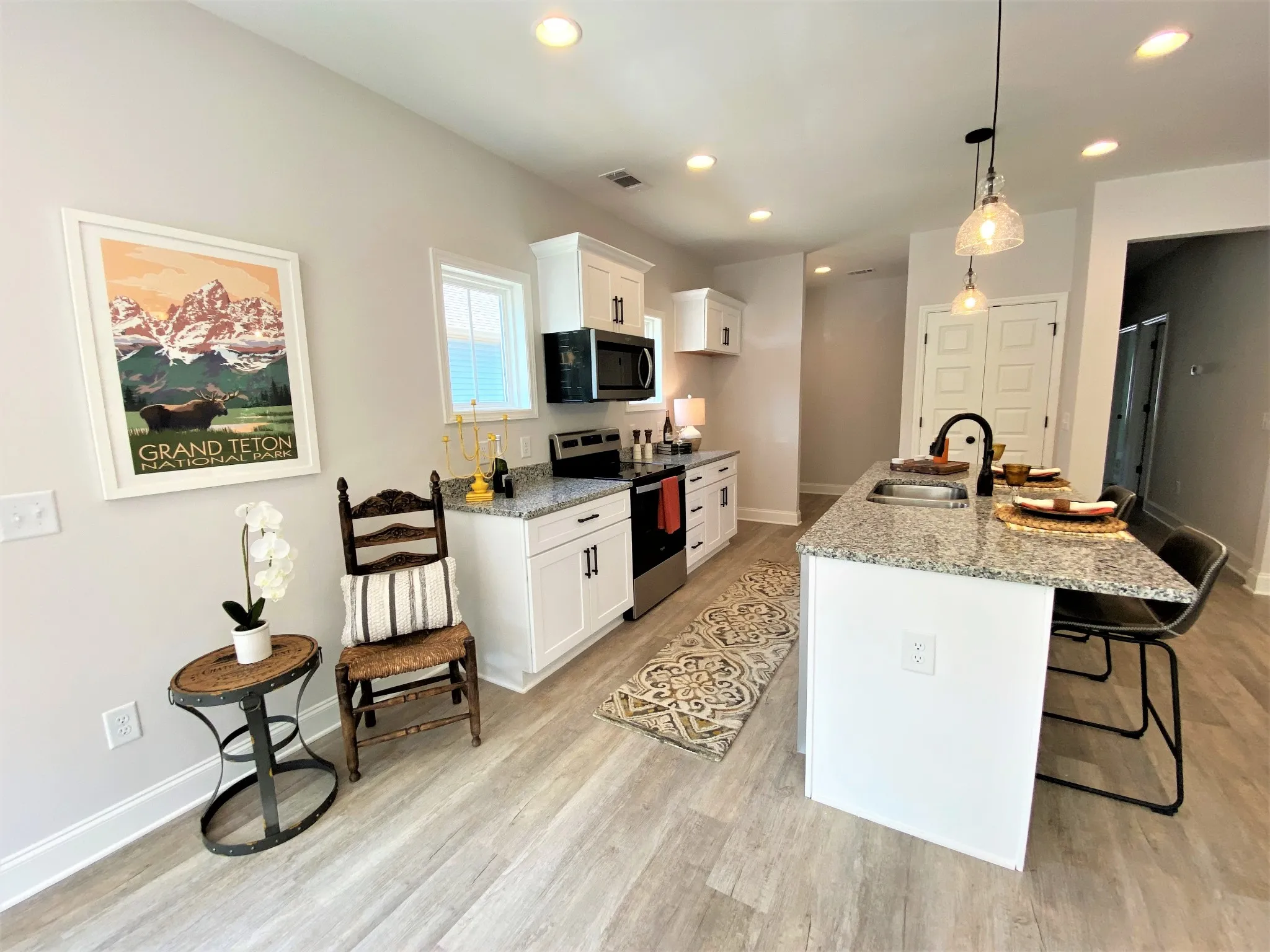 All one level home with 3 bedrooms and 2 bathrooms. Covered front porch. Open floor plan. Granite countertops, stainless steel appliances, pantry, walk-in master closet, large master bath with tile shower and separate soaking tub.