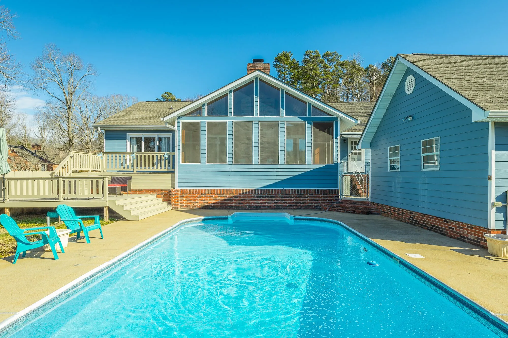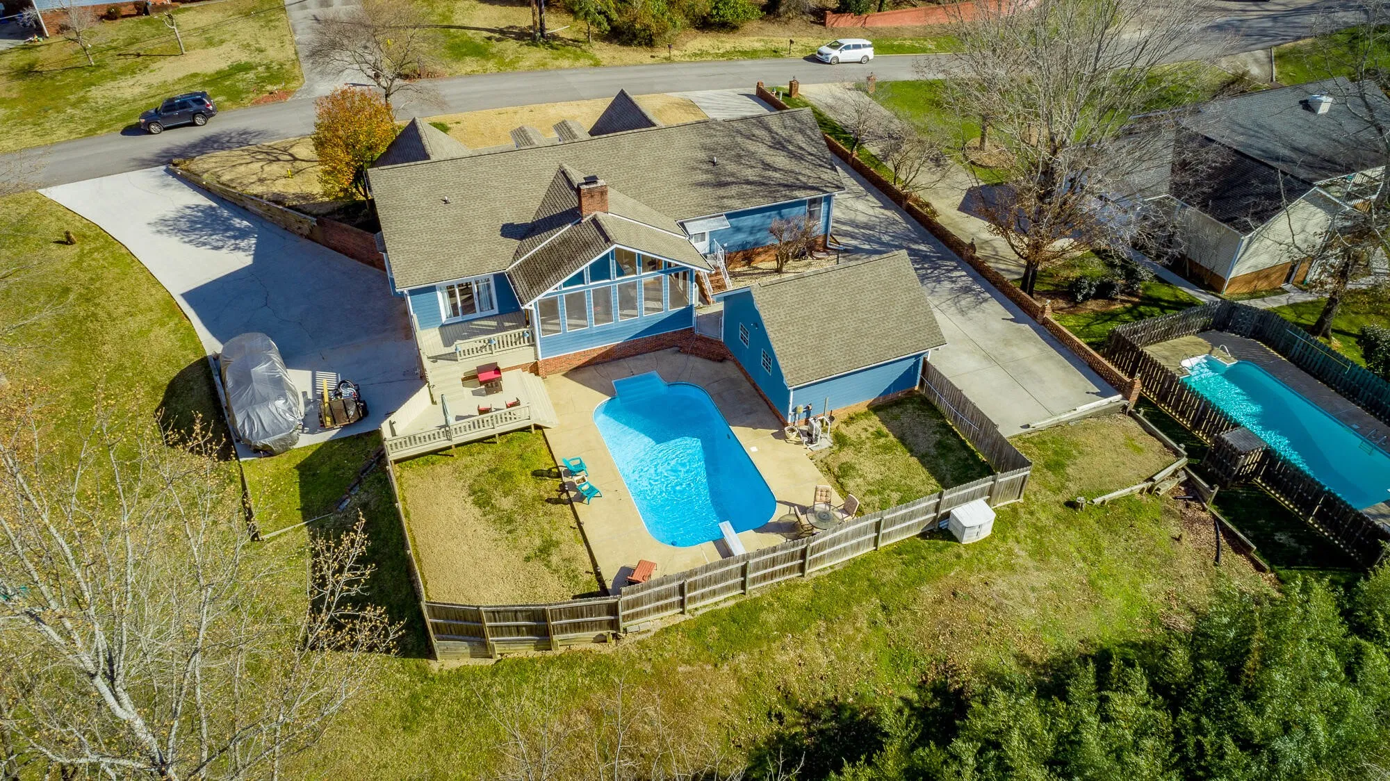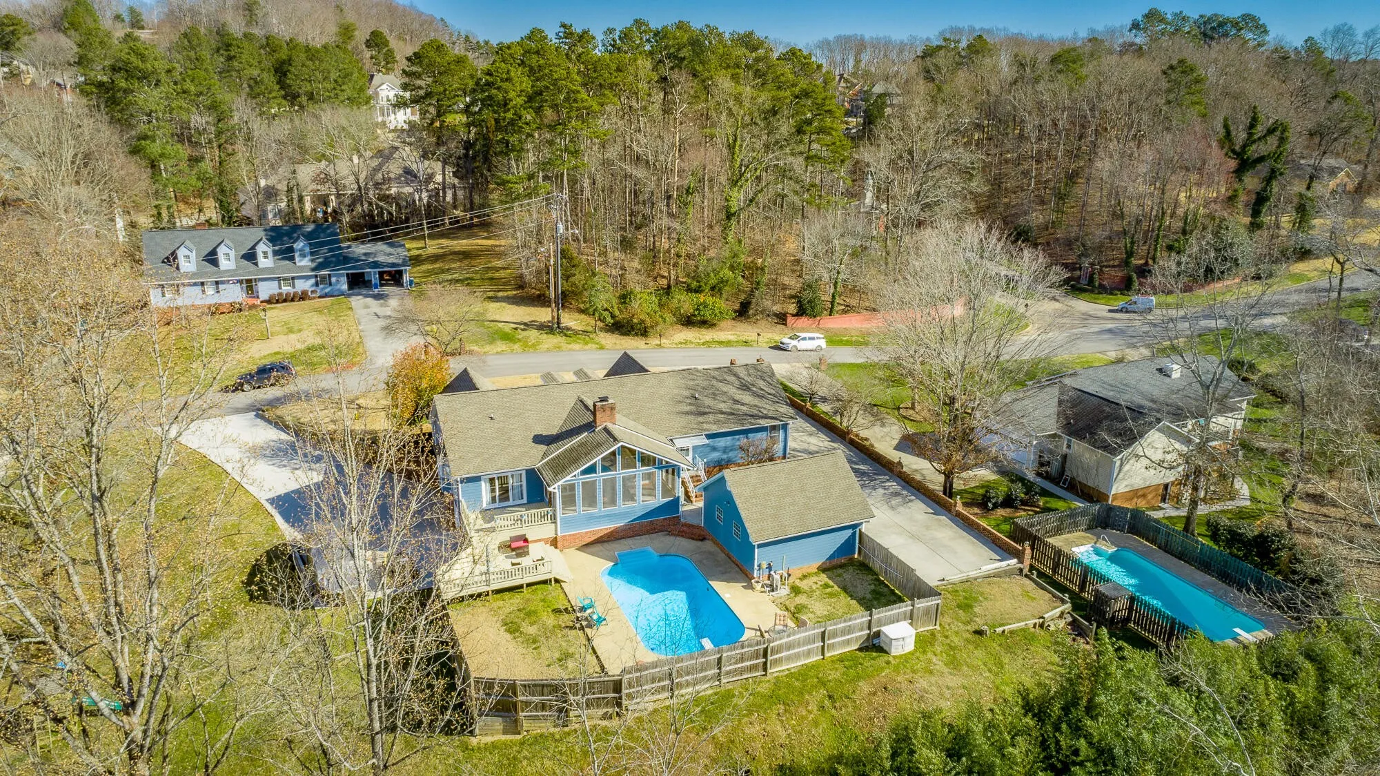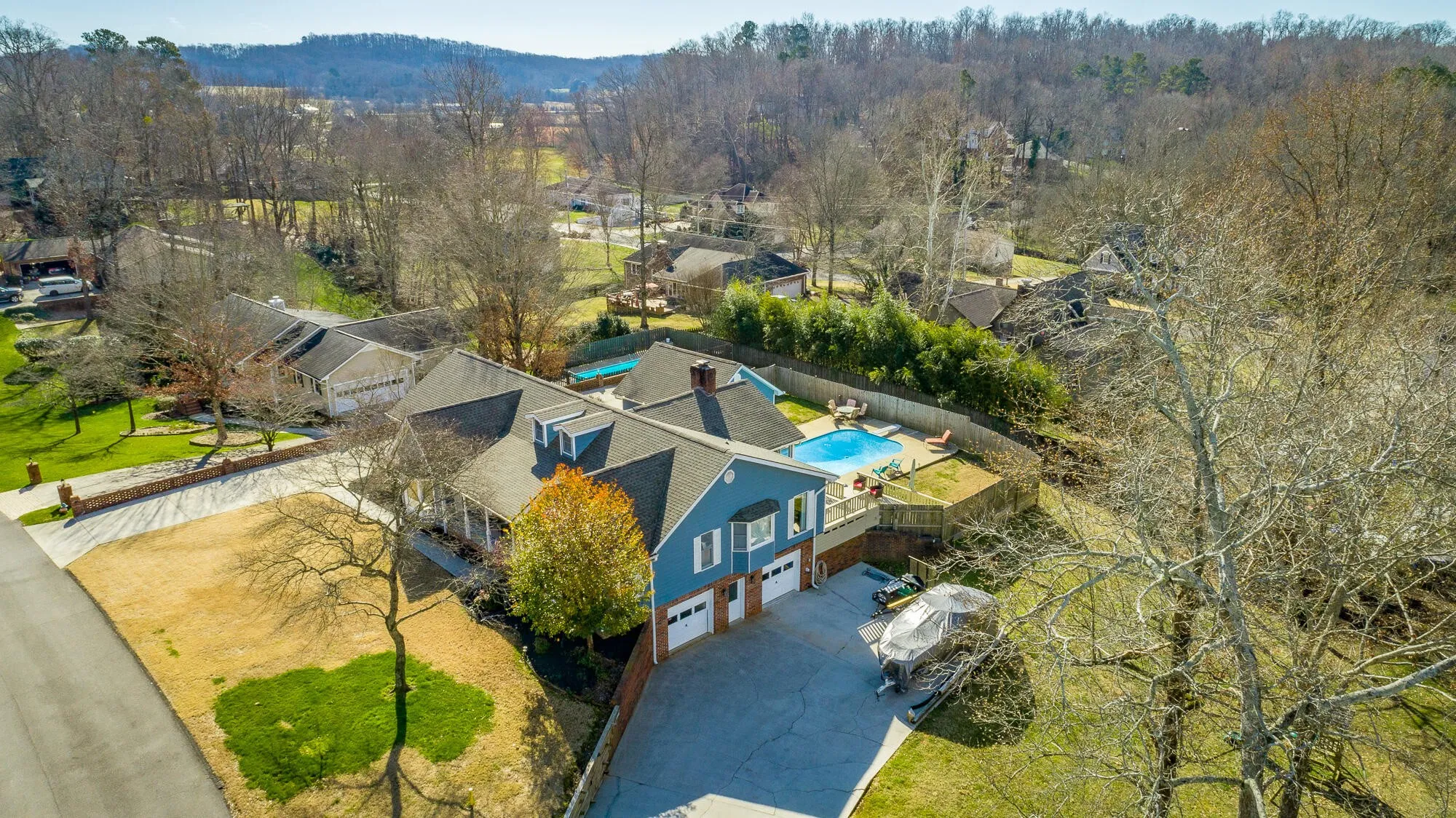 This home has it all! Enjoy gatherings in this family style one level home as you lounge by the refreshing in-ground pool. Watch the neighborhood activity from your large front porch. When entering the front door you can’t help but notice the expansive wood ceiling in the family room with wood burning fireplace. Large gatherings will spill nicely onto the huge vaulted screened porch area. New deck will lead you to the amazing pool with plenty of room for grilling and sporting activities. Back inside, the large kitchen offers plenty of solid wood cabinets, corian counters and side buffet. Storage is a premium with a cabinet pantry plus an additional walk in pantry. Laundry room is extra large with plenty of more storage and leads to upper level garage. Down the hall on main level you will find two nice sized bedrooms and bath. The main level Master Suite is extra large and offers an amazing floor to ceiling view of the level front yard. Master Bath has nice closet, shower, double vanities and tub. Nice multi-use area is accessible through the master bath and from the great room and could be used for additional closet space, private office, exercise room or even a playroom. Downstairs you will find a newly remodeled multi-purpose space that is currently being used as a bedroom/den area. Also you will find downstairs a two car garage, lower driveway with electrical plug-in outlet for RV and plenty of storage. Upper driveway offers 24×24 third garage bay. Plenty of space for car collection or RV/boat storage. Don’t miss an opportunity to call this property HOME! Some updates include New Roof and gutters 2018, New Deck 2020, Multi-purpose space in basement 2020, New pool pump 2018, New water heaters 2018 & 2021, New Oven and dishwasher 2019.
