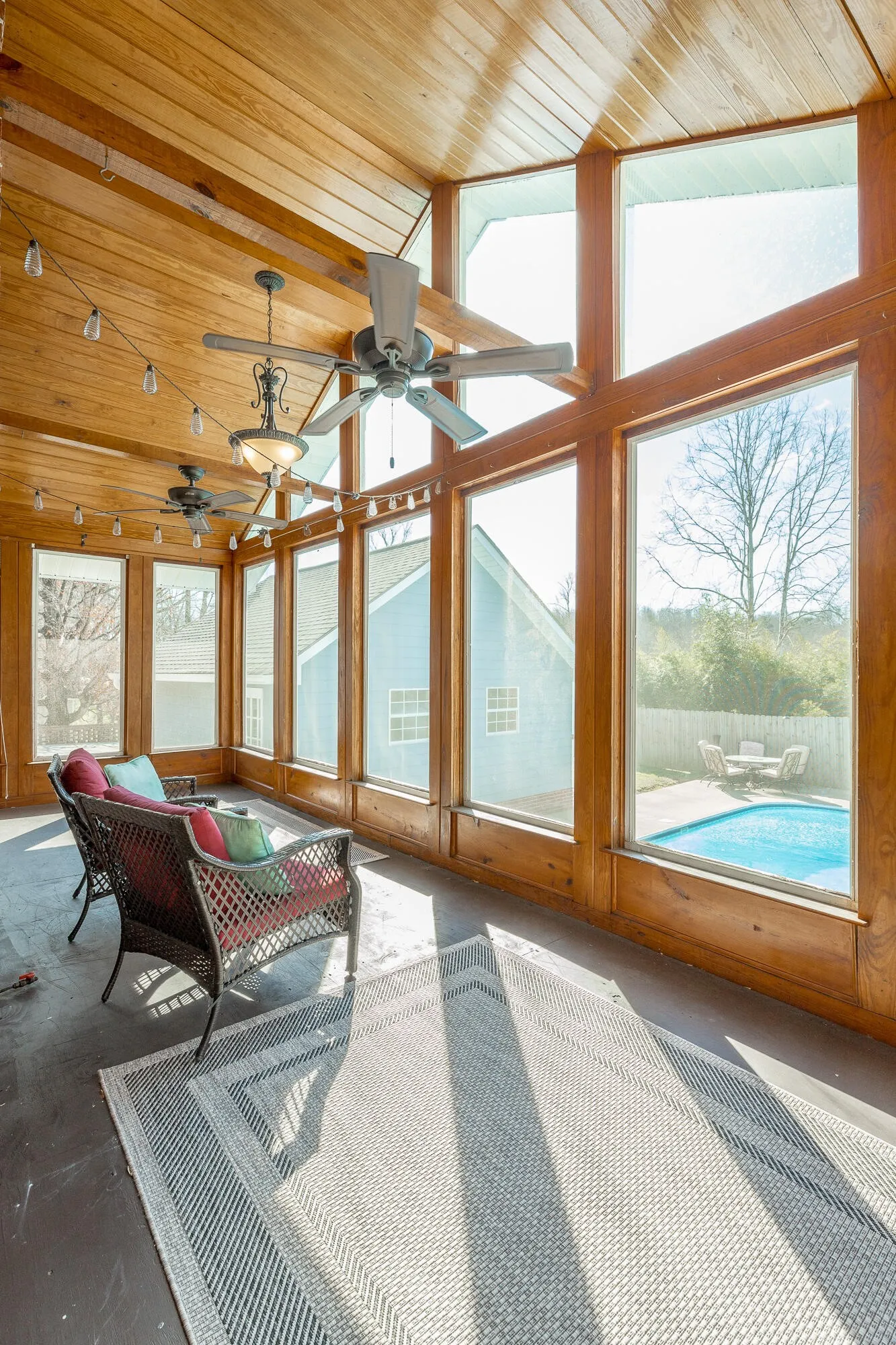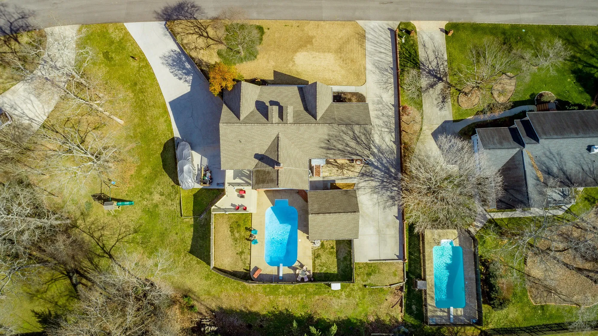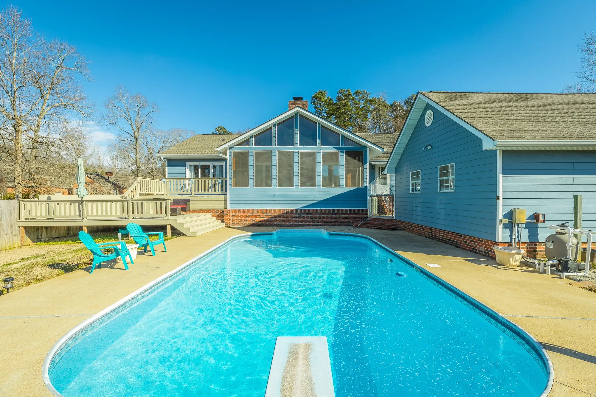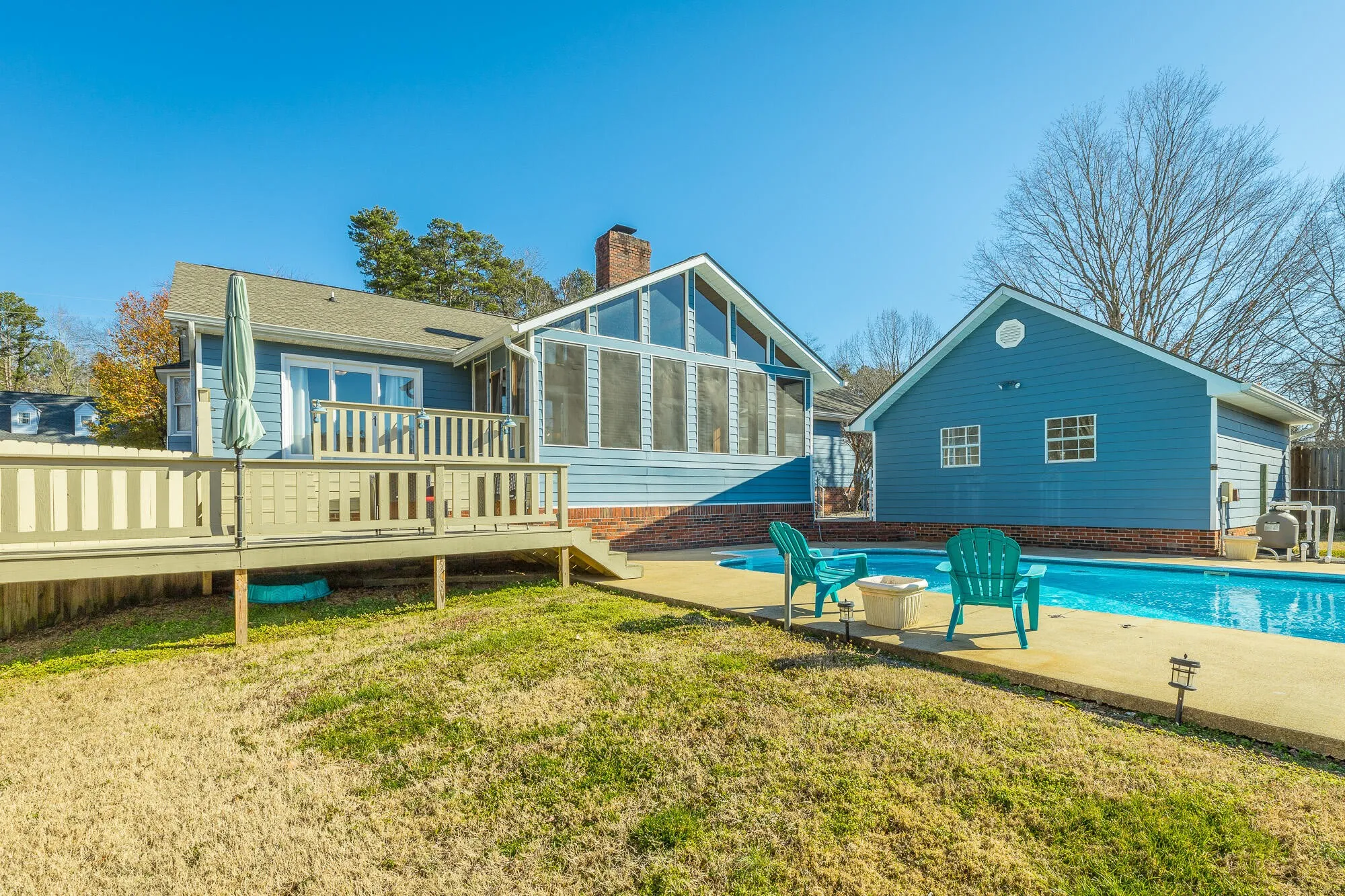 This home has it all! Enjoy gatherings in this family style one level home as you lounge by the refreshing in-ground pool. Watch the neighborhood activity from your large front porch. When entering the front door you can’t help but notice the expansive wood ceiling in the family room with wood burning fireplace. Large gatherings will spill nicely onto the huge vaulted screened porch area. New deck will lead you to the amazing pool with plenty of room for grilling and sporting activities. Back inside, the large kitchen offers plenty of solid wood cabinets, corian counters and side buffet. Storage is a premium with a cabinet pantry plus an additional walk in pantry. Laundry room is extra large with plenty of more storage and leads to upper level garage. Down the hall on main level you will find two nice sized bedrooms and bath. The main level Master Suite is extra large and offers an amazing floor to ceiling view of the level front yard. Master Bath has nice closet, shower, double vanities and tub. Nice multi-use area is accessible through the master bath and from the great room and could be used for additional closet space, private office, exercise room or even a playroom. Downstairs you will find a newly remodeled multi-purpose space that is currently being used as a bedroom/den area. Also you will find downstairs a two car garage, lower driveway with electrical plug-in outlet for RV and plenty of storage. Upper driveway offers 24×24 third garage bay. Plenty of space for car collection or RV/boat storage. Don’t miss an opportunity to call this property HOME! Some updates include New Roof and gutters 2018, New Deck 2020, Multi-purpose space in basement 2020, New pool pump 2018, New water heaters 2018 & 2021, New Oven and dishwasher 2019.