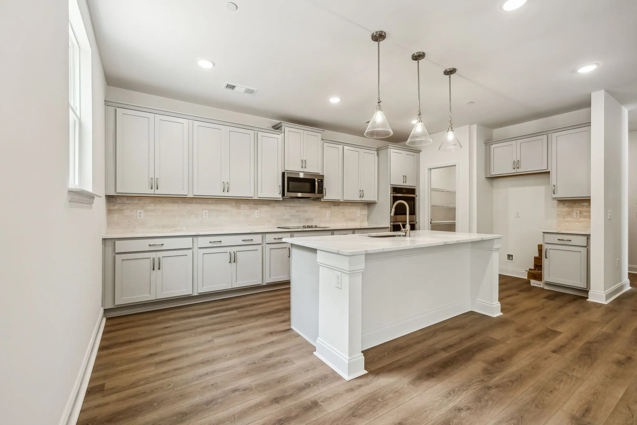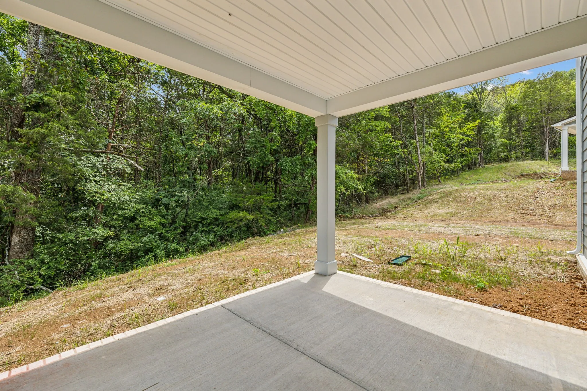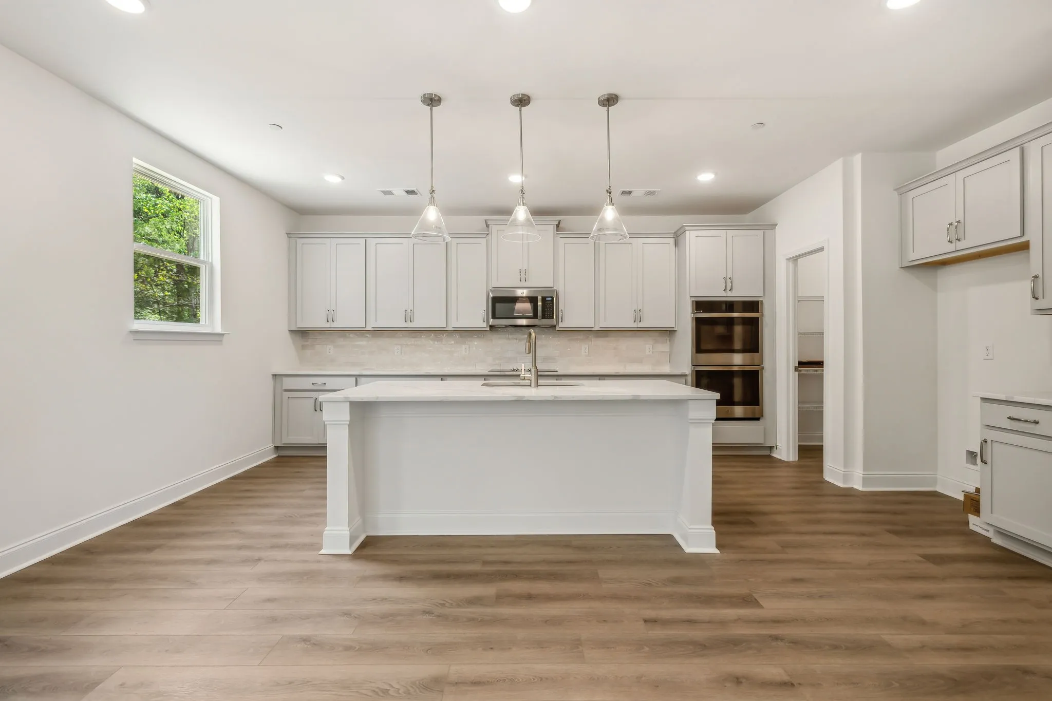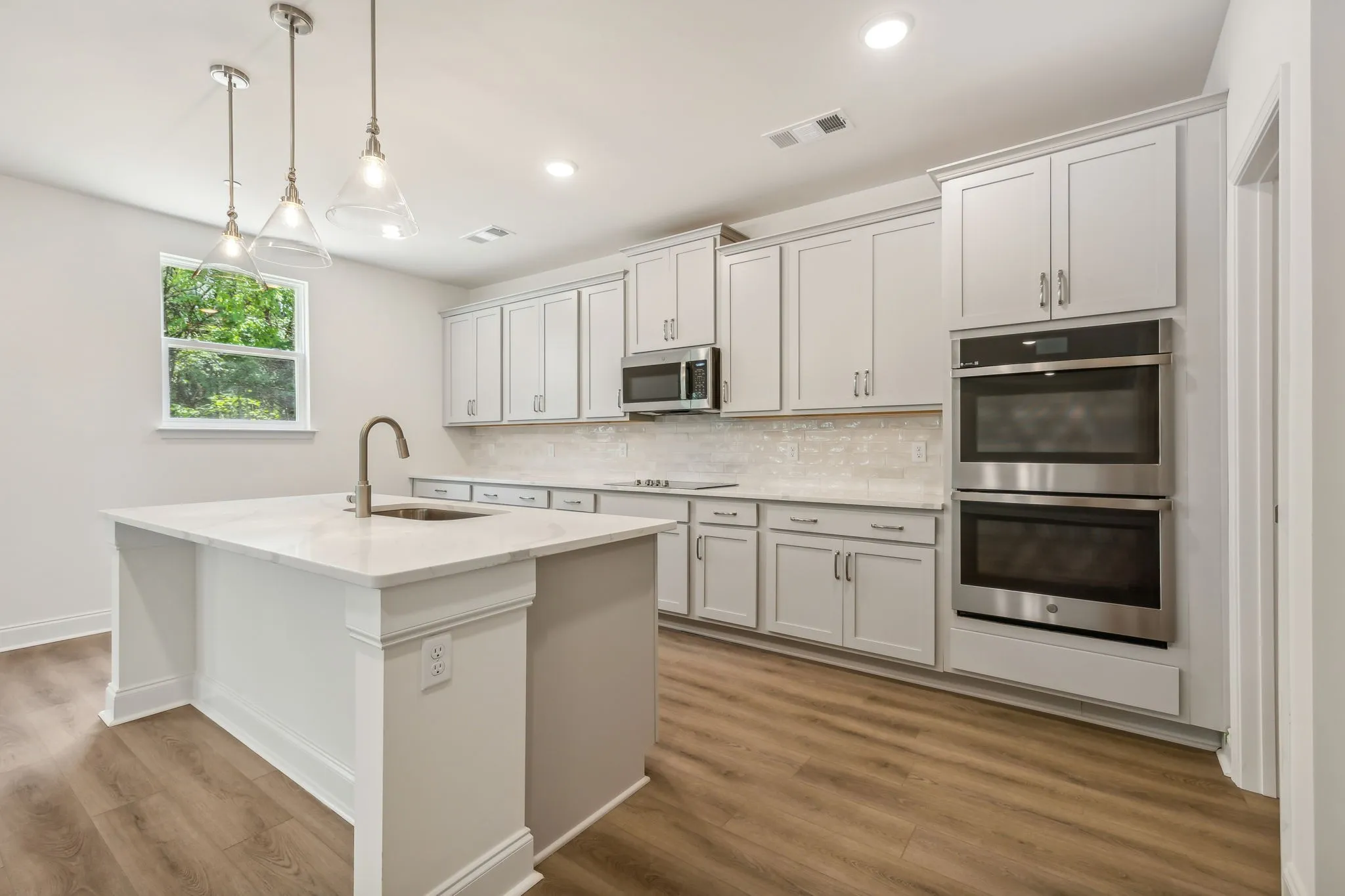 Our Lancaster Plan on wooded homesite. The home includes a 3 Car Garage, covered patio, Oak hardwoods stairs, gourmet kitchen with double ovens, a cooktop and oversized island. Main level guest suite is perfect for extended family or guests. The primary suite is spacious and the bathroom features a free standing tub and tile shower with bench seat.