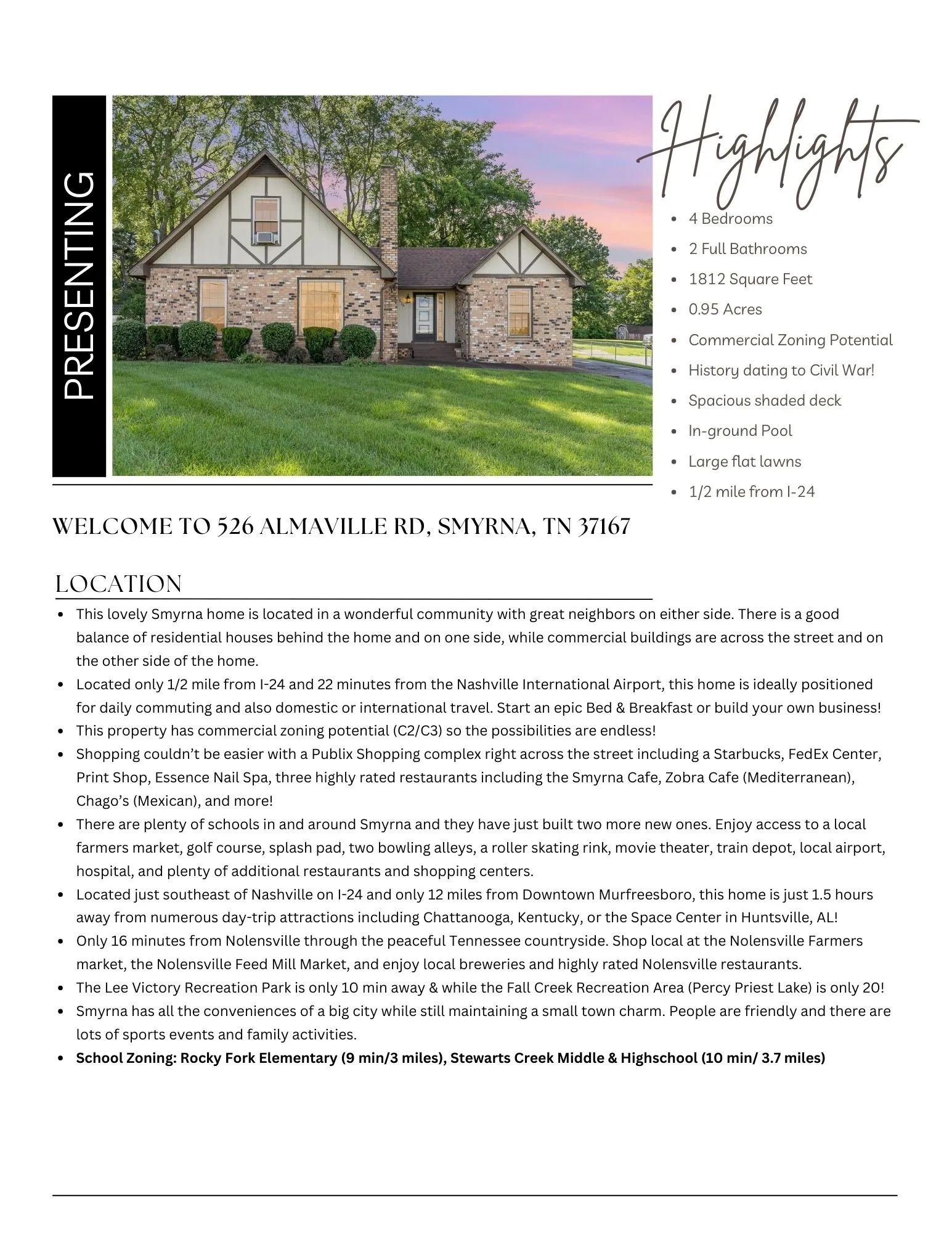 INTRIGUING HISTORIC CHARM! This beautiful property is original birthplace of Civil War hero, Sam Davis, and also the final resting place of Judy Garland’s great great Grandfather. Start an epic Bed & Breakfast in this lovely 4 bed/2 bath home or build your own business! Commercial zoning potential (C2/C3) & ideally located just ½ mile from I-24 and only 18 miles from the Nashville Airport! Nearly an acre in size, this large lot boasts mature shade trees, spacious flat lawns, an in-ground pool, entertaining area on a spacious shaded deck, & privacy fencing lining the back of the lot. Walk to Publix & Starbucks right across the street! 7 minutes from Downtown Smyrna, 16 min from Nolensville & 16 min from Downtown Murfreesboro with many trendy restaurants, local coffee shops & plenty of live music. 20 min from Percy Priest Lake & 26 from Cedars of Lebanon State Park! Don’t pass up this gem & entrepreneurs dream!