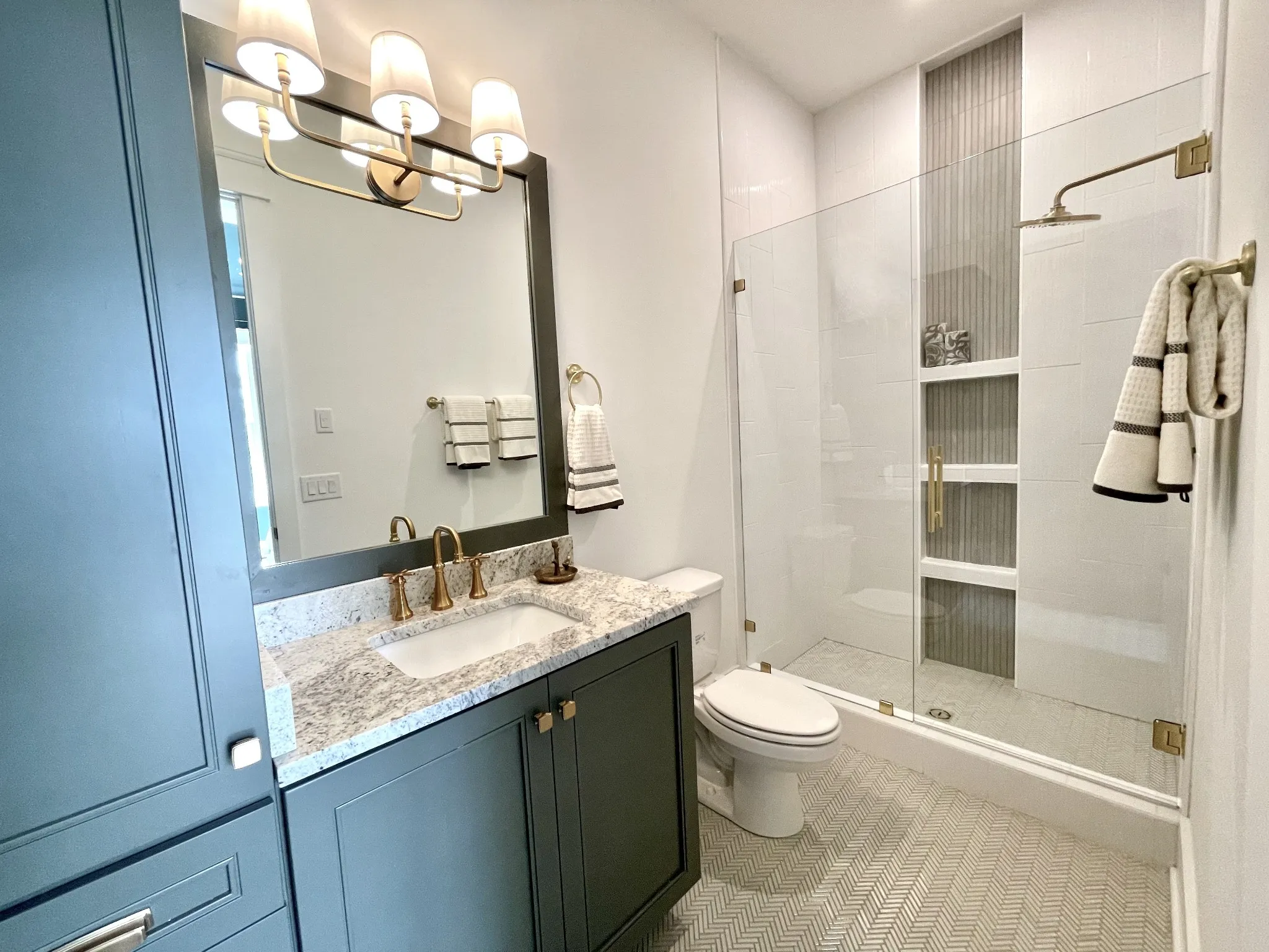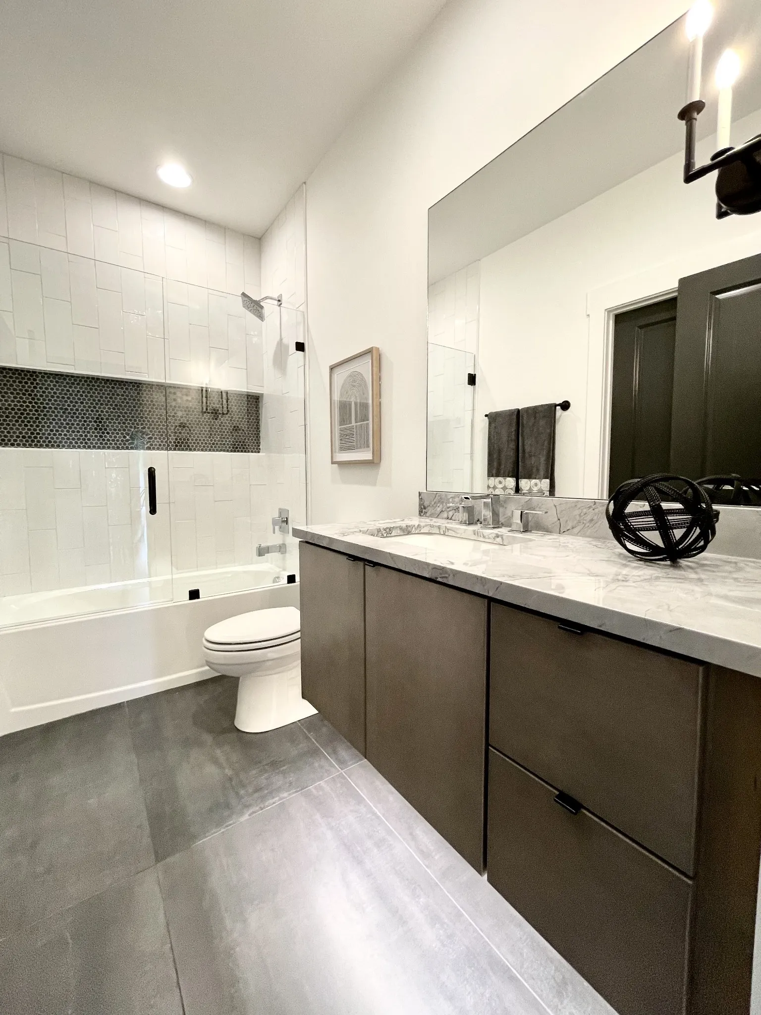 "LongDescription" => "Secondary bathrooms include Quartz or Granite counter-tops with oval undermount sink, 12x24 designer tile floor & tile tub surround to ceiling with framed glass tub/shower enclosure."