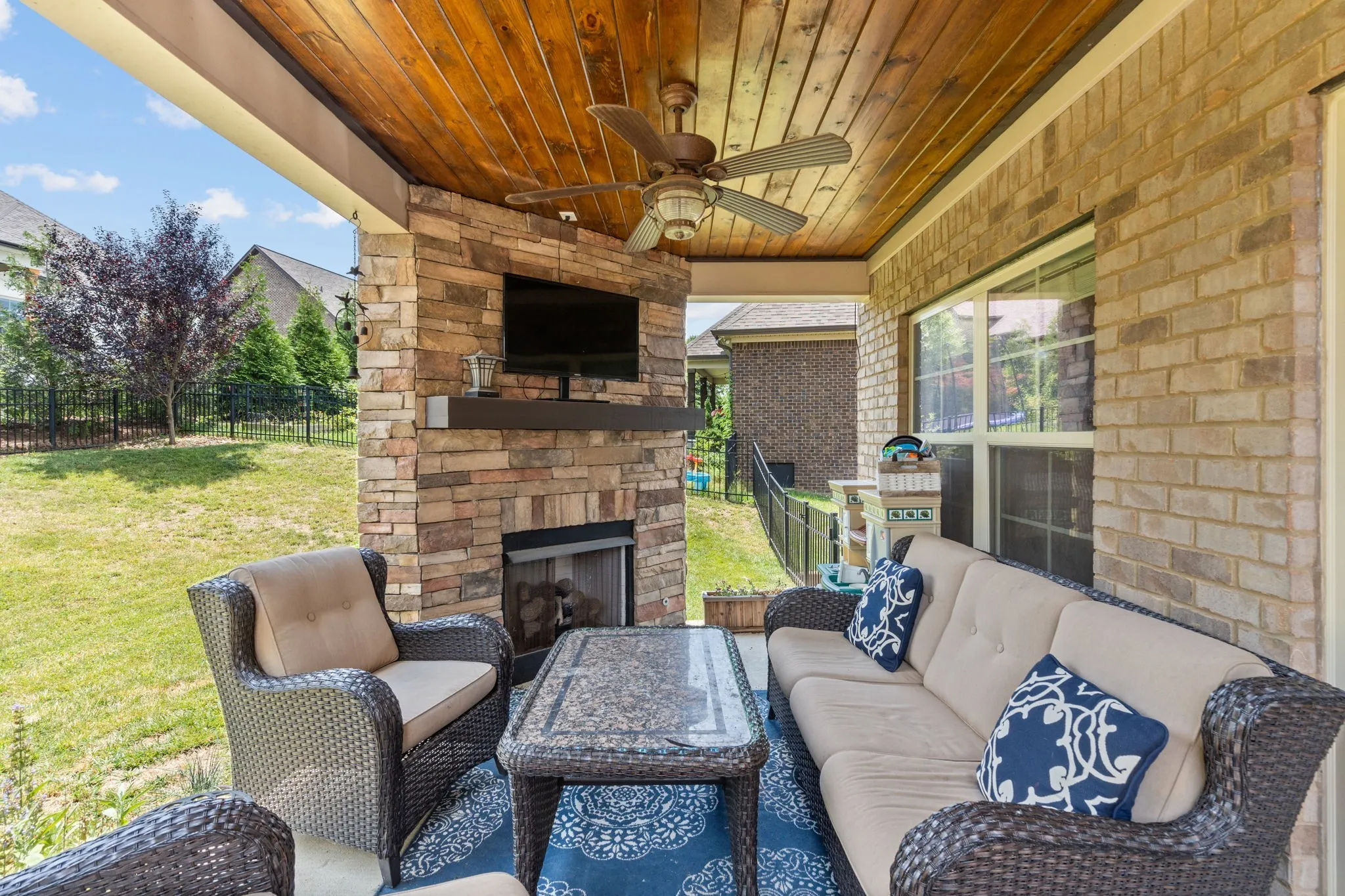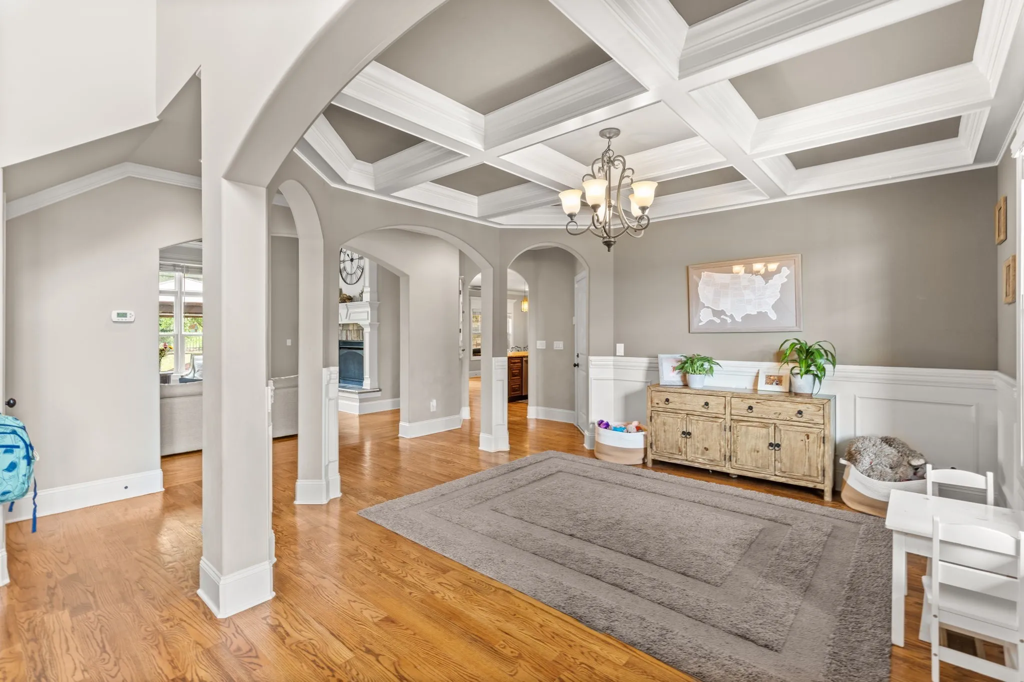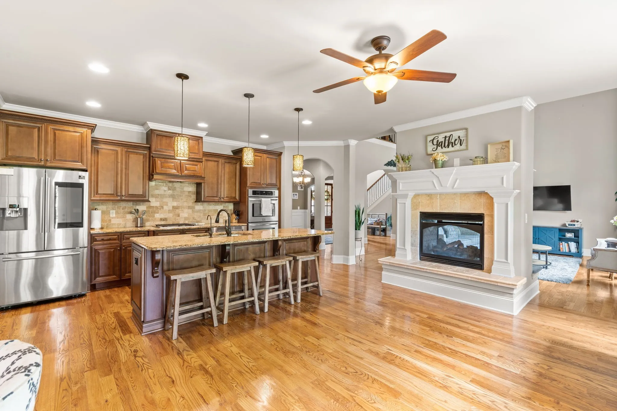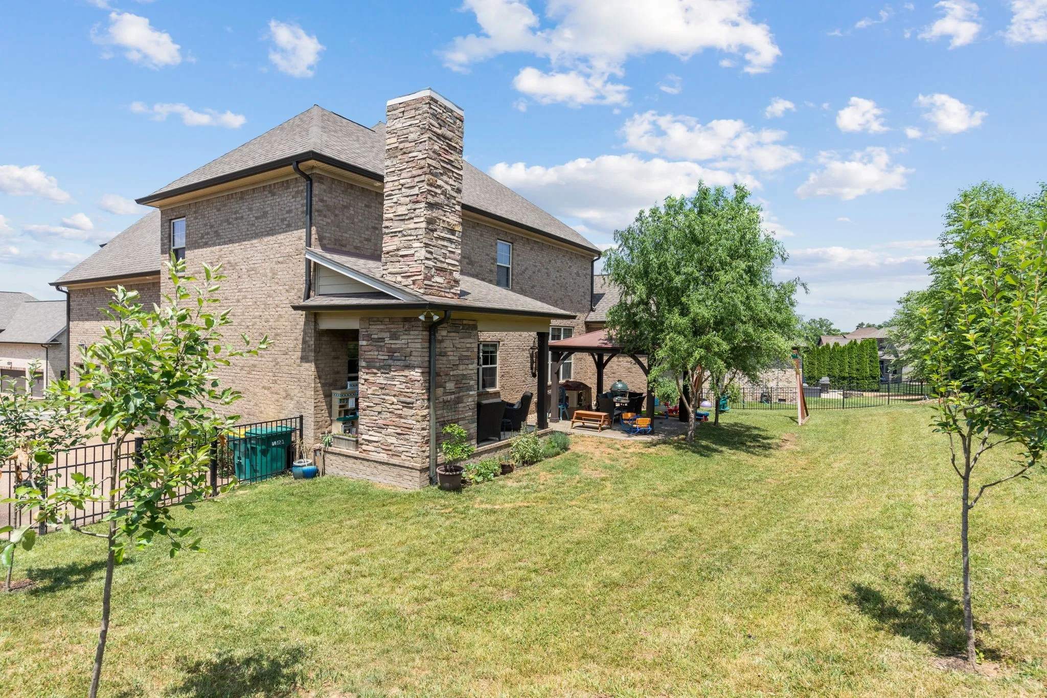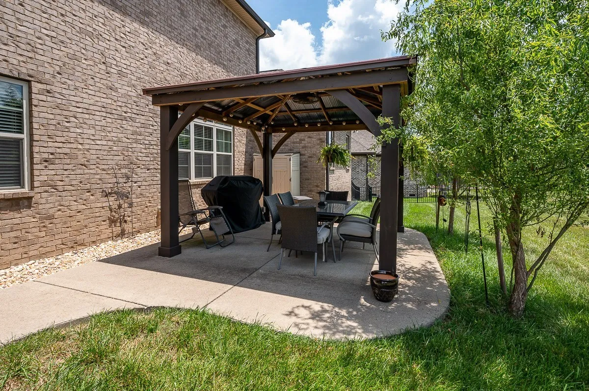 A slice of Suburban heaven conveniently located next to the new June Lake development, I-65 exit, highly sought after schools, and within walking distance to the community pool! Main floor features vaulted ceilings, formal dining room, primary bedroom and an office which could be used as 5th bedroom. The double sided Fireplace opens up the main living space to the kitchen and eat-in nook areas. Upstairs boasts extra storage space, an additional 3 bedrooms and a huge over the garage bonus room with a wet bar! Step into the backyard for relaxing nights by the outdoor fireplace or entertain under the pergola and market lights. 3 Car garage. Welcome to your next home!