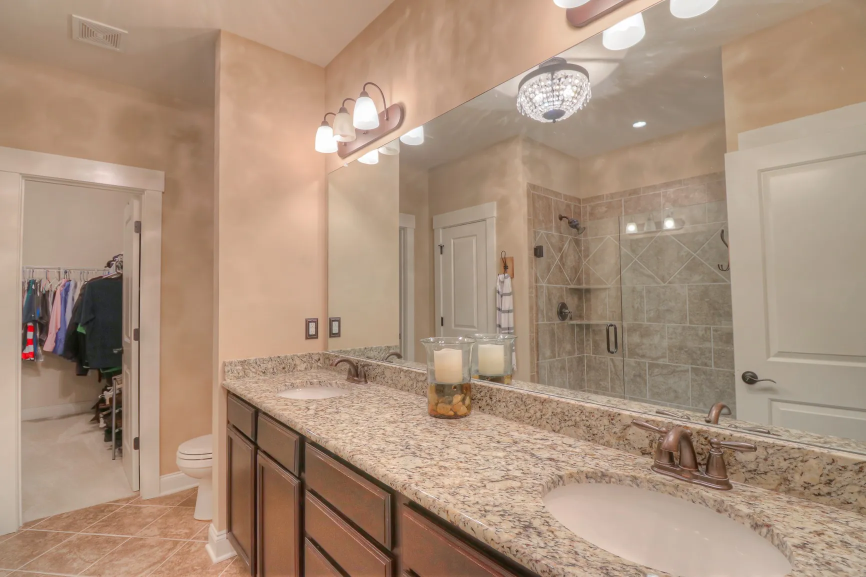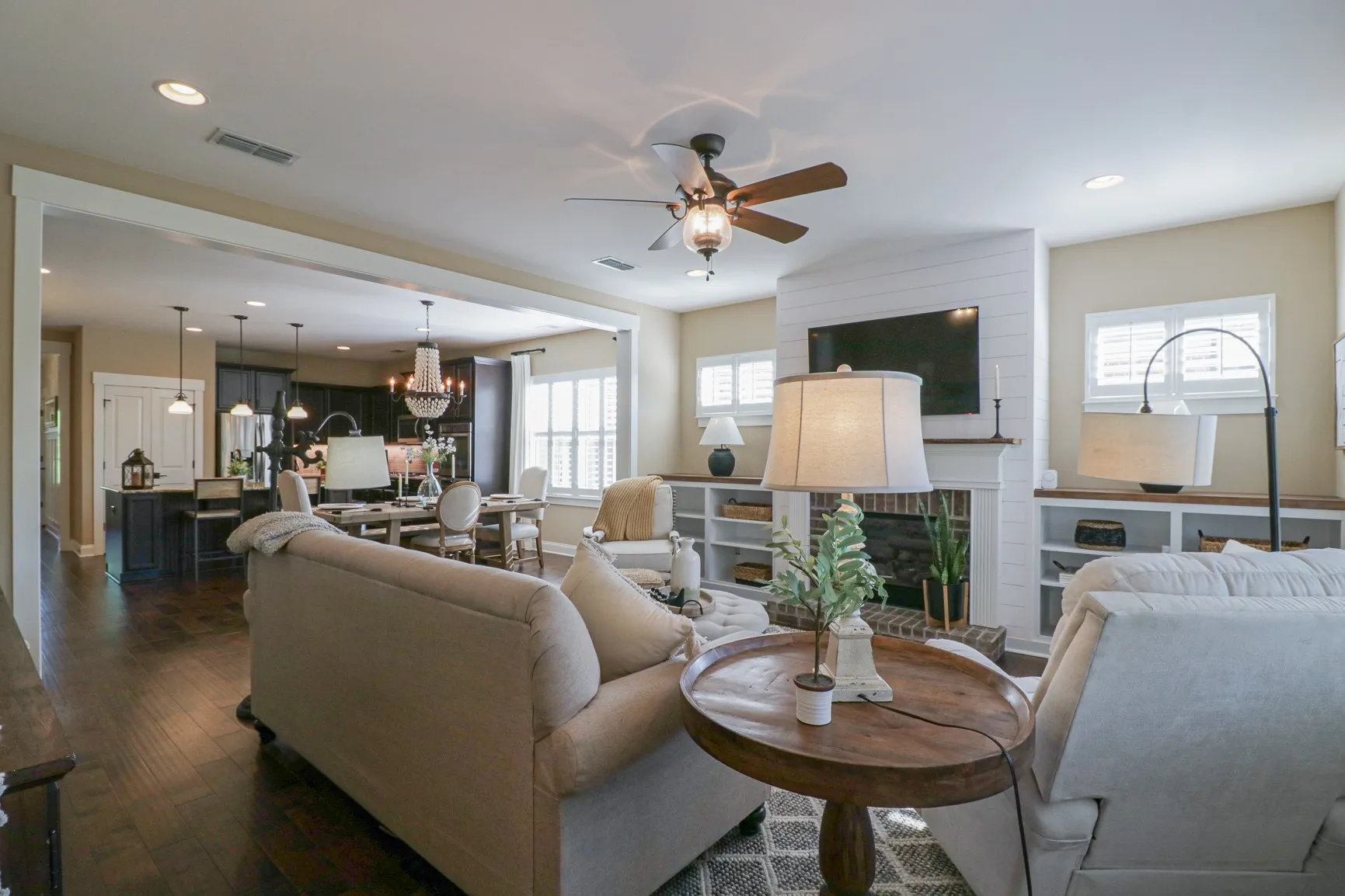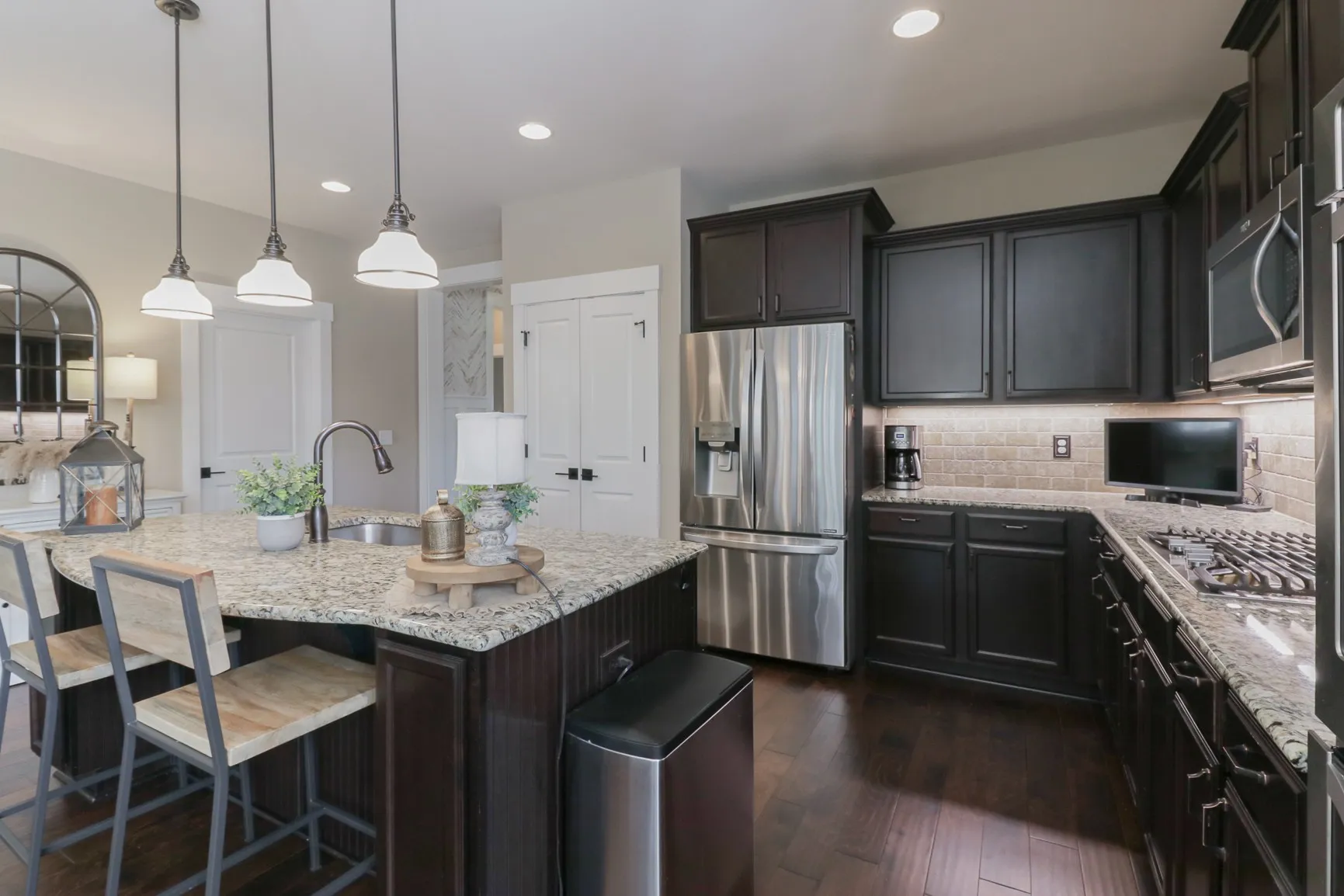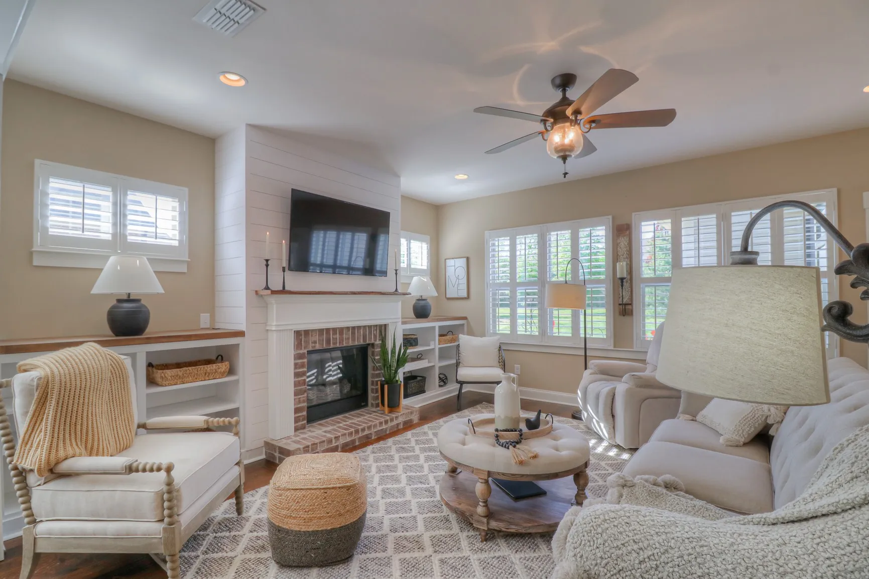 Backs to common area!~2 steps to inside from rear garage~1.5 stories~3BR down~Bonus Rm up+finished 9×6 storage room (could be made into extra bathroom)-Warm comforting colors-Stainless kitchen appliances offer double ovens, gas cooktop~Granite counters in kitchen and master bath~Under cabinet lighting in kitchen~Wood Floors entry/kitchen/den~Wood stairs~Fireplace w/built-ins and gas logs~Plantation shutters~Abundant recessed lighting~Covered 14×10 rear screened in porch with bead-board ceiling, recessed lights, connects to clean 2 car garage with floors professionally epoxy coated~Irrigation system front & rear lawn~Two walk-in attics!!!~Plumbed for gas grill at rear porch-Garage!