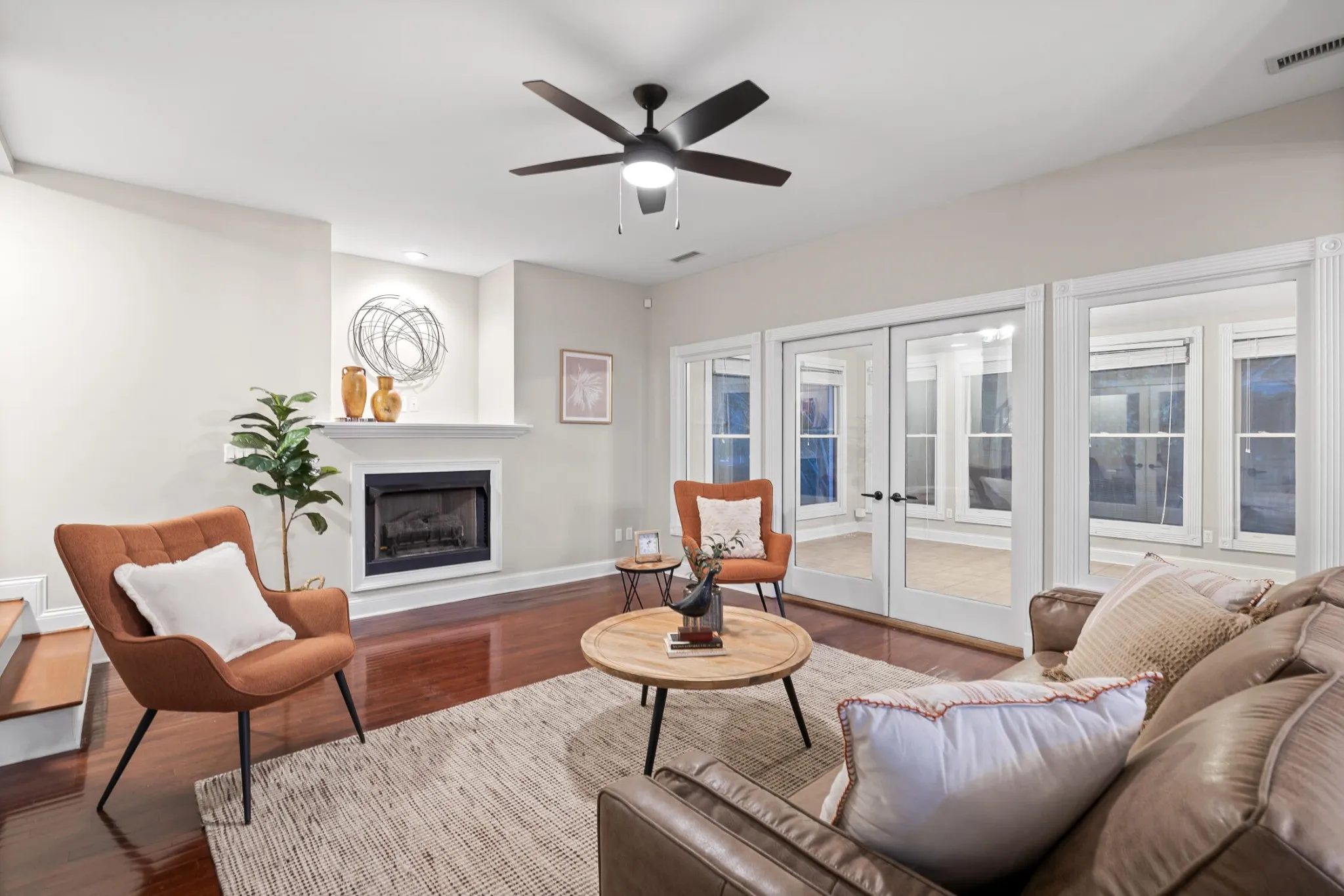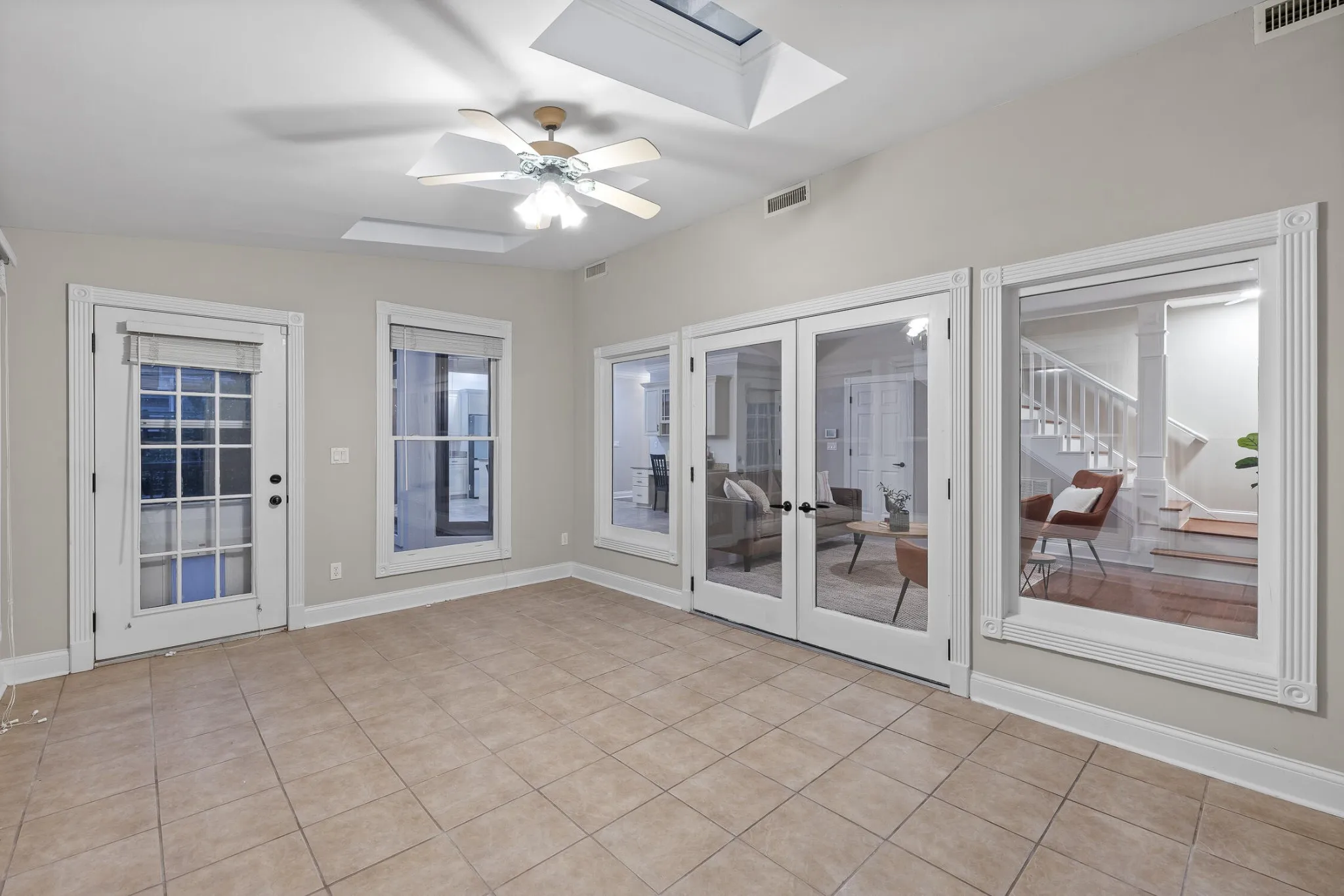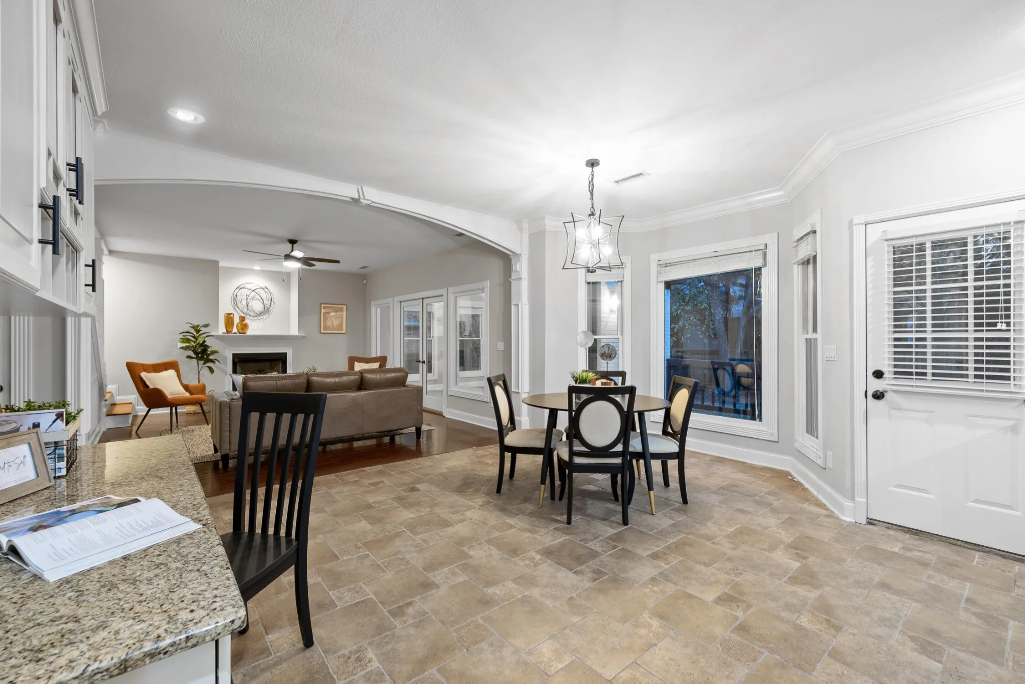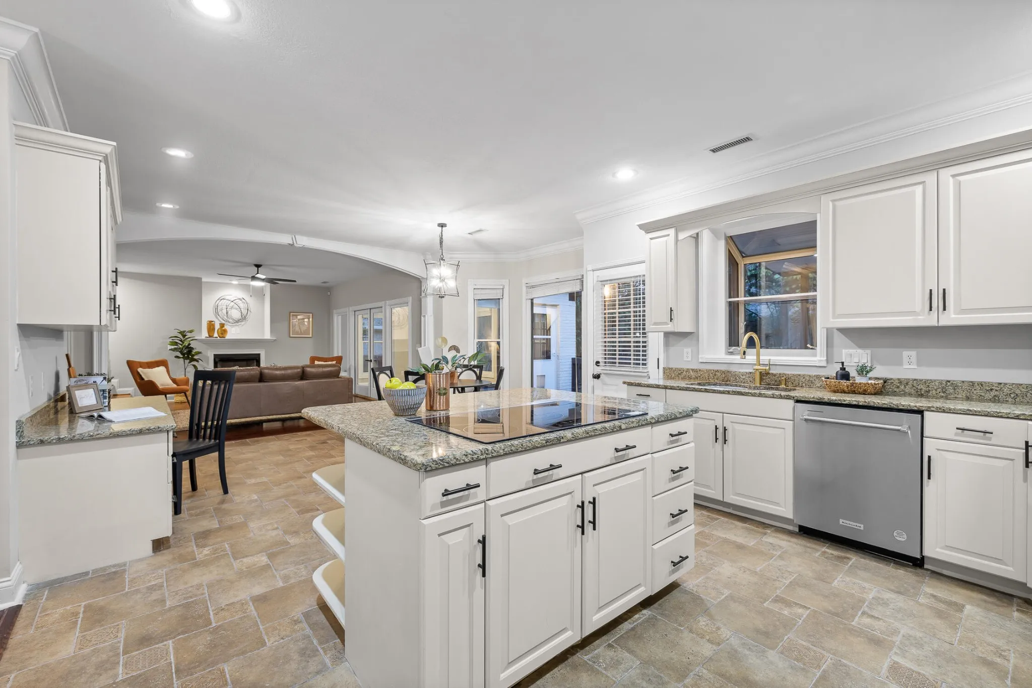 The kitchen flows seamlessly into the gathering room, a cozy haven complete with a gas fireplace and French doors that open to the vaulted sunroom.