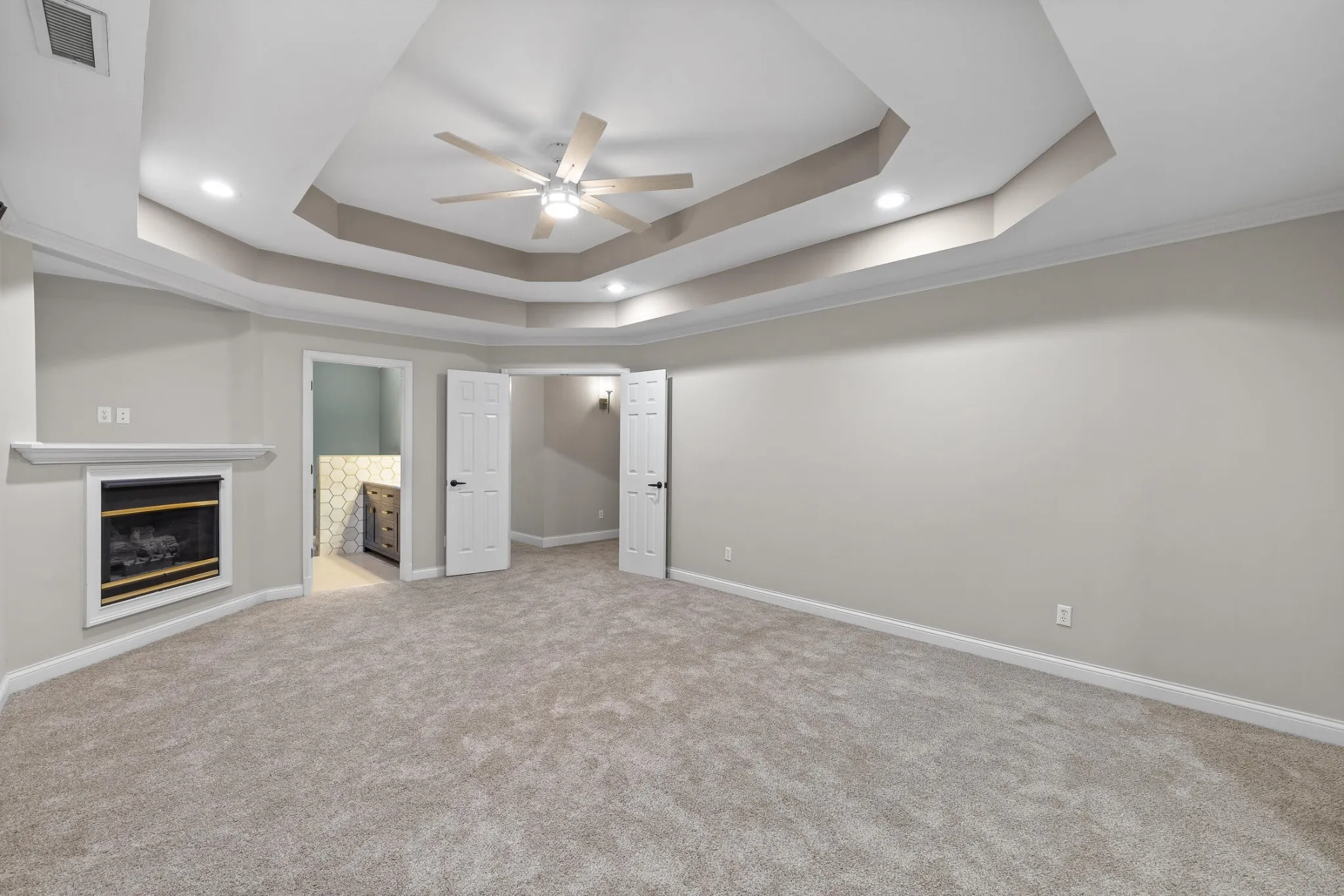 Upstairs, the spacious master suite beckons, offering a gas fireplace, a trey ceiling, and a lavish master bath that defines opulence. This spa-like oasis boasts a double vanity, a soothing soaking tub with a glass block window and skylight, a separate marble tile shower, and a generously-sized walk-in closet that will leave you in awe.