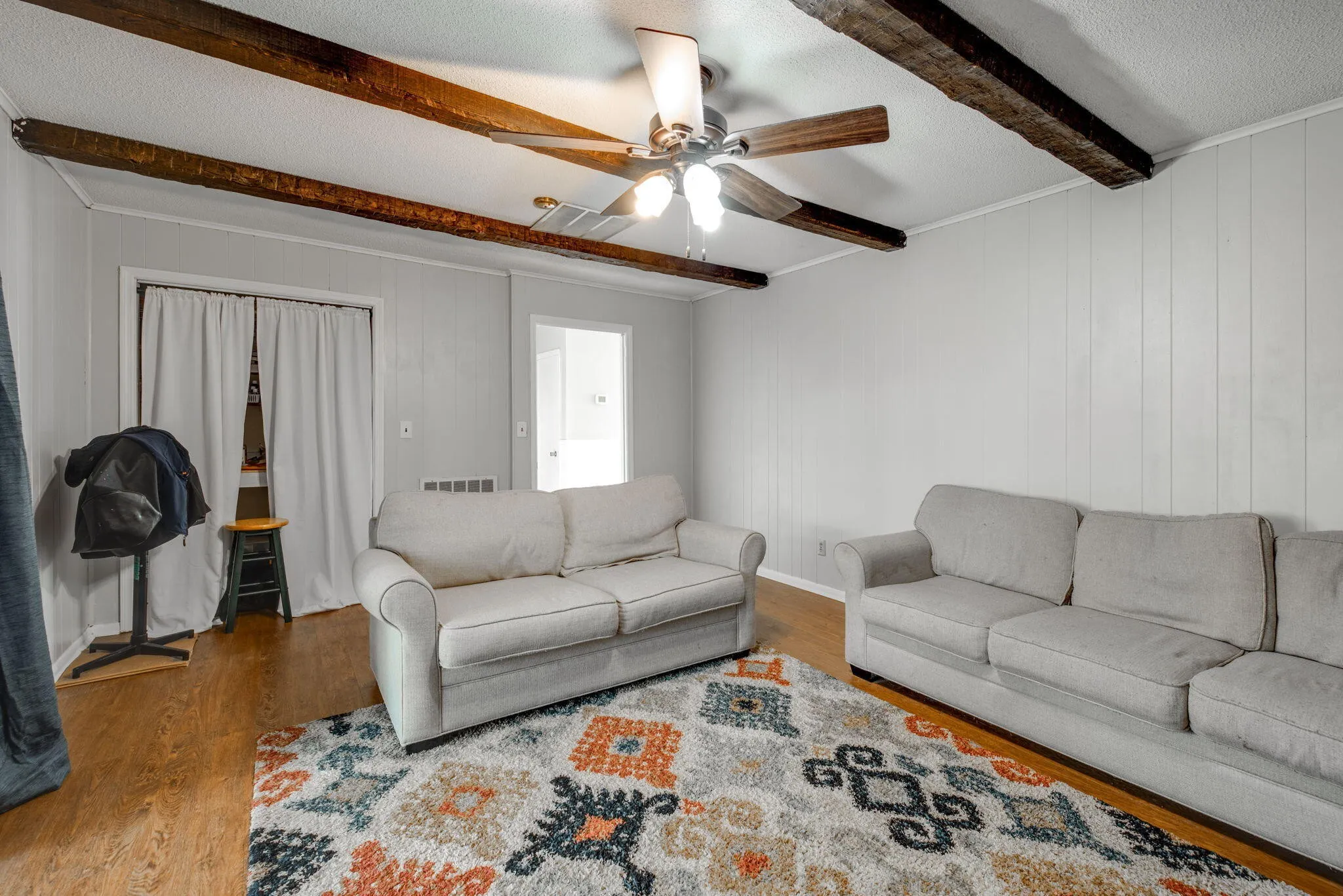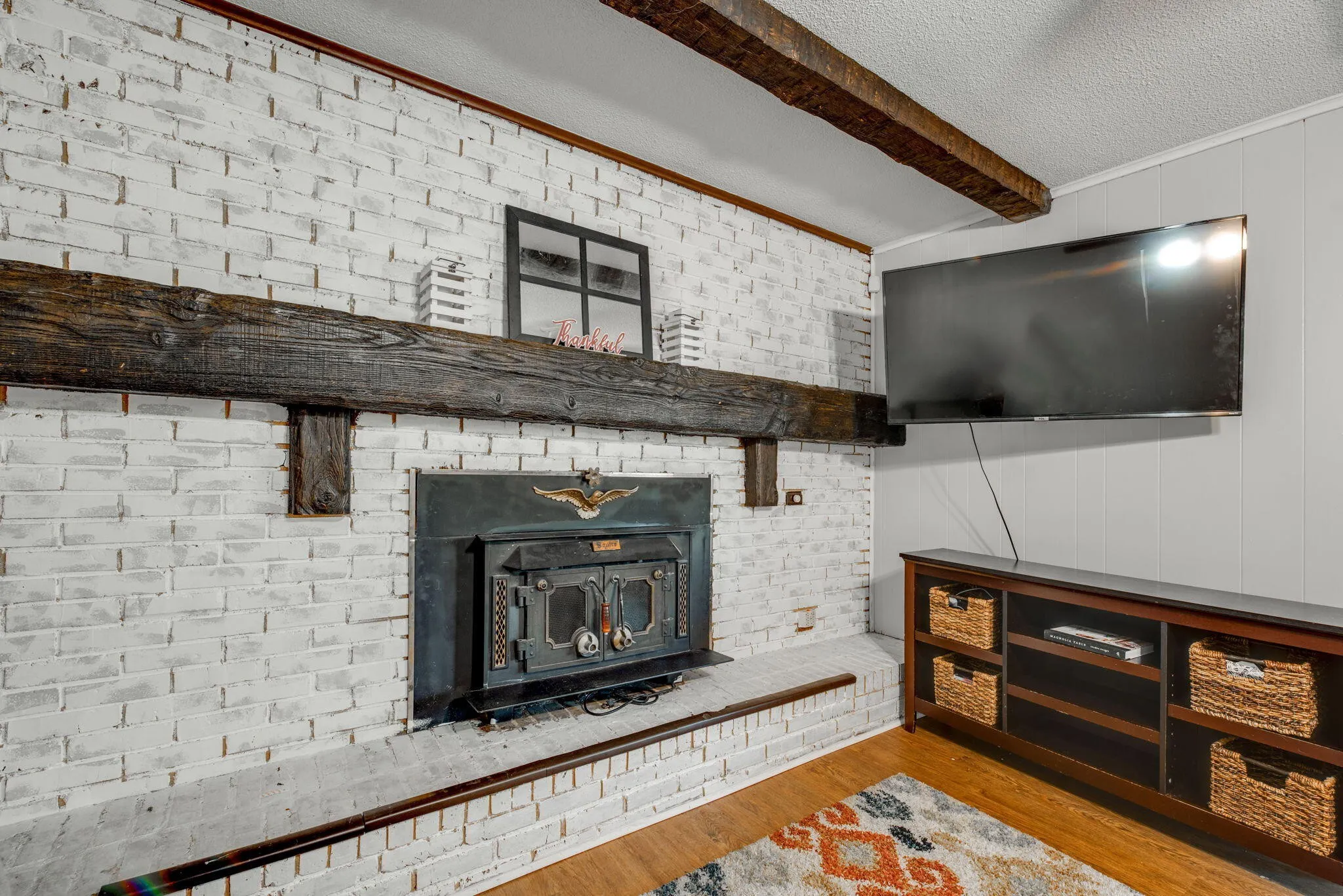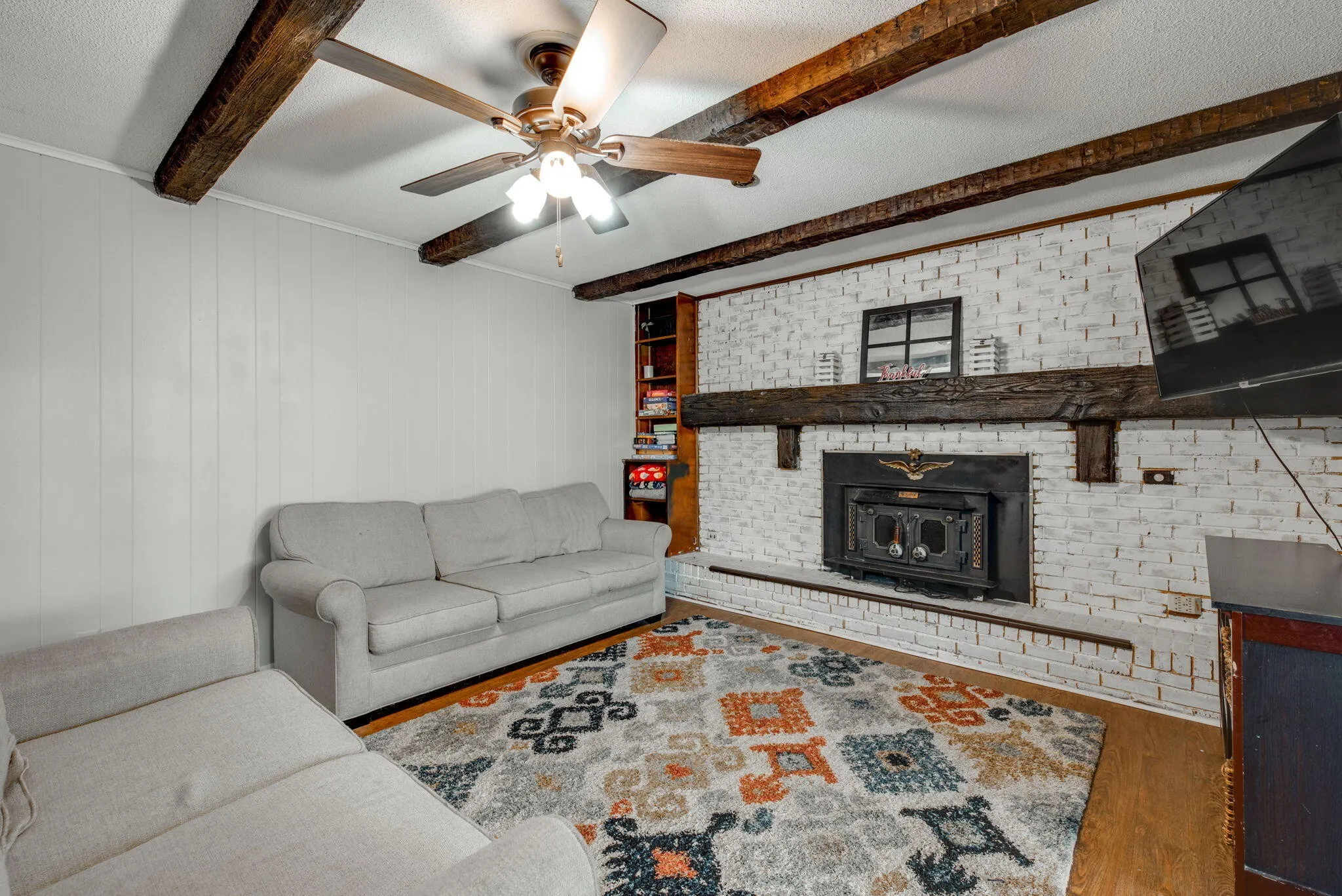 The eat-in kitchen features stainless steel appliances, new flooring, and ample space for entertaining. Off the kitchen is a good sized laundry room and access to the backyard and garage. The family room is a cozy retreat with a wood burning fireplace, exposed beams, and built-ins, perfect for creating lasting memories with loved ones.