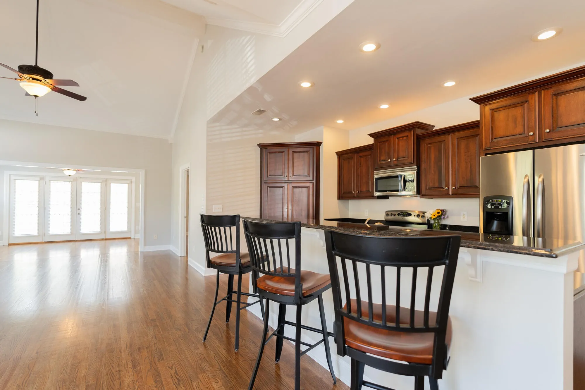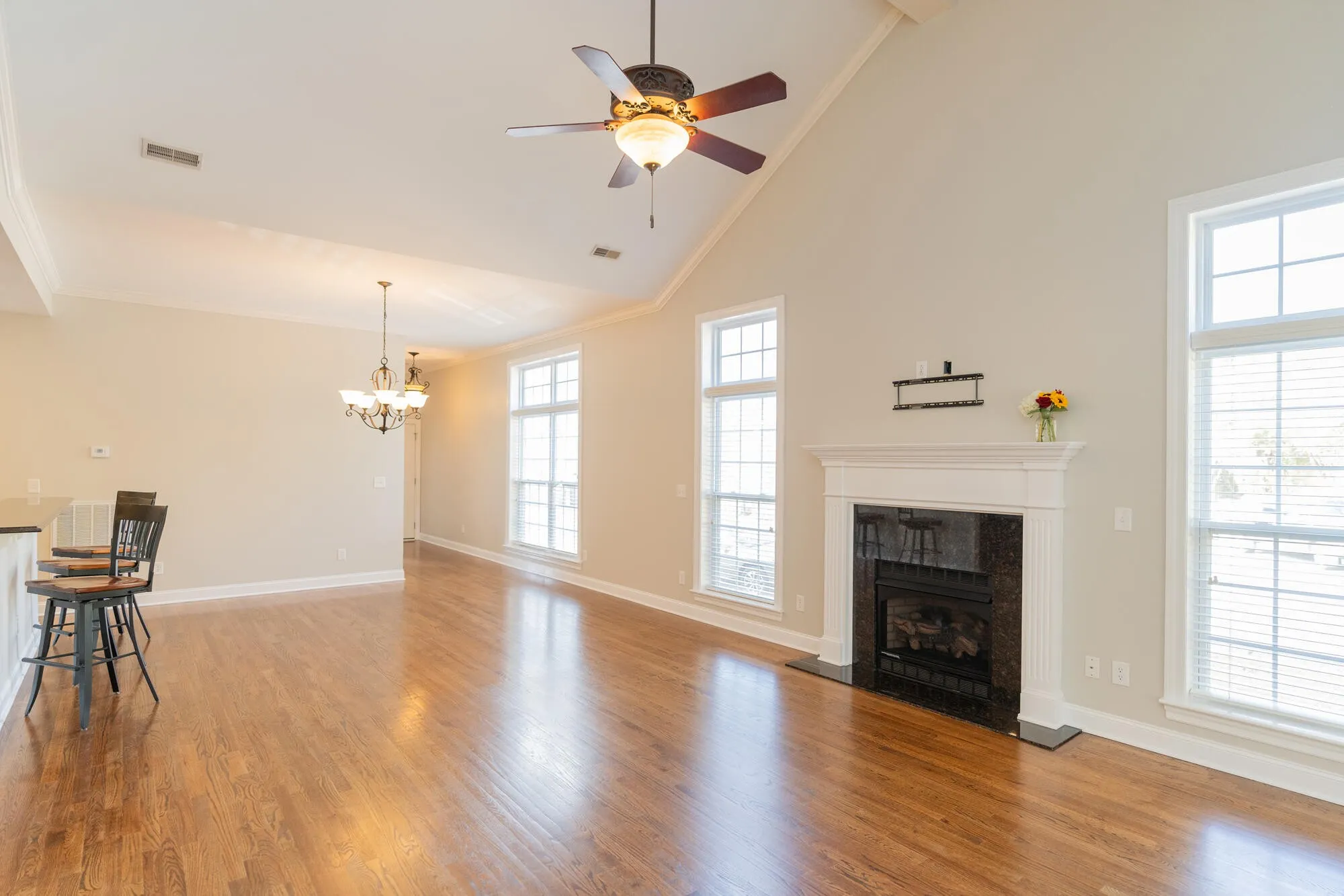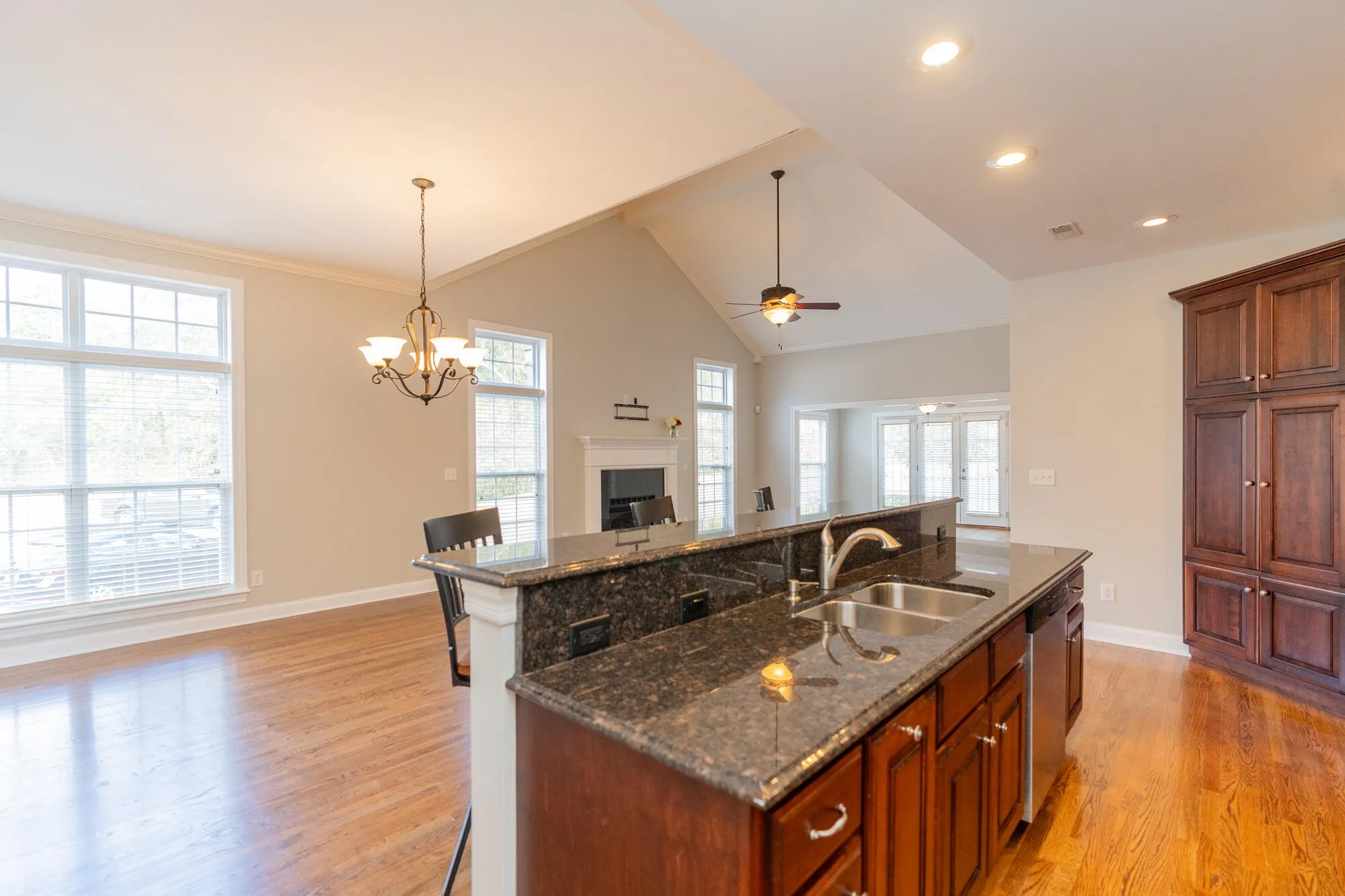 Step inside to discover an interior adorned with solid oak wood flooring throughout, providing a warm and elegant ambiance. The heart of this home lies within its main open-concept living space, boasting a cozy gas fireplace positioned gracefully beneath the lofty cathedral ceiling. The living area opens to an inviting sunroom, leading to a wooden deck—an ideal spot for sipping your morning coffee, relaxation, and entertainment. The well-equipped kitchen boasts wood cabinets, granite counters, stainless appliances, and a convenient island with an attached bar area, offering the ideal space for creating delicious meals and socializing.