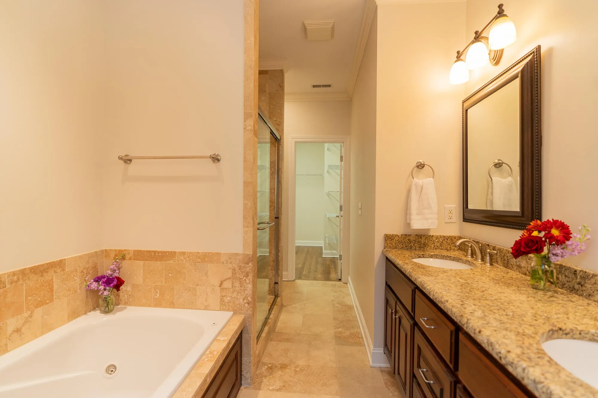 The primary bedroom offers a serene retreat with a tray ceiling, large windows overlooking the backyard, and an en suite bathroom. This luxurious bathroom is equipped with a jetted tub, a walk-in travertine shower, and a granite double vanity. Additionally, a spacious walk-in closet adjoins the bathroom, ensuring ample storage space. The second generously sized bedroom, complete with its own walk-in closet, shares proximity to the second full bathroom, featuring a tile shower/tub combo and a granite counter. The clever spatial separation between the bedrooms ensures optimal privacy for your family or guests. This home boasts a thoughtfully designed layout, beginning with a 1-car garage featuring a convenient ramp, adaptable to the buyer’s needs. The garage, complemented by a driveway, ensures parking flexibility while maximizing convenience.