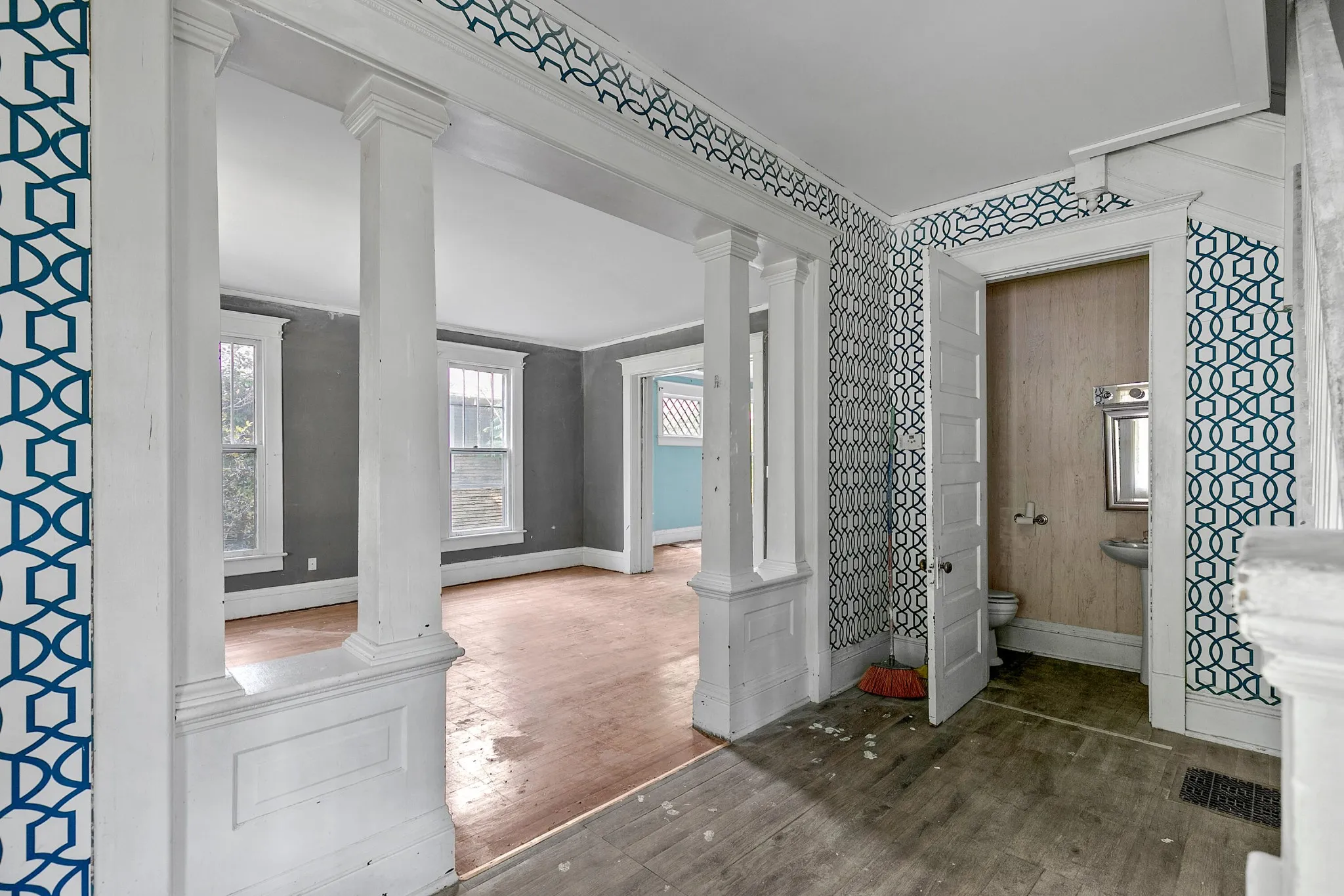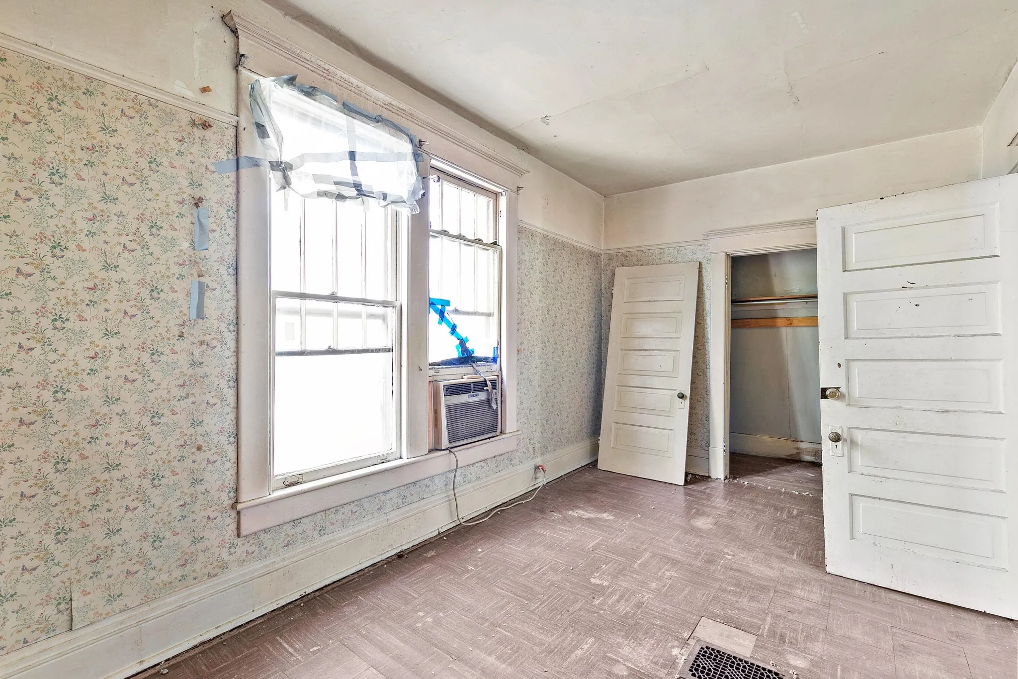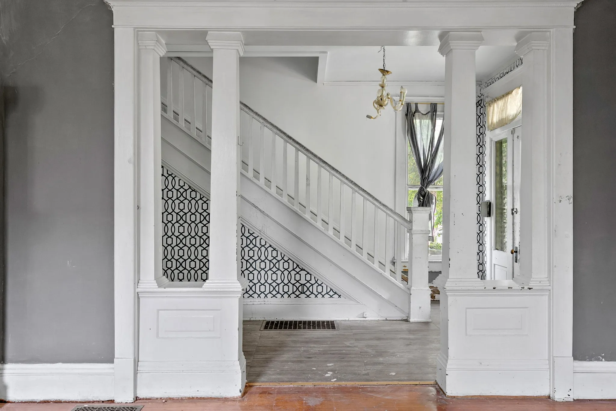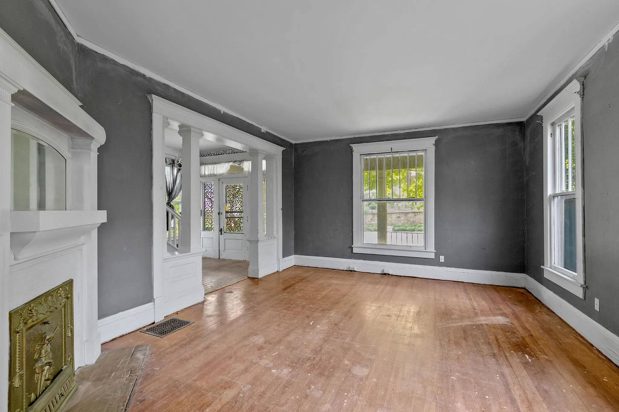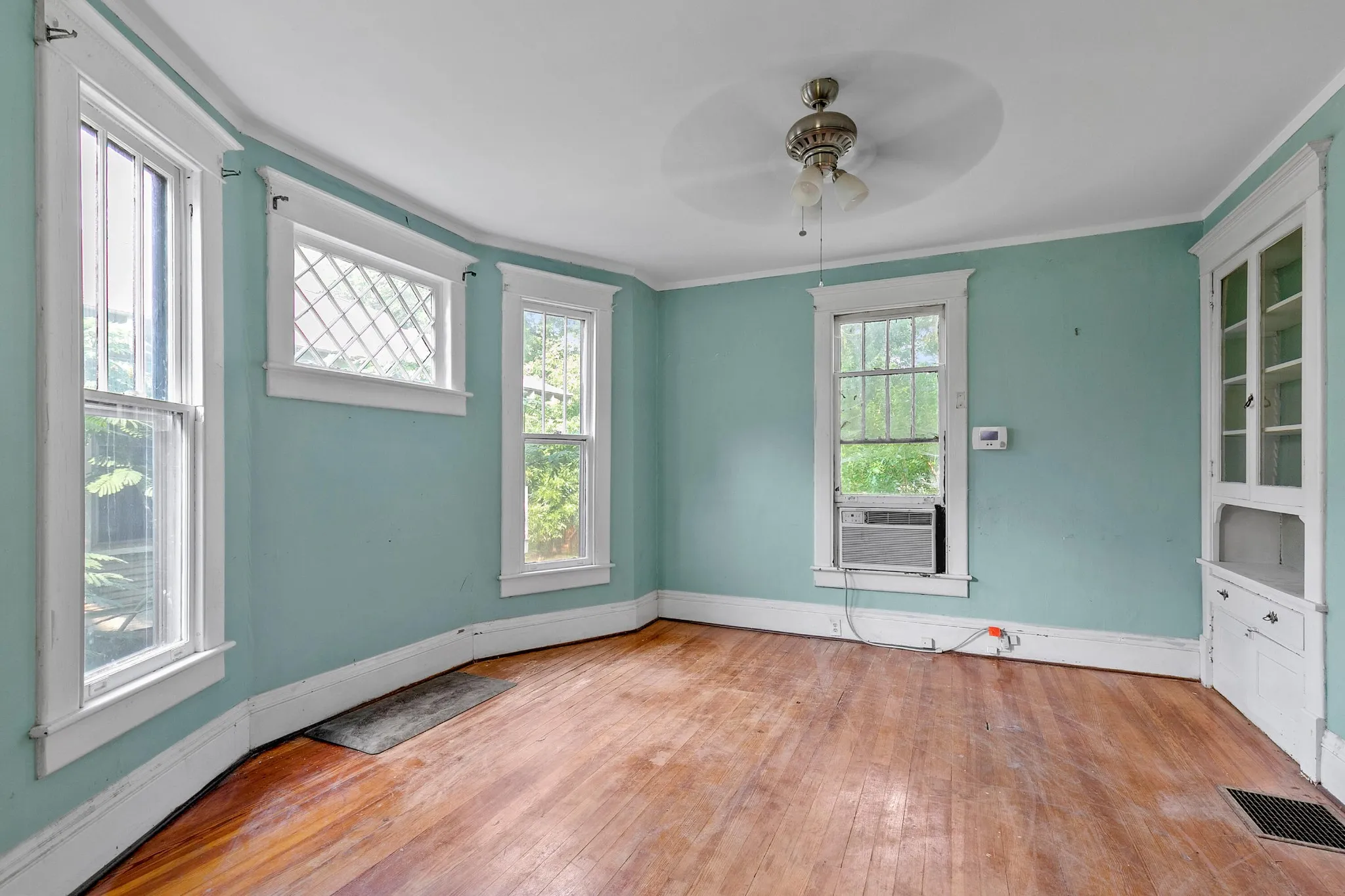 Back upstairs: this 100+ year-old beauty features soaring ceilings, original pocket doors, architectural details galore and the owner says original hardwood floor is present throughout (covered by laminate/carpet in some rooms).