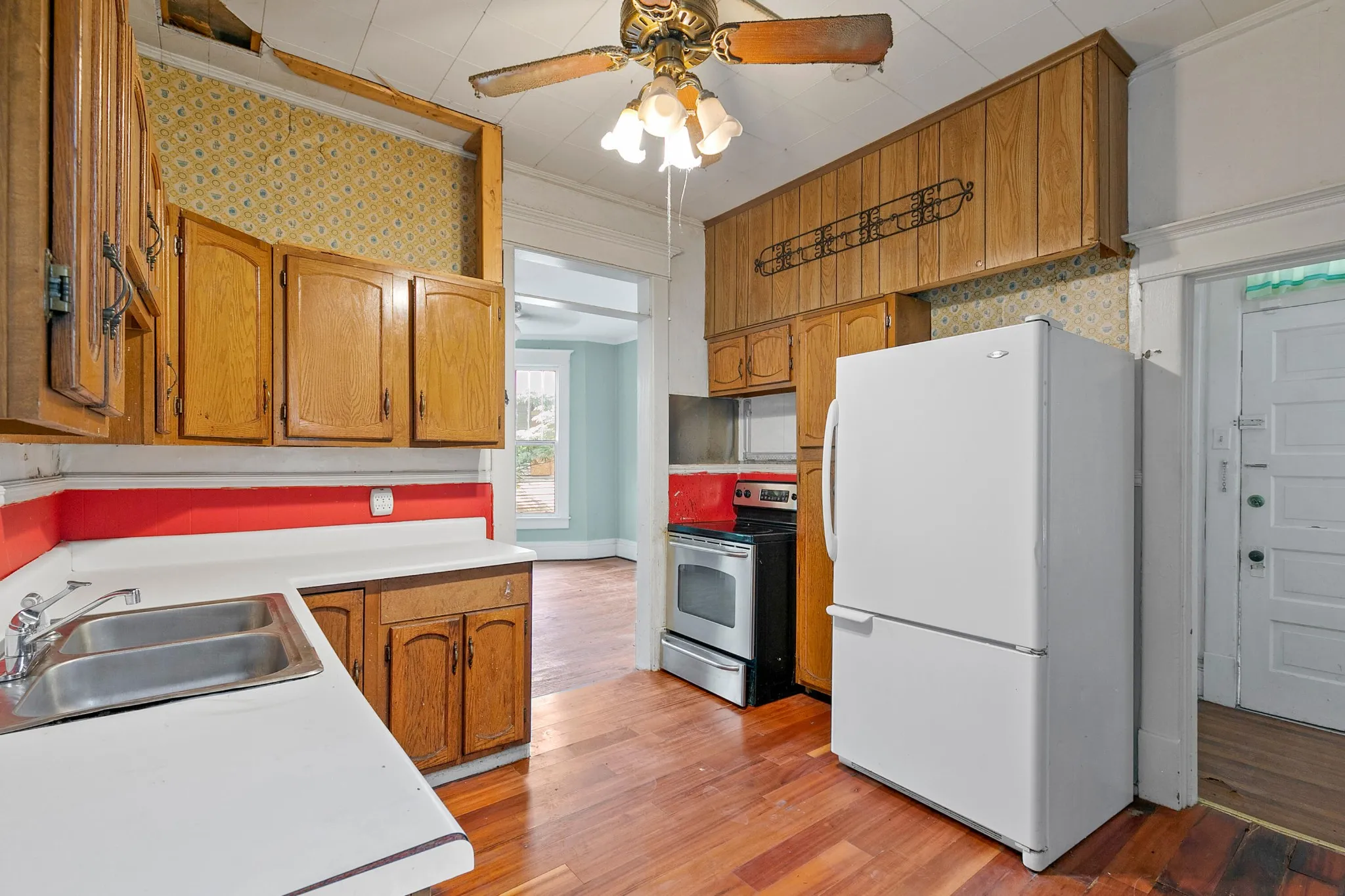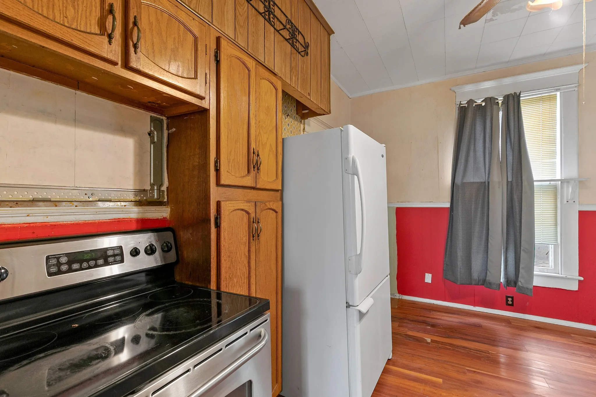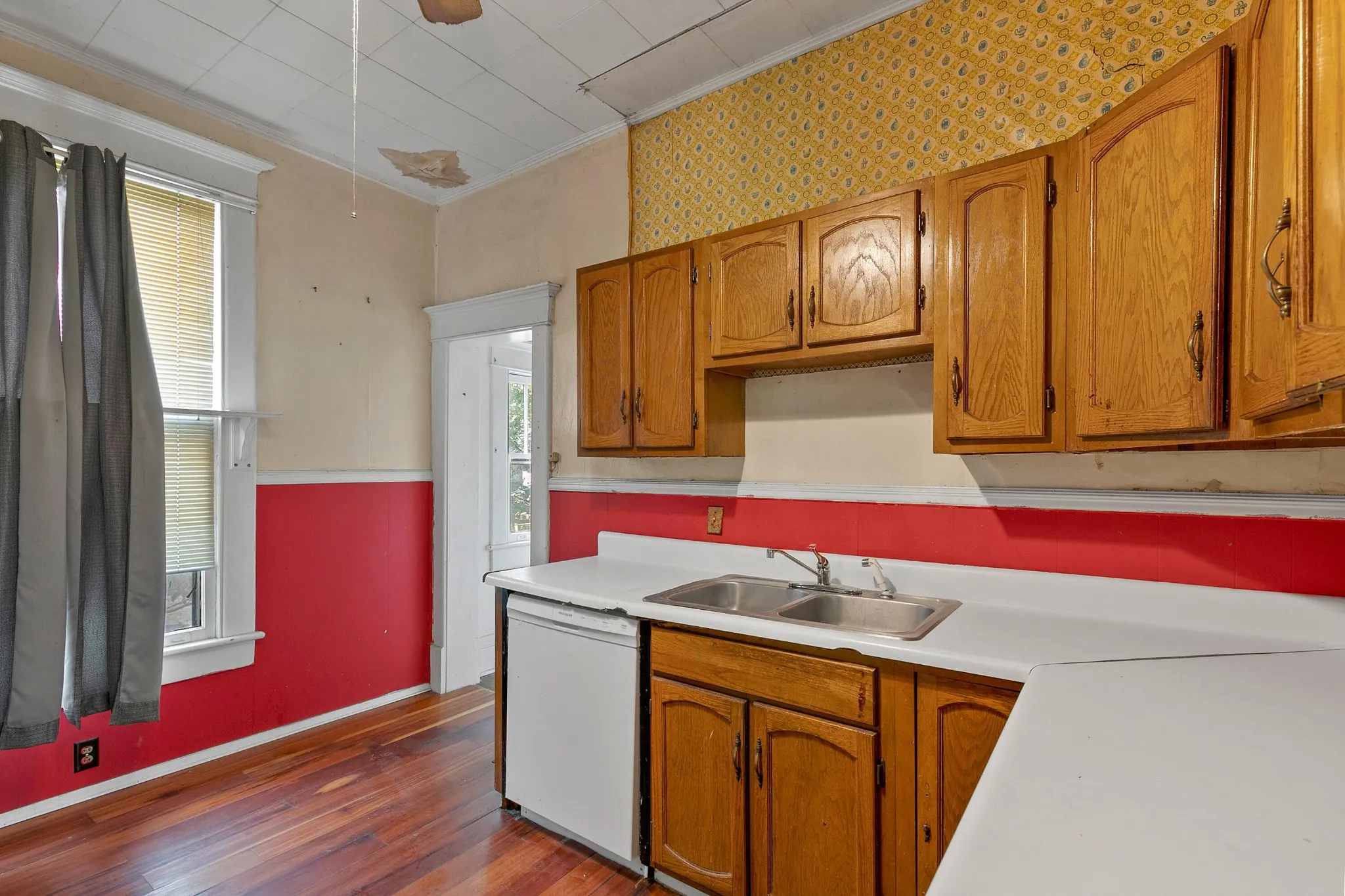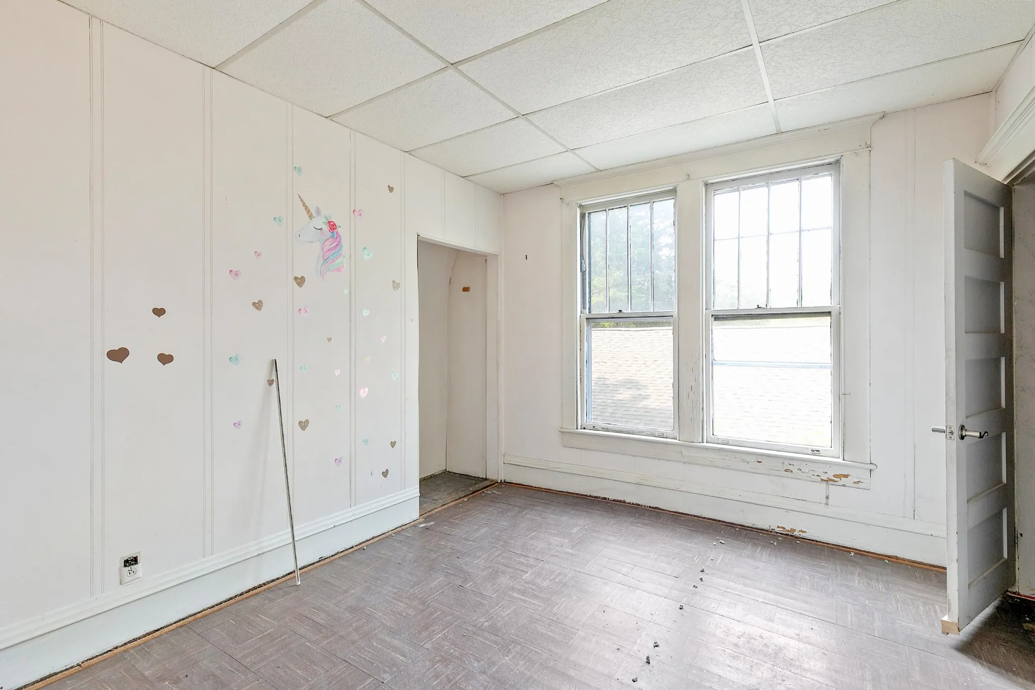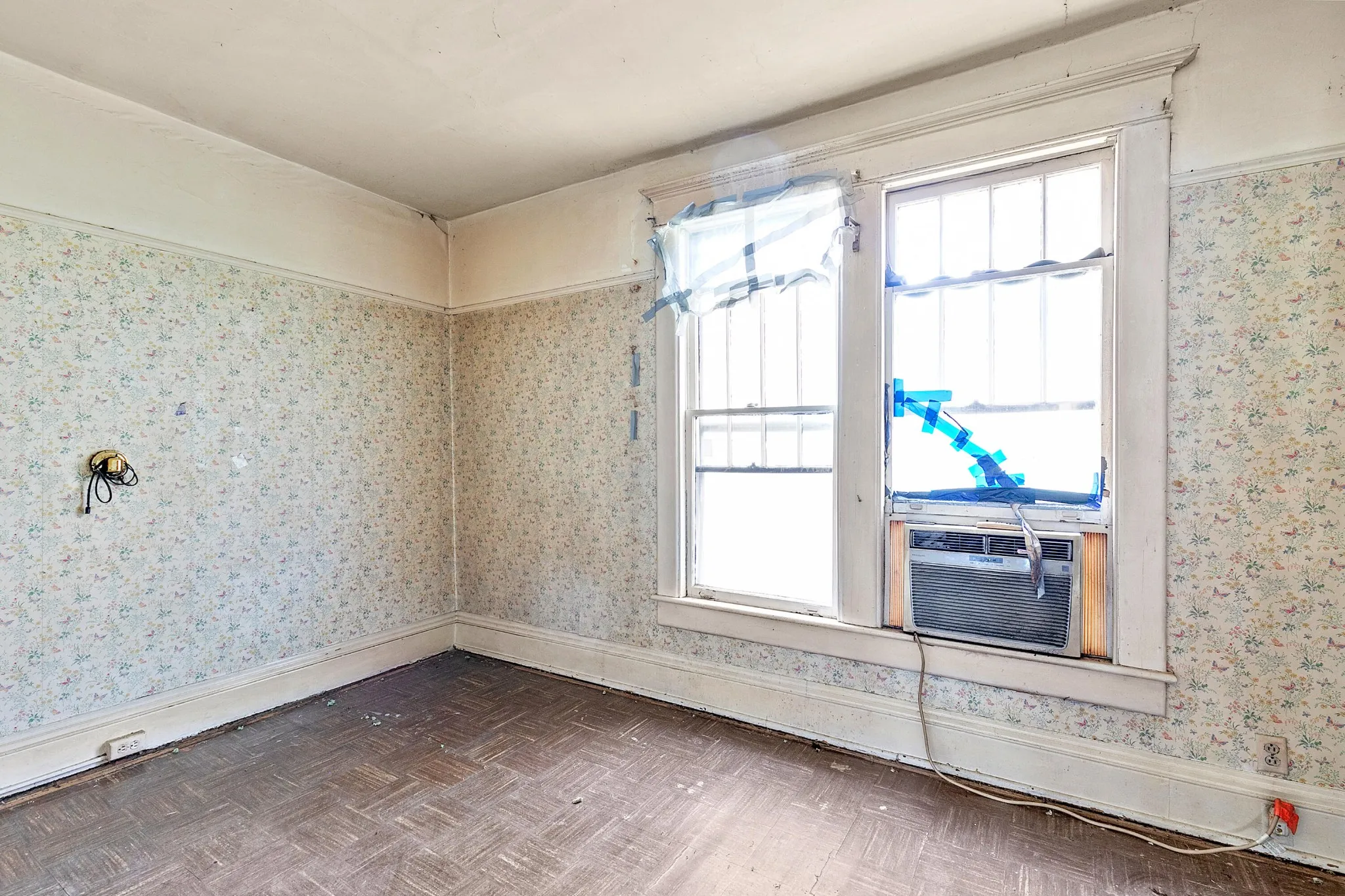 Back upstairs: this 100+ year-old beauty features soaring ceilings, original pocket doors, architectural details galore and the owner says original hardwood floor is present throughout (covered by laminate/carpet in some rooms).