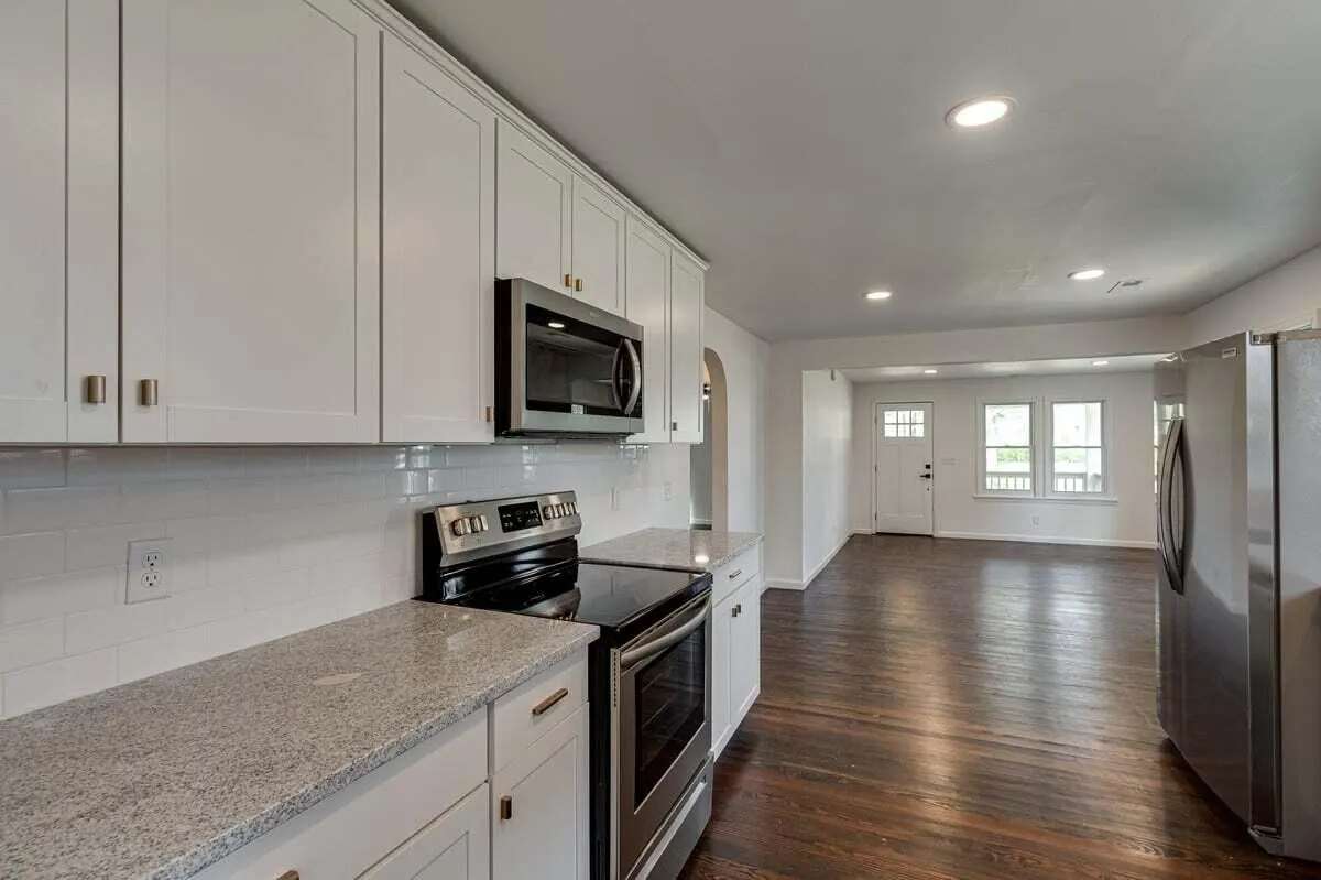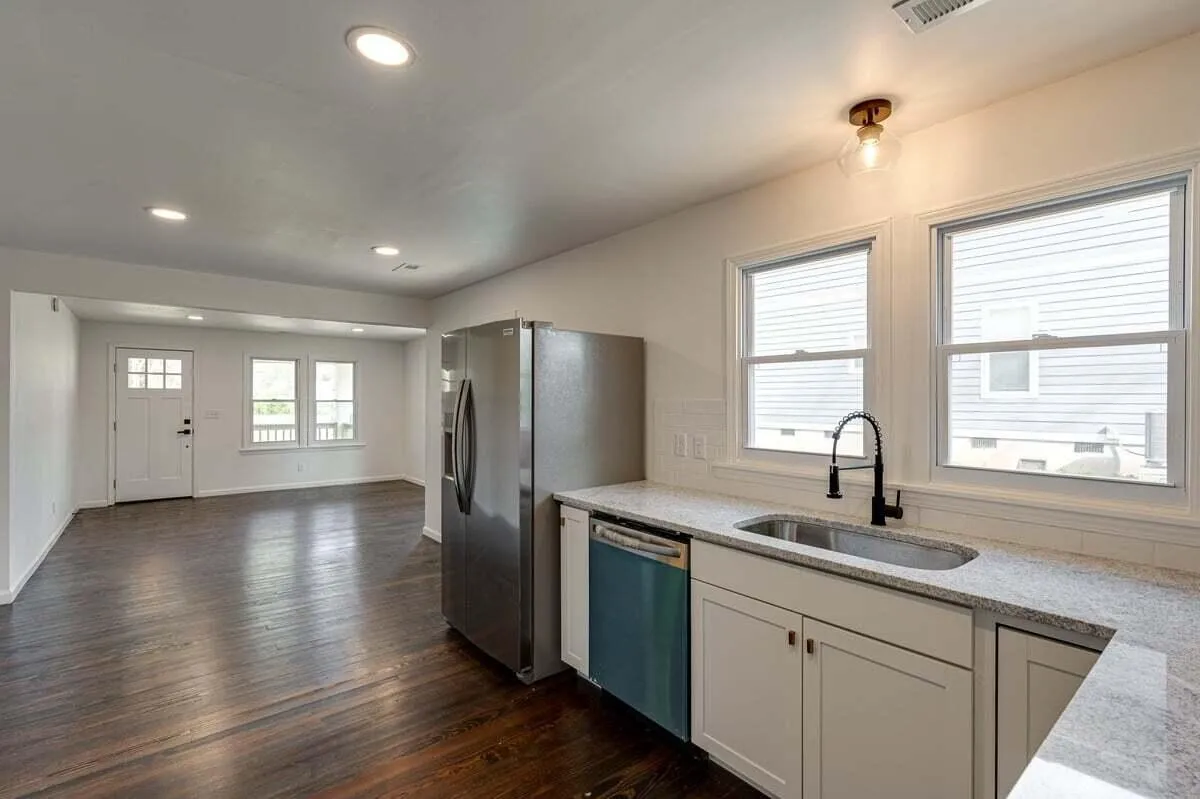 As you step inside, you’ll be greeted by stunning refinished hardwood floors that lead to a brand new kitchen, complete with elegant granite countertops, new cabinets, and a stylish backsplash. All new appliances have been installed, including a stainless steel refrigerator, oven, and dishwasher, ensuring that your kitchen is not only beautiful but also highly functional.