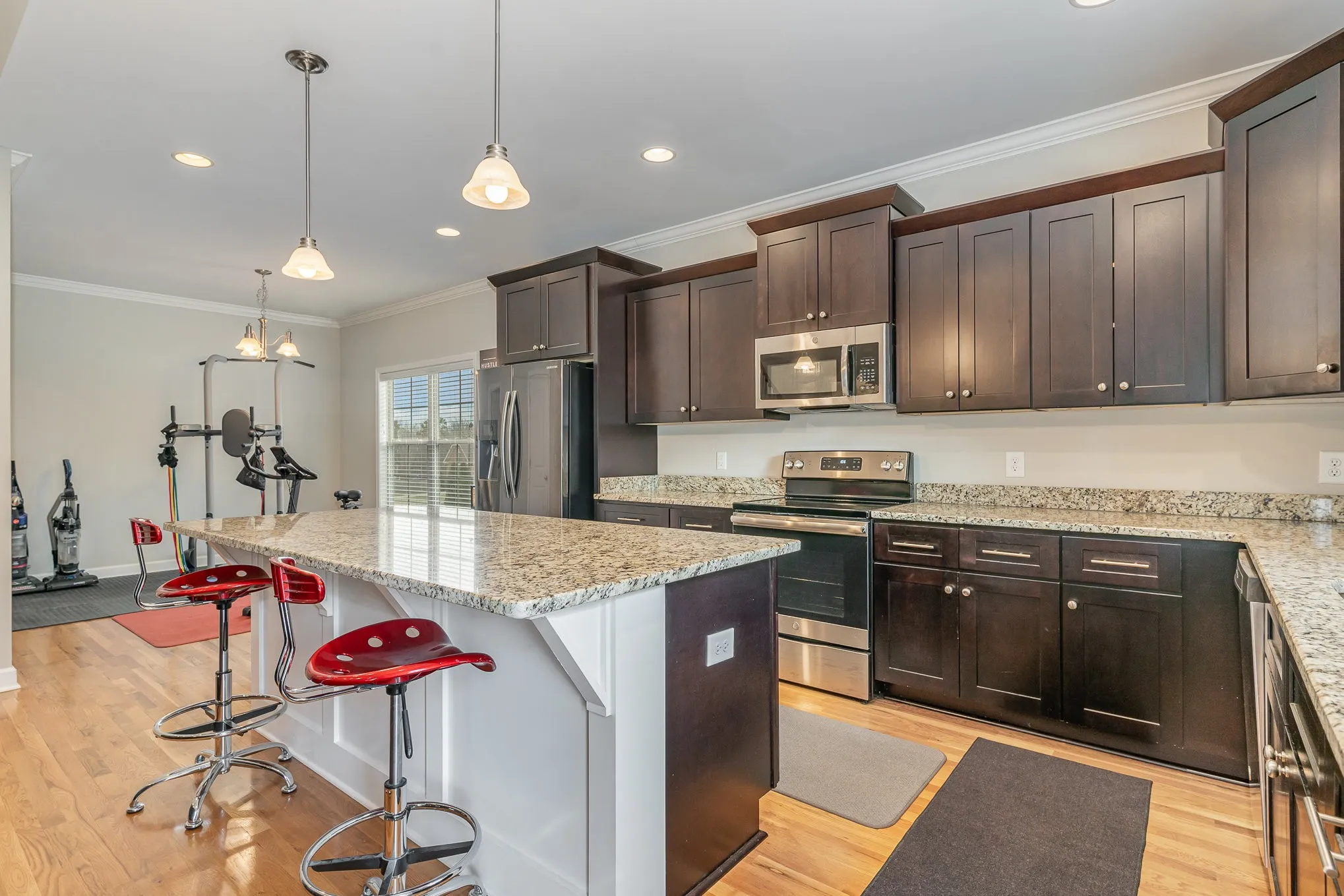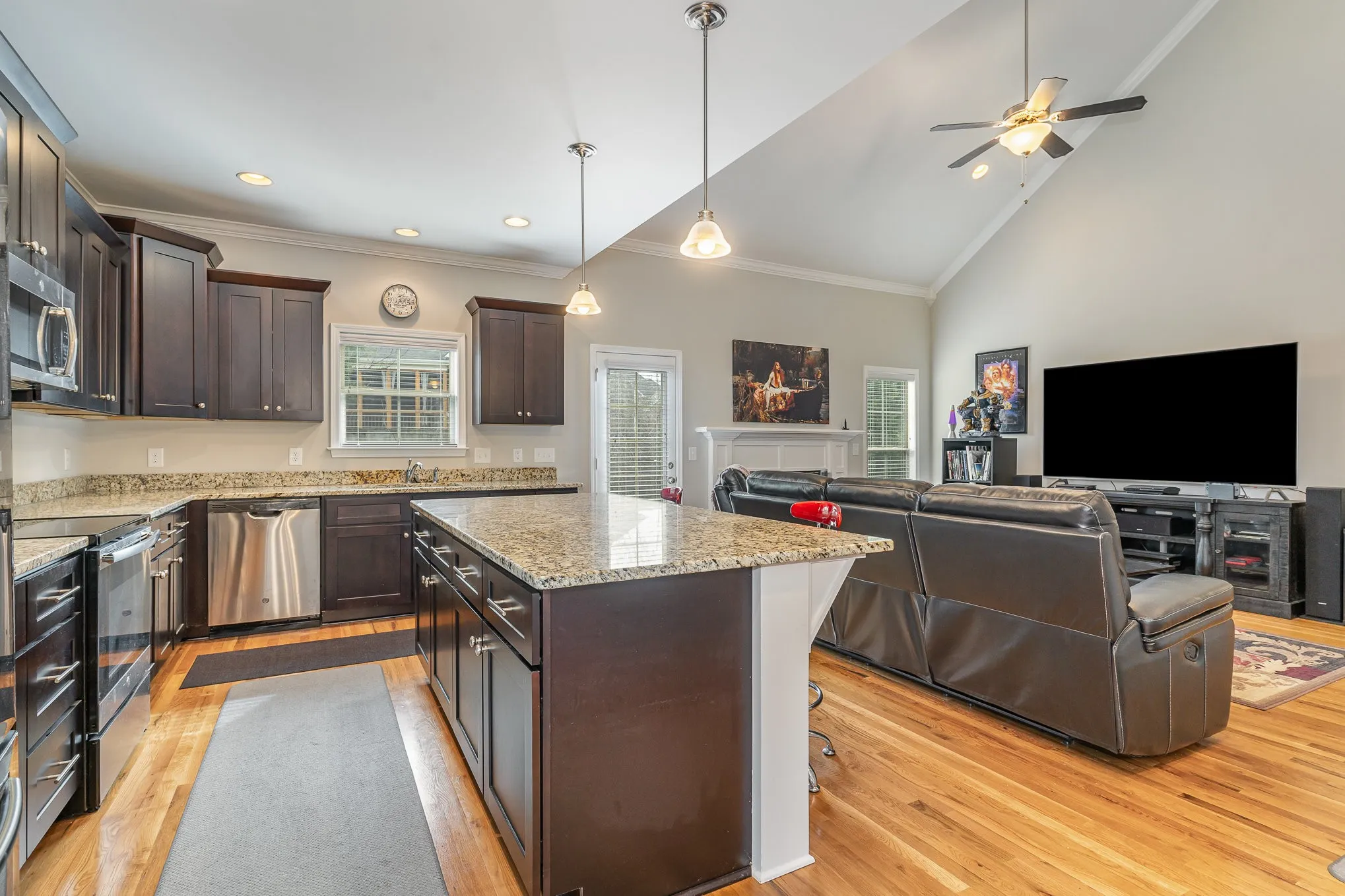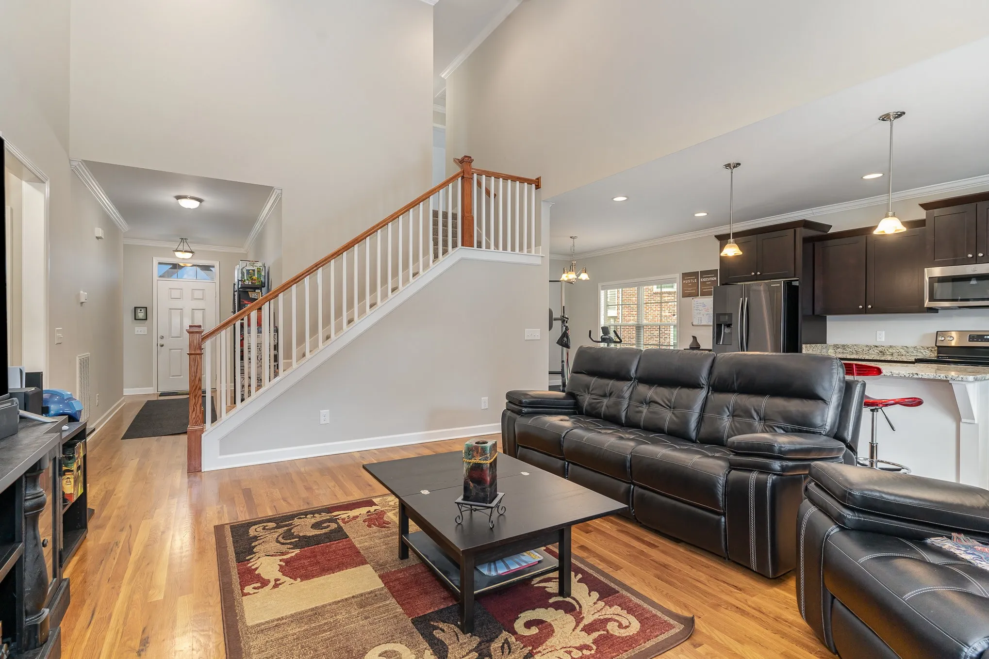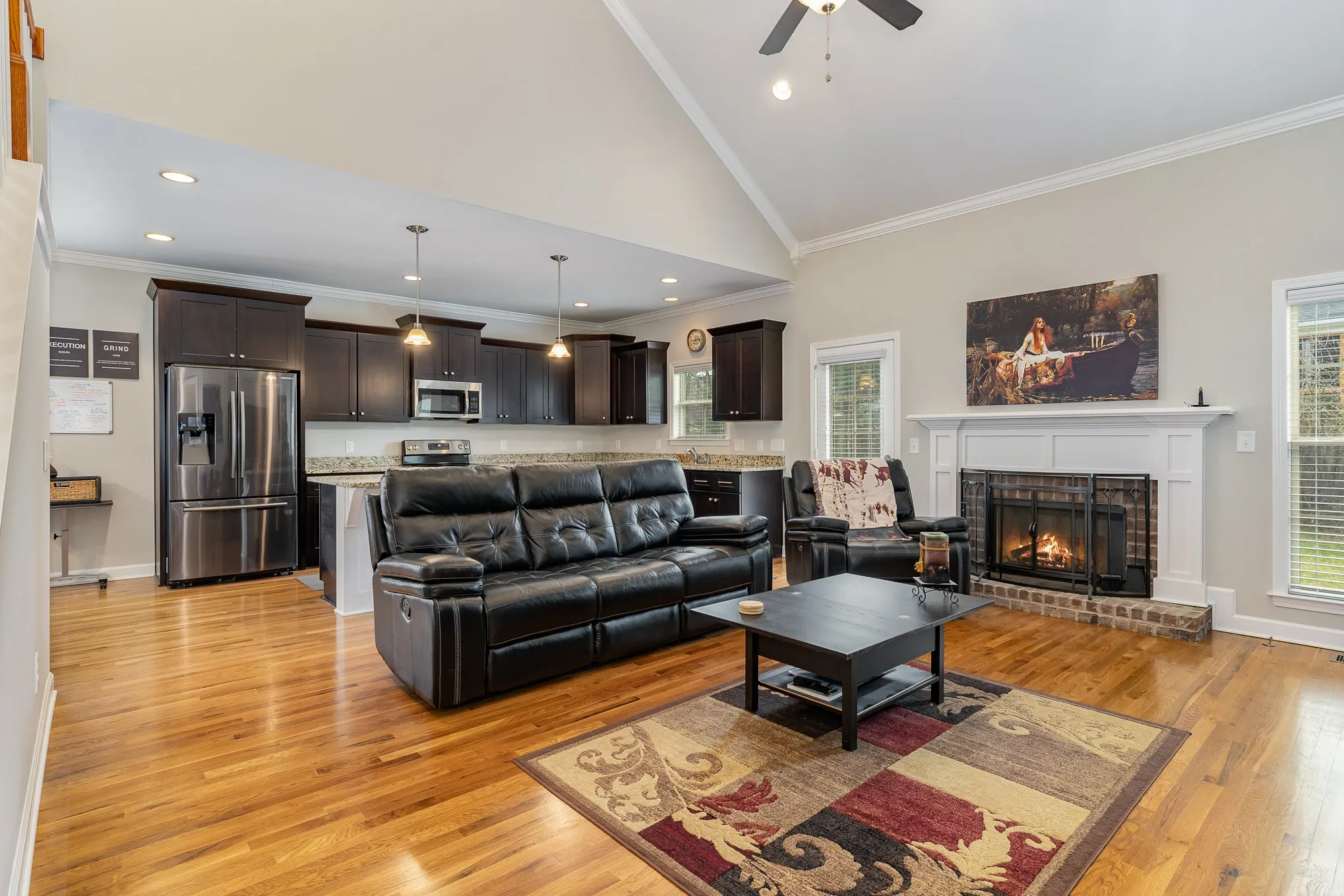 Beautifully appointed executive home with gleaming sand and finish hardwood floors, high vaulted ceilings, granite counters, custom cabinetry with soft close technology, primary and additional bedroom downstairs, spacious bedrooms and bonus room upstairs, meticulously maintained