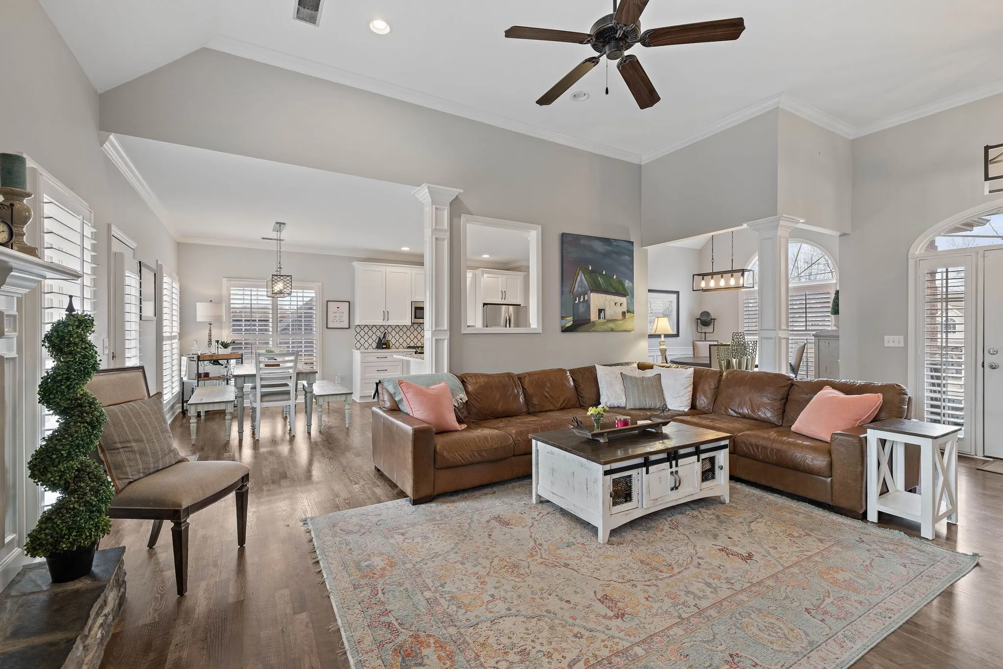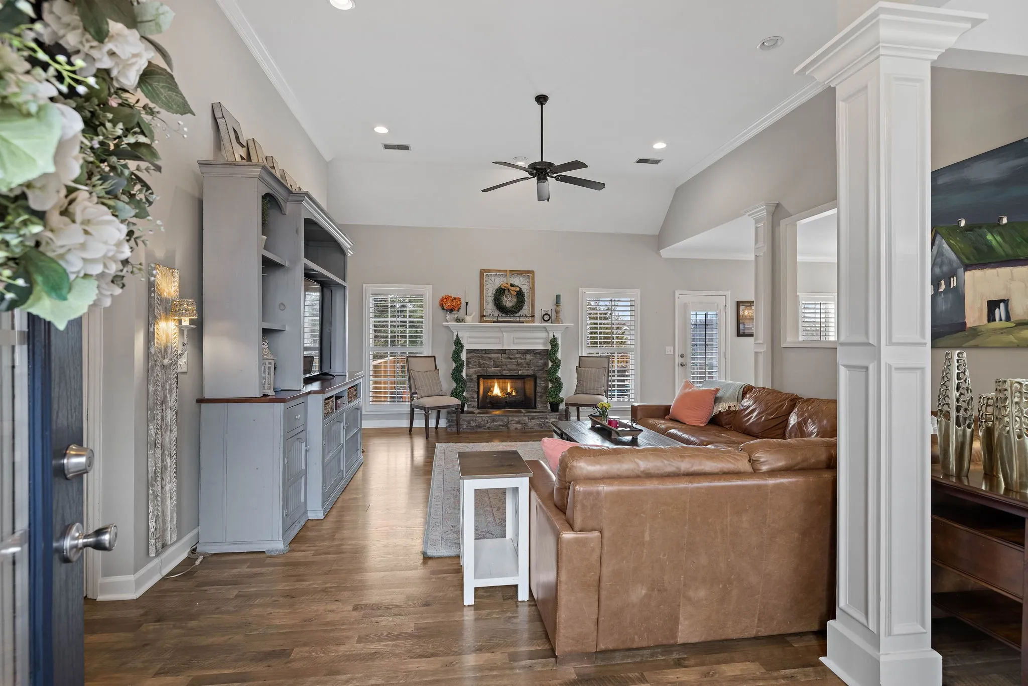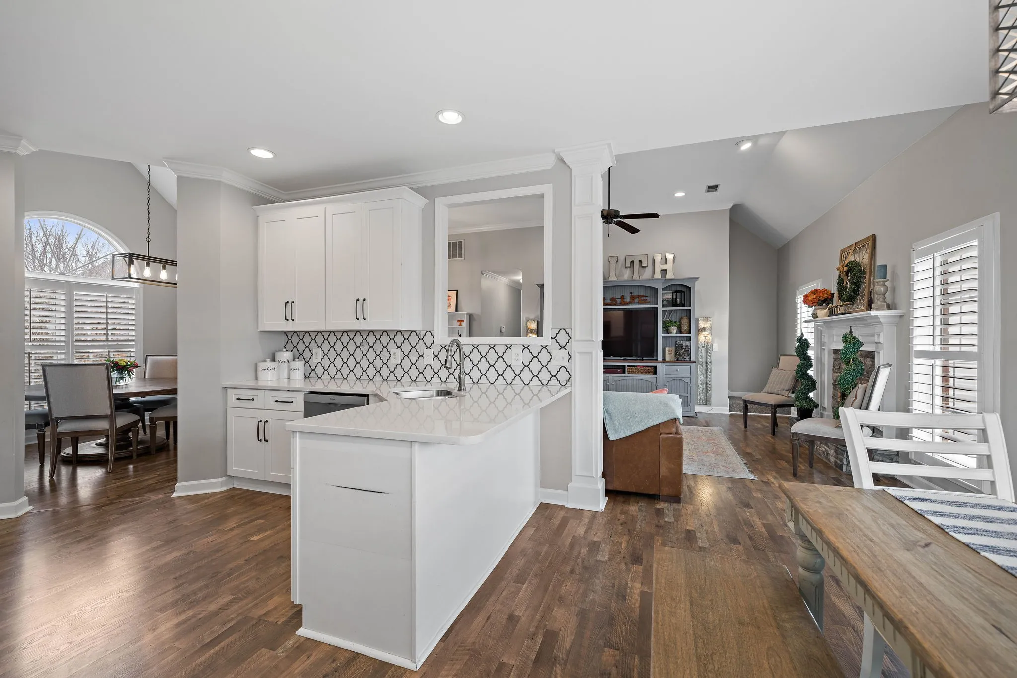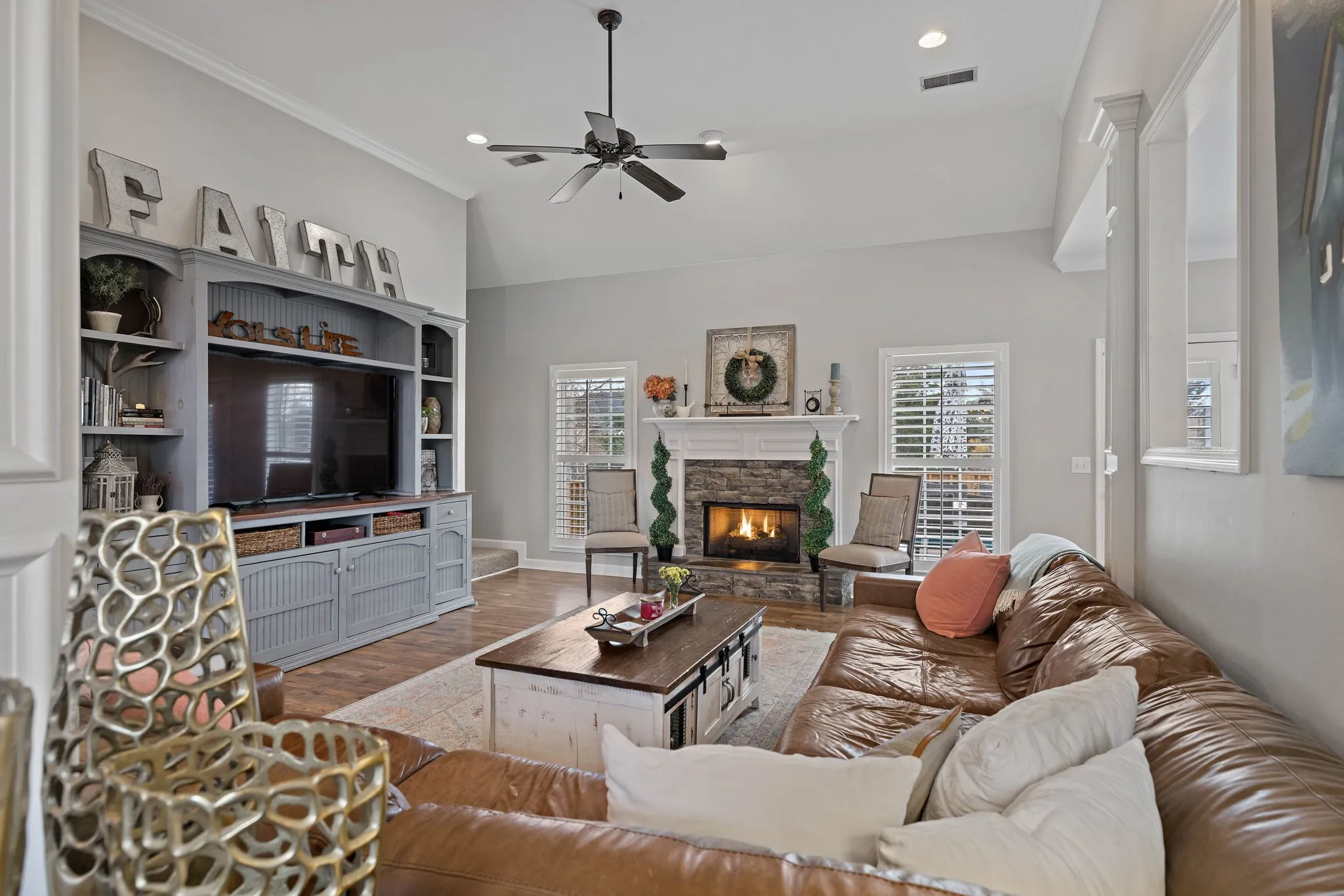 This beautiful 4 bedroom, 4 bathroom home in the Crowne Pointe community, in Thompsons Station, has been recently renovated and is beautiful. Recent renovations include: new laminate floors on main level, new kitchen cabinets, new stunning tile backsplash and quartz countertops, new kitchen appliances and plantation shutters. Roof is 2.5 yrs old. Primary on main! The bathroom in the primary suite also been updated with a new, large tiled shower, new tile floors, new cabinets, new quartz countertops and custom built-ins in the primary suite closet. Upstairs will you find a bedroom with full bathroom. Downstairs has a large open living/bonus room, that’s currently being used as an office and living room. Downstairs also has a full bathroom, and 2 large storage rooms that are heated and cooled. Storage galore in this home! The large fenced in back yard is ideal for entertaining and relaxing. It also comes with a 2 story deck that is amazing! Make plans to see this one in person!!