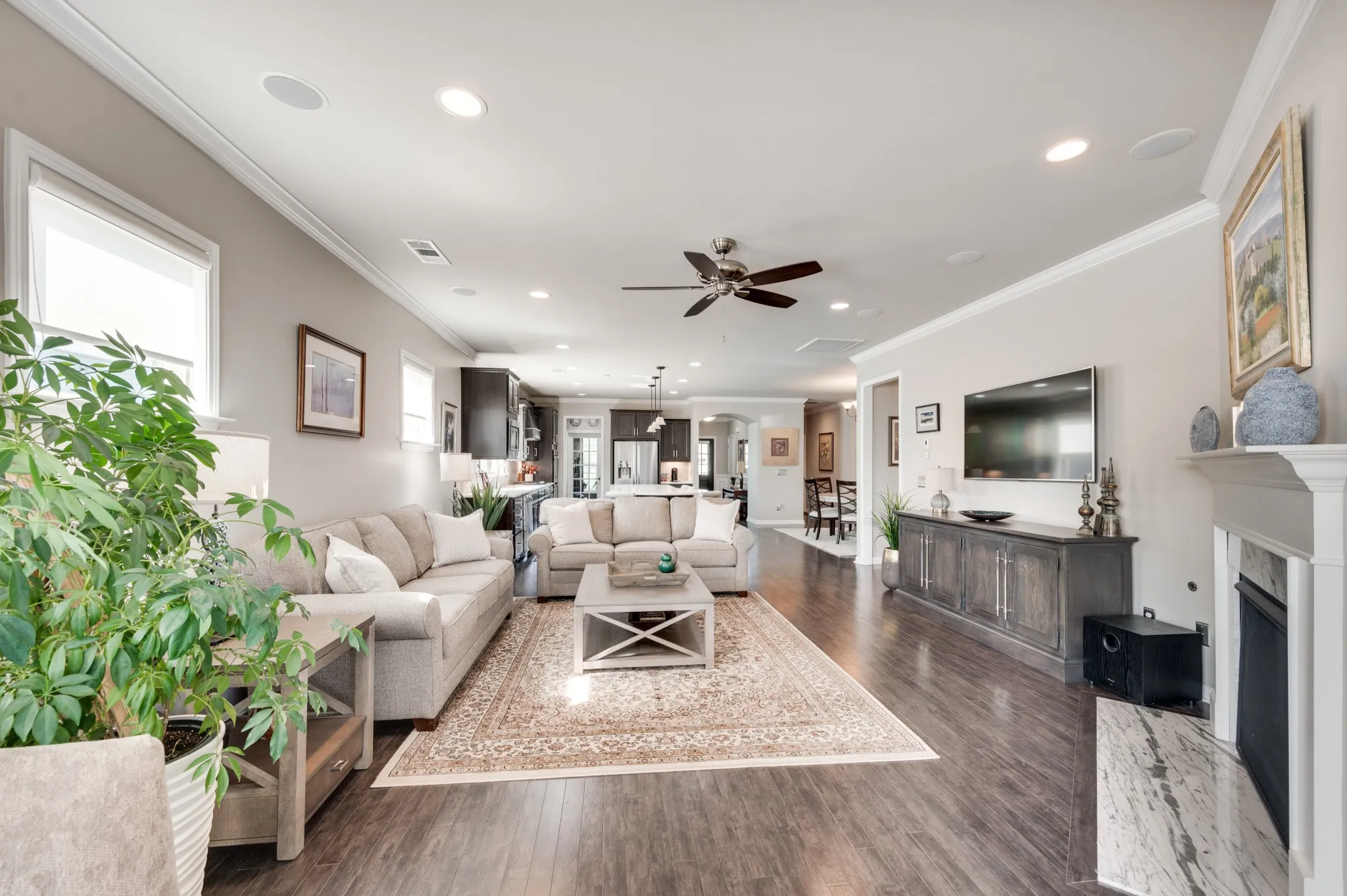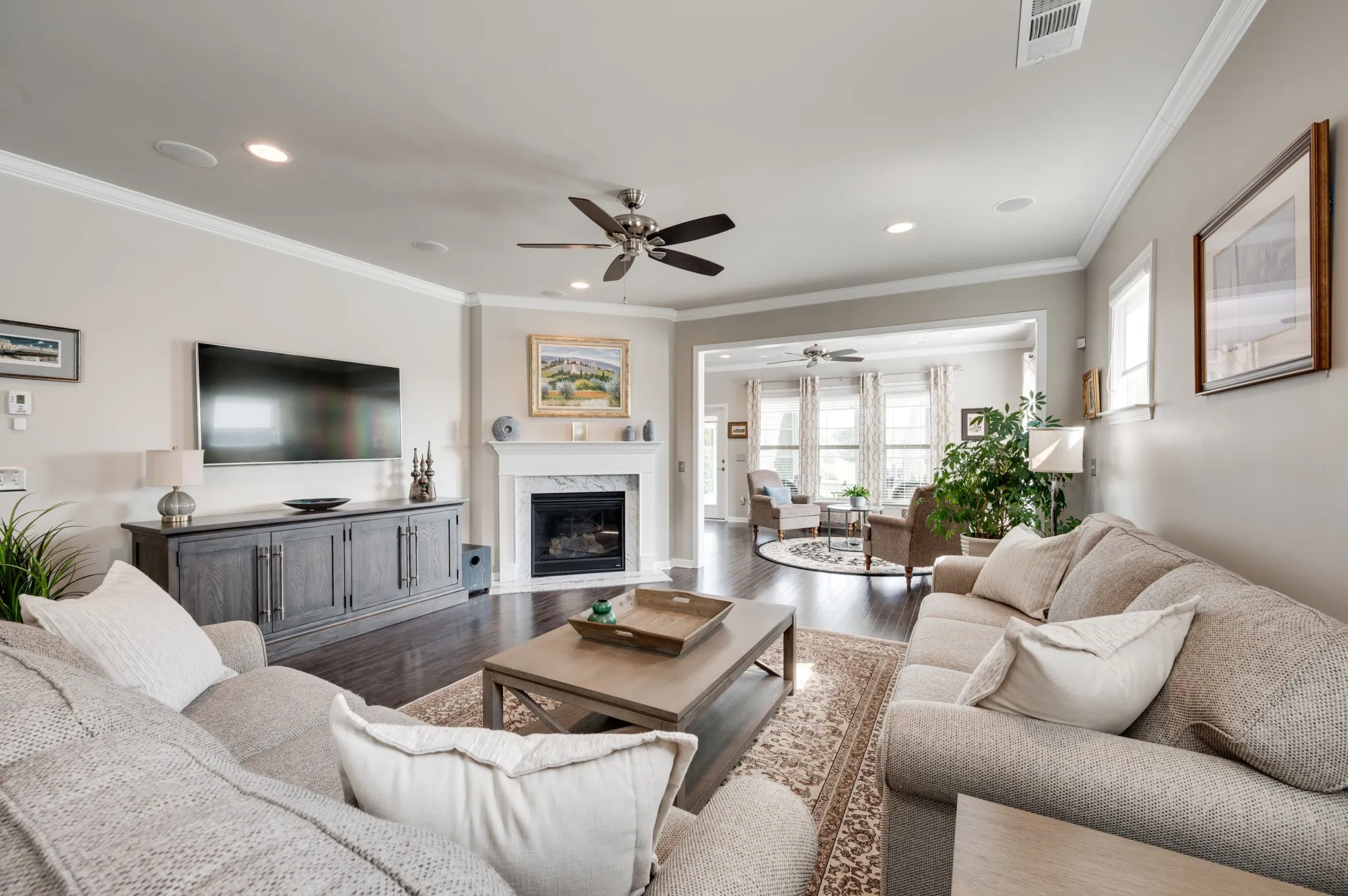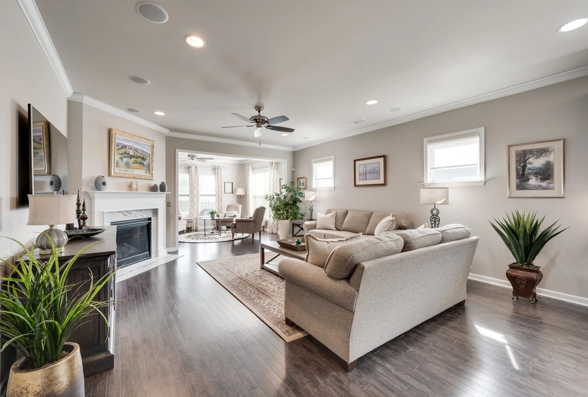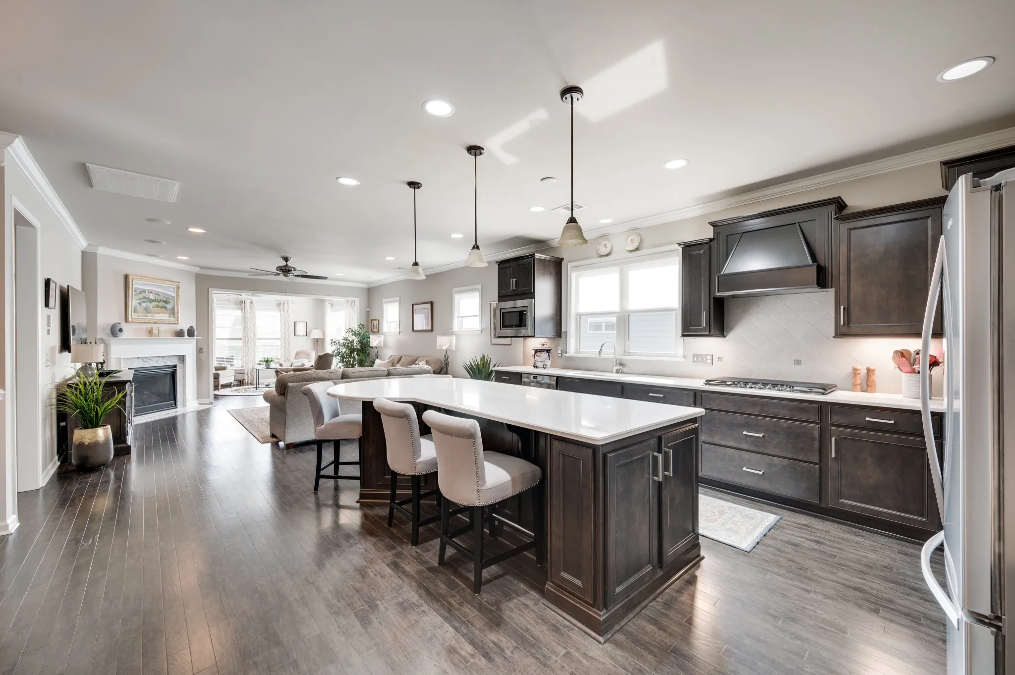+"PublicRemarks": "Fantastic light and bright 3 bed/2 bath immaculate one level Martin Ray model in Del Webb's 55+ active adult community. Crown molding, engineered hardwood throughout, tile bathrooms, sunroom, lanai with EZ Breeze windows, epoxied garage floor, attic storage, radiant barrier insulation, fireplace, a dream Gourmet kitchen with custom pantry shelving, quartz countertops, double ovens, gas cooktop, Butler's pantry, under counter lighting, dovetail/soft close drawers and doors, roll out shelving and all kitchen appliances stay. Additionally, the home has tinted windows, an irrigation system, surround sound, walk in shower in primary bath, french doors off entry lead to the flex room that can be used as an office, formal living space, library, or a fourth bedroom if needed. Tons of storage."