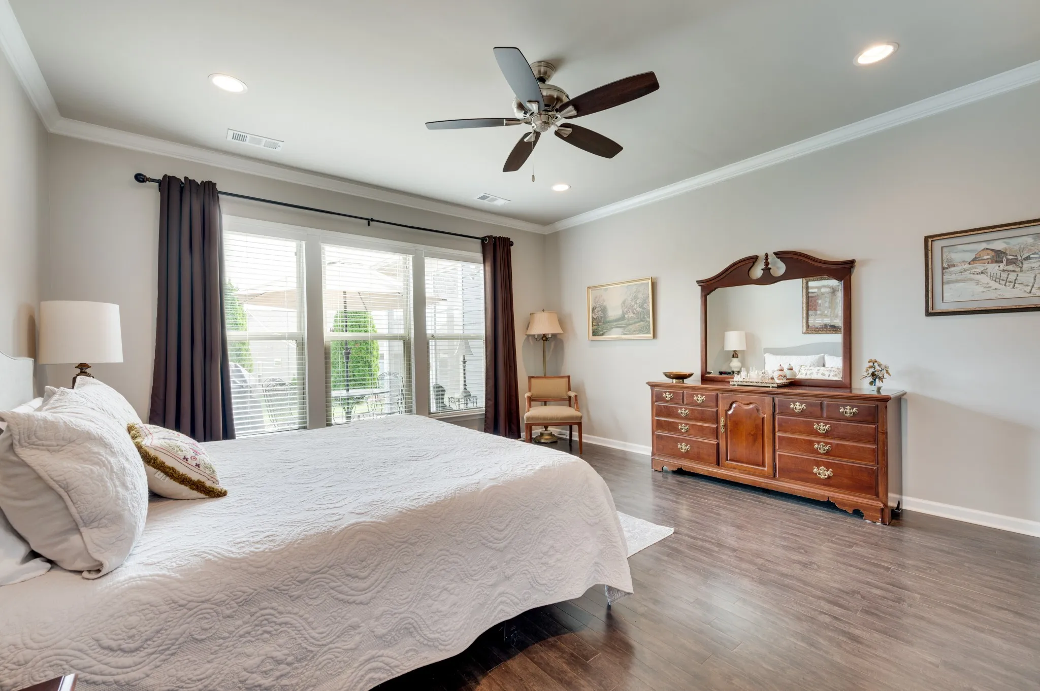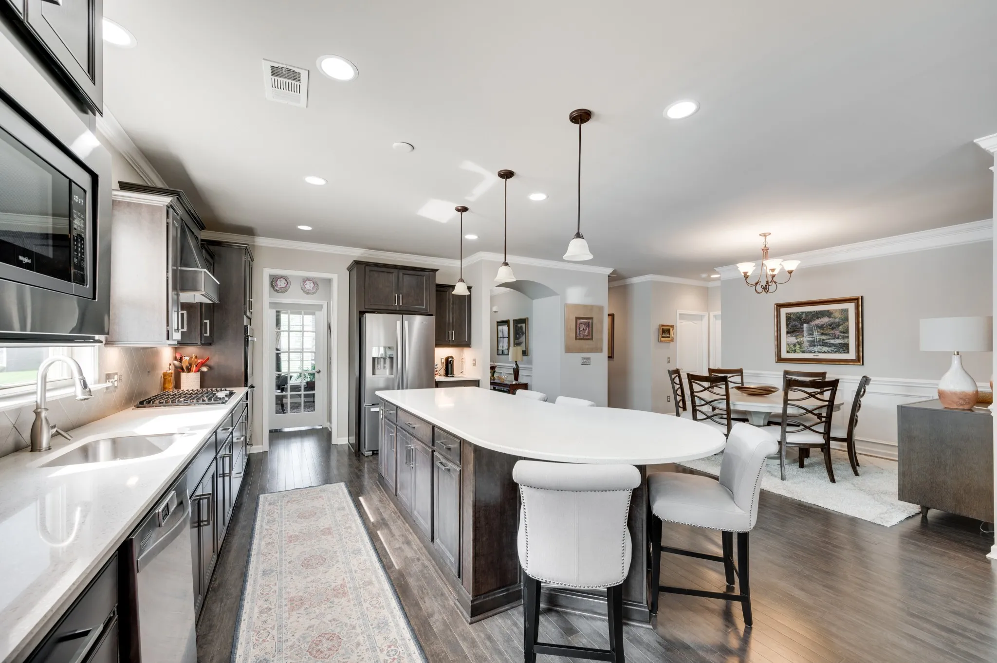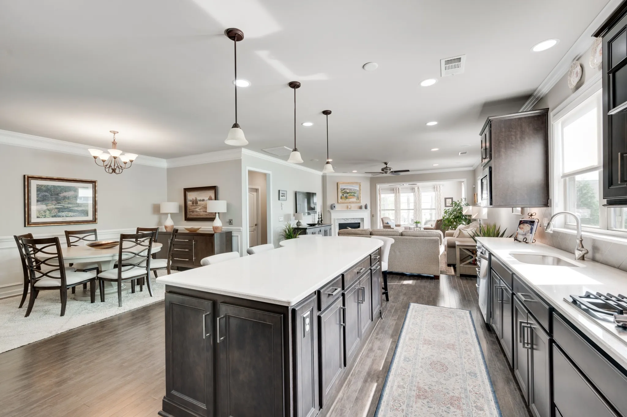+"PublicRemarks": "Fantastic light and bright 3 bed/2 bath immaculate one level Martin Ray model in Del Webb's 55+ active adult community. Crown molding, engineered hardwood throughout, tile bathrooms, sunroom, lanai with EZ Breeze windows, epoxied garage floor, attic storage, radiant barrier insulation, fireplace, a dream Gourmet kitchen with custom pantry shelving, quartz countertops, double ovens, gas cooktop, Butler's pantry, under counter lighting, dovetail/soft close drawers and doors, roll out shelving and all kitchen appliances stay. Additionally, the home has tinted windows, an irrigation system, surround sound, walk in shower in primary bath, french doors off entry lead to the flex room that can be used as an office, formal living space, library, or a fourth bedroom if needed. Tons of storage."