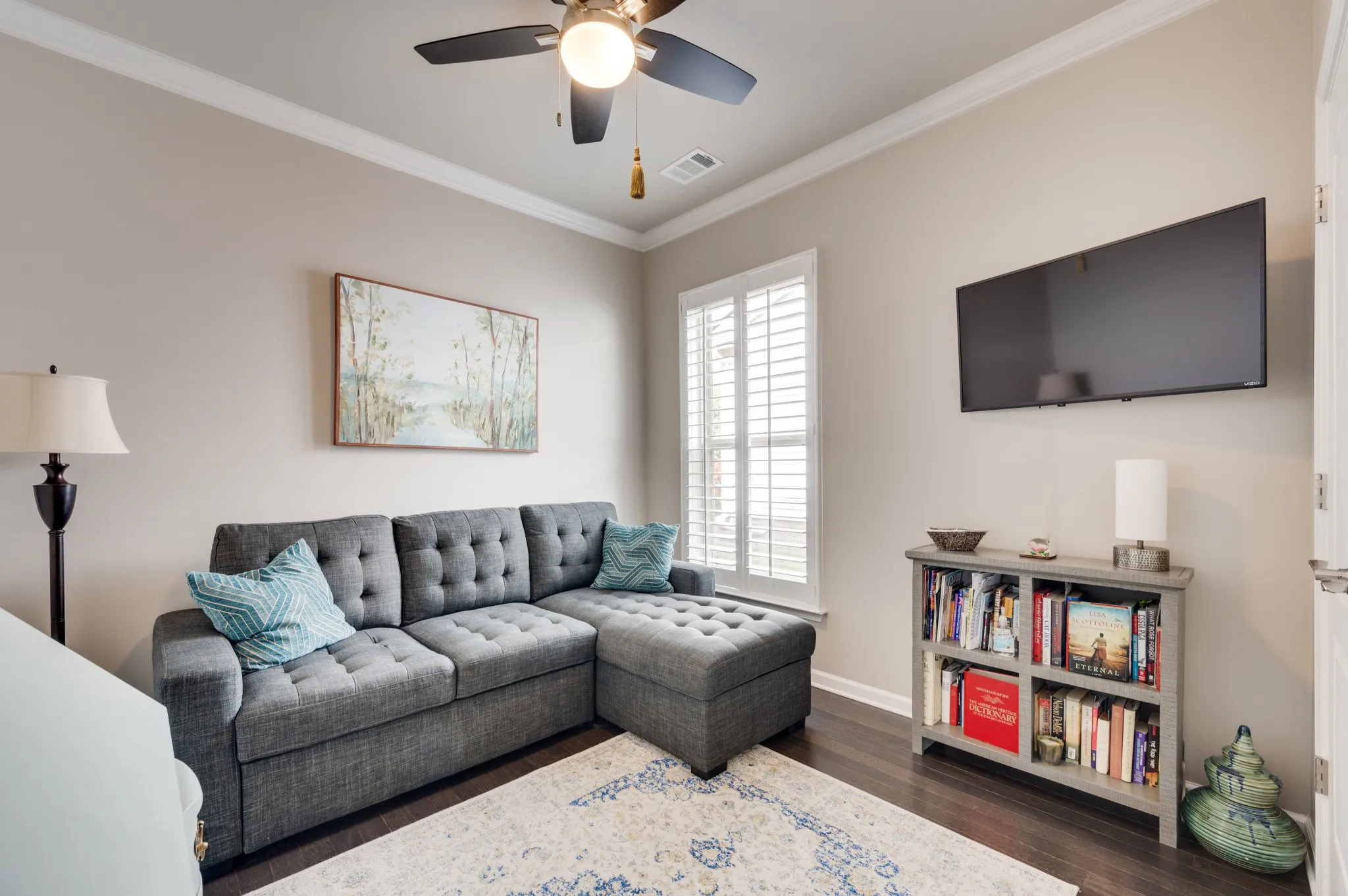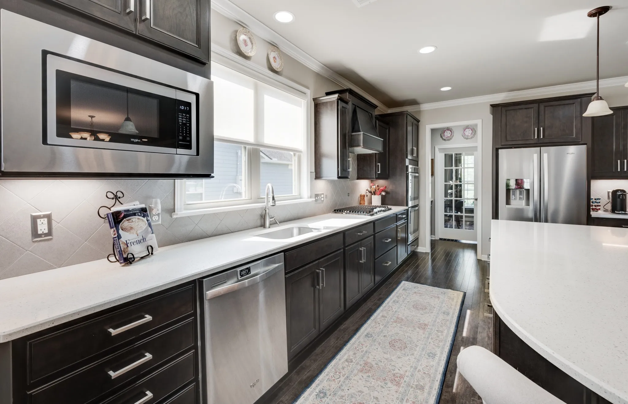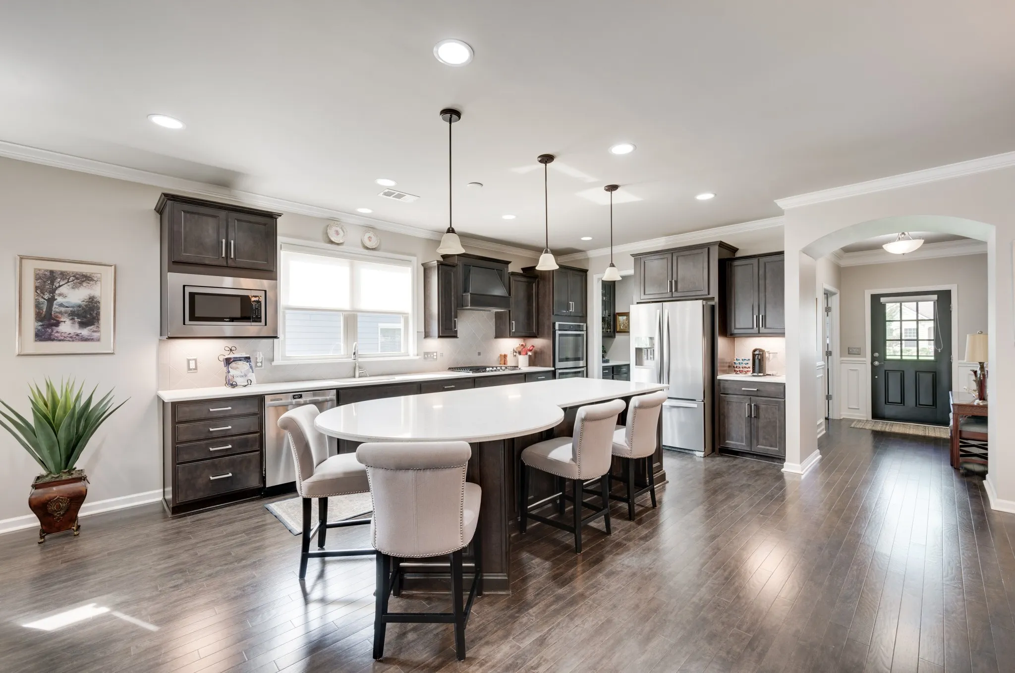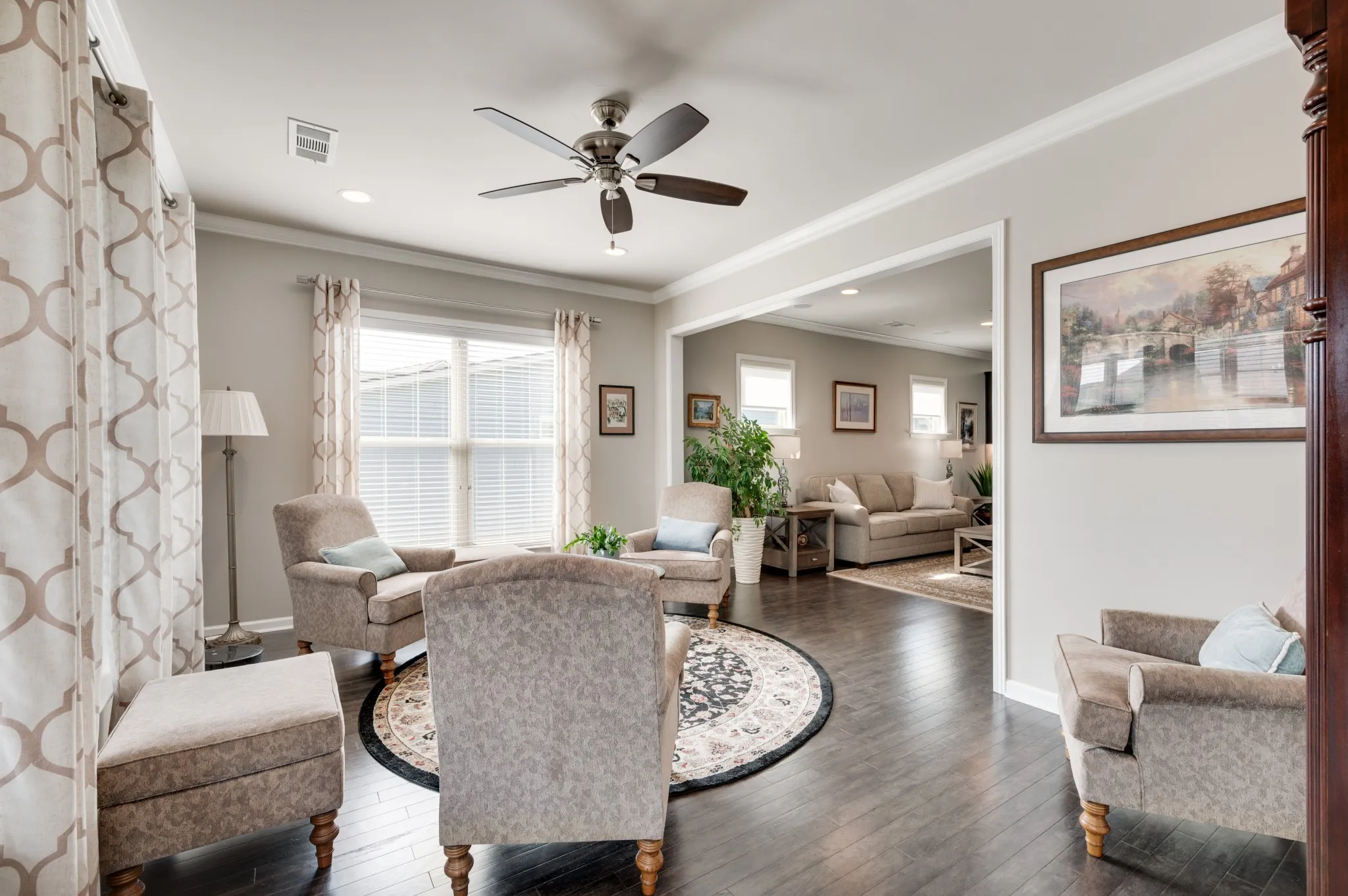 +"PublicRemarks": "Fantastic light and bright 3 bed/2 bath immaculate one level Martin Ray model in Del Webb's 55+ active adult community. Crown molding, engineered hardwood throughout, tile bathrooms, sunroom, lanai with EZ Breeze windows, epoxied garage floor, attic storage, radiant barrier insulation, fireplace, a dream Gourmet kitchen with custom pantry shelving, quartz countertops, double ovens, gas cooktop, Butler's pantry, under counter lighting, dovetail/soft close drawers and doors, roll out shelving and all kitchen appliances stay. Additionally, the home has tinted windows, an irrigation system, surround sound, walk in shower in primary bath, french doors off entry lead to the flex room that can be used as an office, formal living space, library, or a fourth bedroom if needed. Tons of storage."
