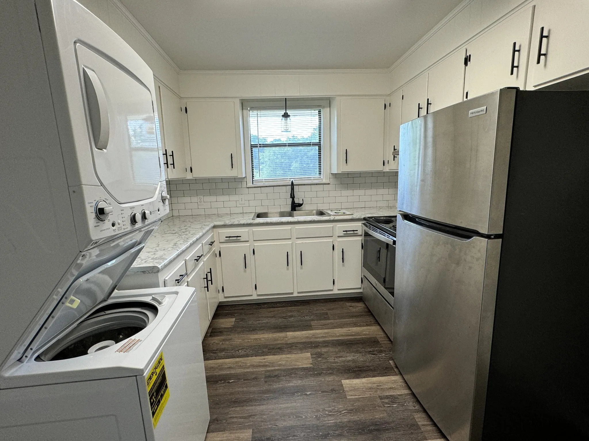 Triplex with a lake view! Upper-level unit – 2 bedroom/1 bath 775 sq ft. new appliances and renovated kitchen, new tub/shower, all new bathroom vanities and hardware, and refinished original hardwood flooring throughout (new LVP in kitchen and bathroom). All utilities (electric, water/sewer, trash) can be included in the rent for an additional $230/month. Stack washer/dryer and lawn care included!! Private driveway. Security deposit = 1 month’s rent. Pets negotiable with pet fee and pet rent (breed and weight restrictions on dogs). You can fish in the tranquil “Pages Reservoir” behind the property. This home was built prior to 1978 and may contain lead-based paint. Please see attached LBP Disclosure and “Lead in your home” pamphlet. Available June 1st. 12-month lease.