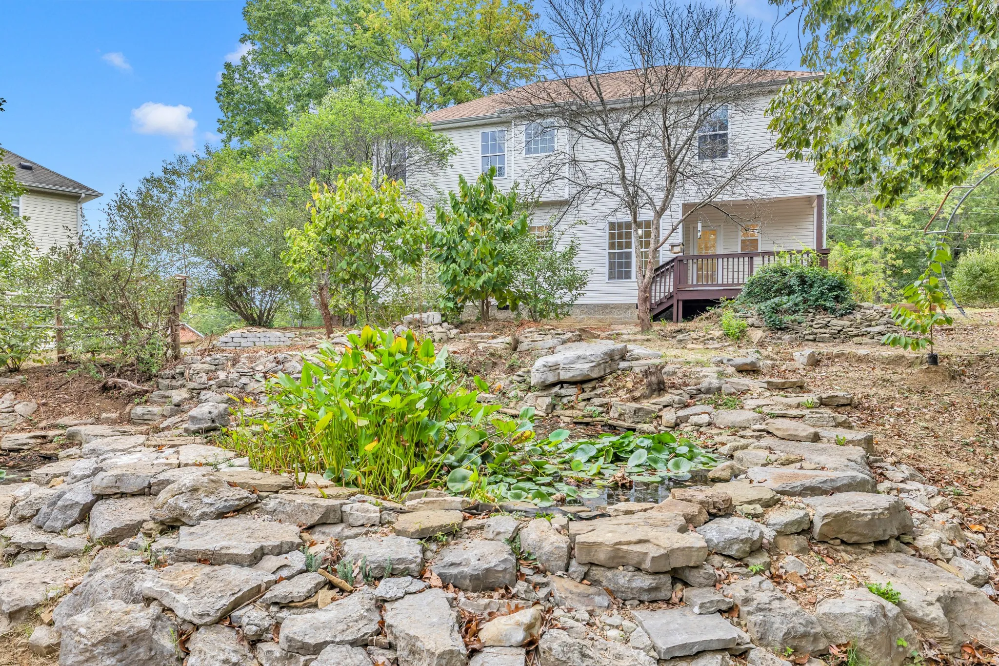 This home was built on two lots, so you have almost a half acre! Country living in the City!!! LOVELY 1,971, 3BR/2.5BTH home sitting on the highest point in Pebble Trail Villas. The open floor plan includes a living room with a gas fireplace for those rainy nights. Fresh paint, roomy bedrooms with hardwood laminate, an updated kitchen, NEW refrigerator, dishwasher, all enhance this well-thought-out home. Luxury vinyl tile in kitchen and master bathroom. Enjoy your coffee on your covered deck with vistas of your personal ponds, fruit trees (Jujubes, PawPaws, Apples, and more), raised garden beds, and GORGEOUS sunsets! Step out onto your lovely front porch to catch the sunrise. Your backyard backs to a forested greenbelt for added privacy and exploring! Minutes to outlet shopping, restaurants, freeway, AND airport. Don’t miss out on this special home!